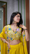 The blouse is crafted in pure silk, exquisitely adorned with intricate handwork and artistic animal motifs, giving it a playful yet regal character—perfect for a Haldi celebration that’s all about joy, tradition, and bold style.
