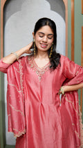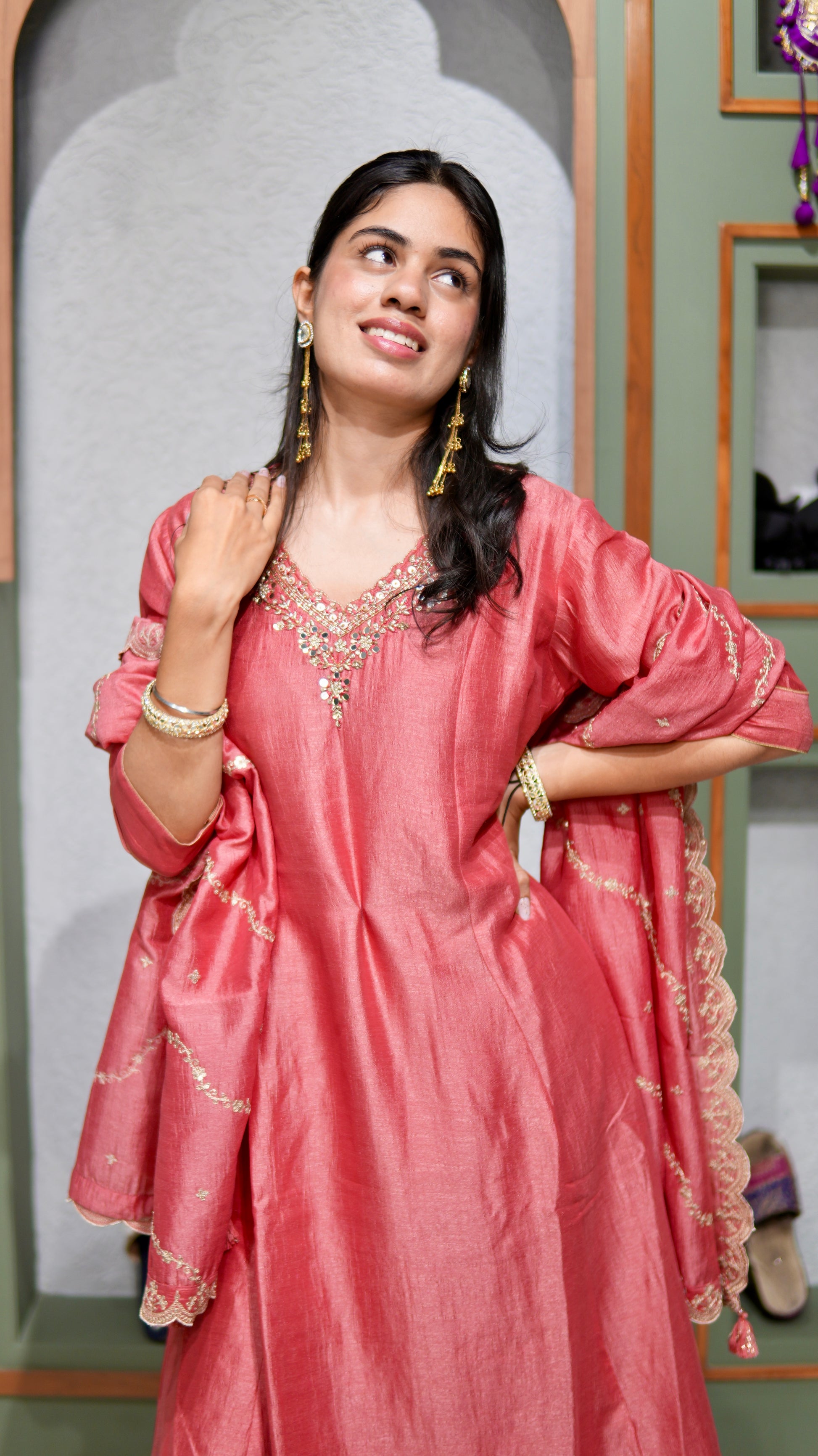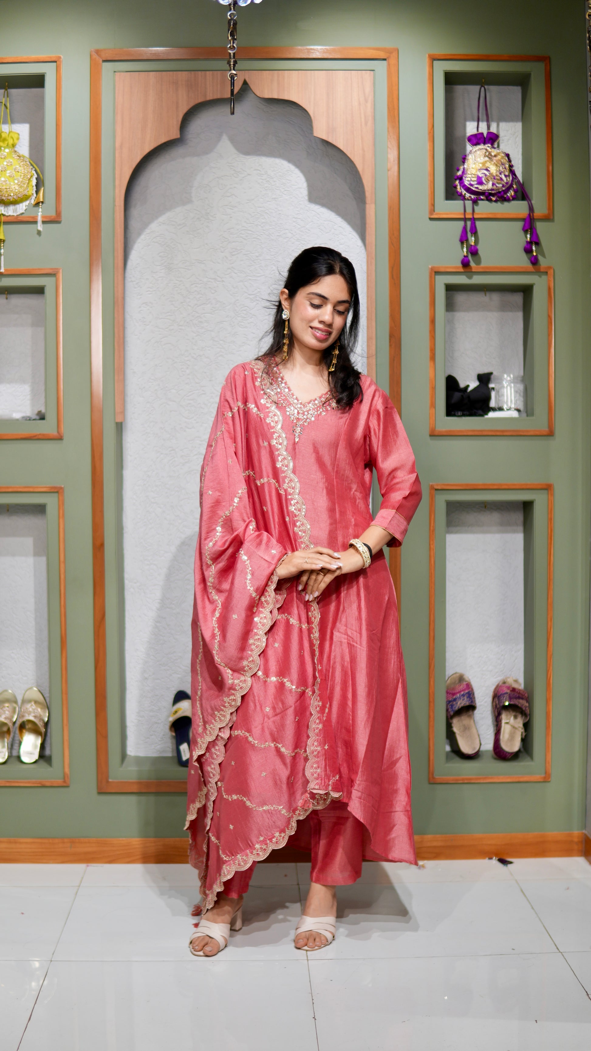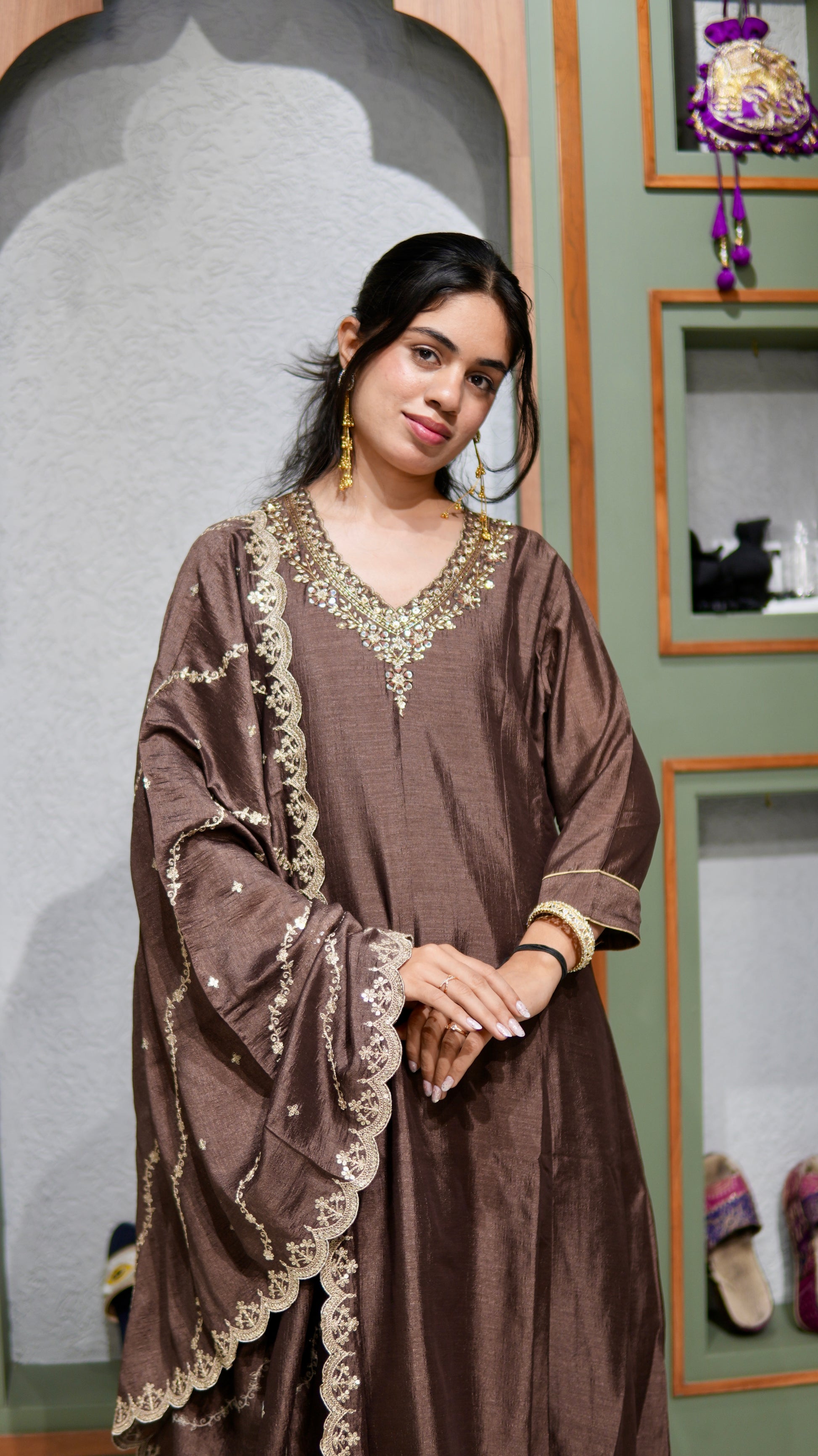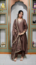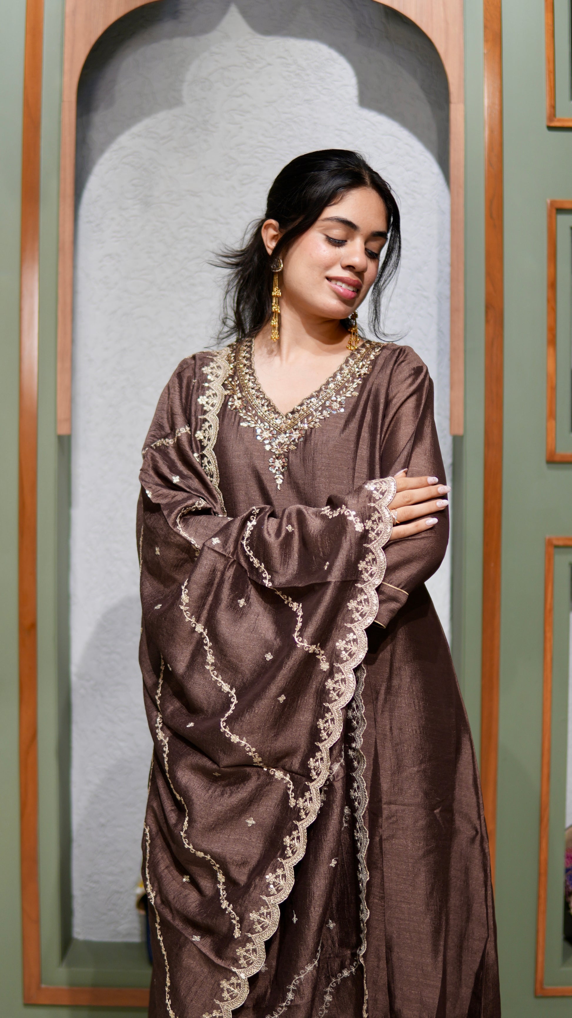 The kurta is crafted in a premium silk-based fabric that offers a soft natural sheen and fluid drape, allowing the outfit to move gracefully with every step. The design focuses on balanced elegance, where intricate handwork enhances the beauty of the garment without overpowering its minimal sophistication. The neckline is highlighted with detailed hand embroidery, carefully executed to bring depth, texture, and a touch of heritage artistry to the ensemble. The silhouette is thoughtfully tailored to provide a flattering fall while ensuring comfort for long hours of wear.