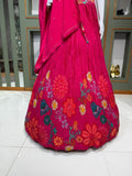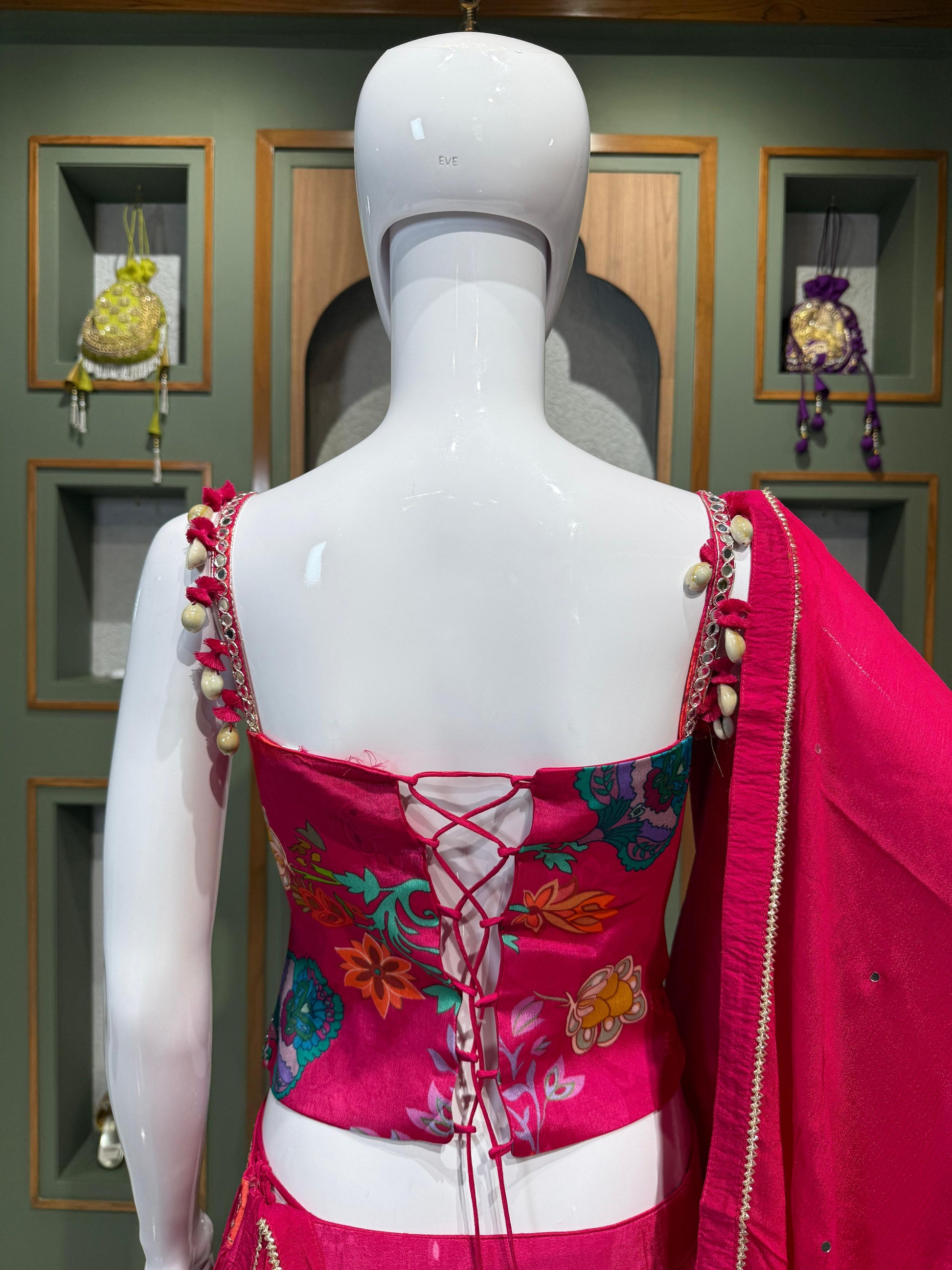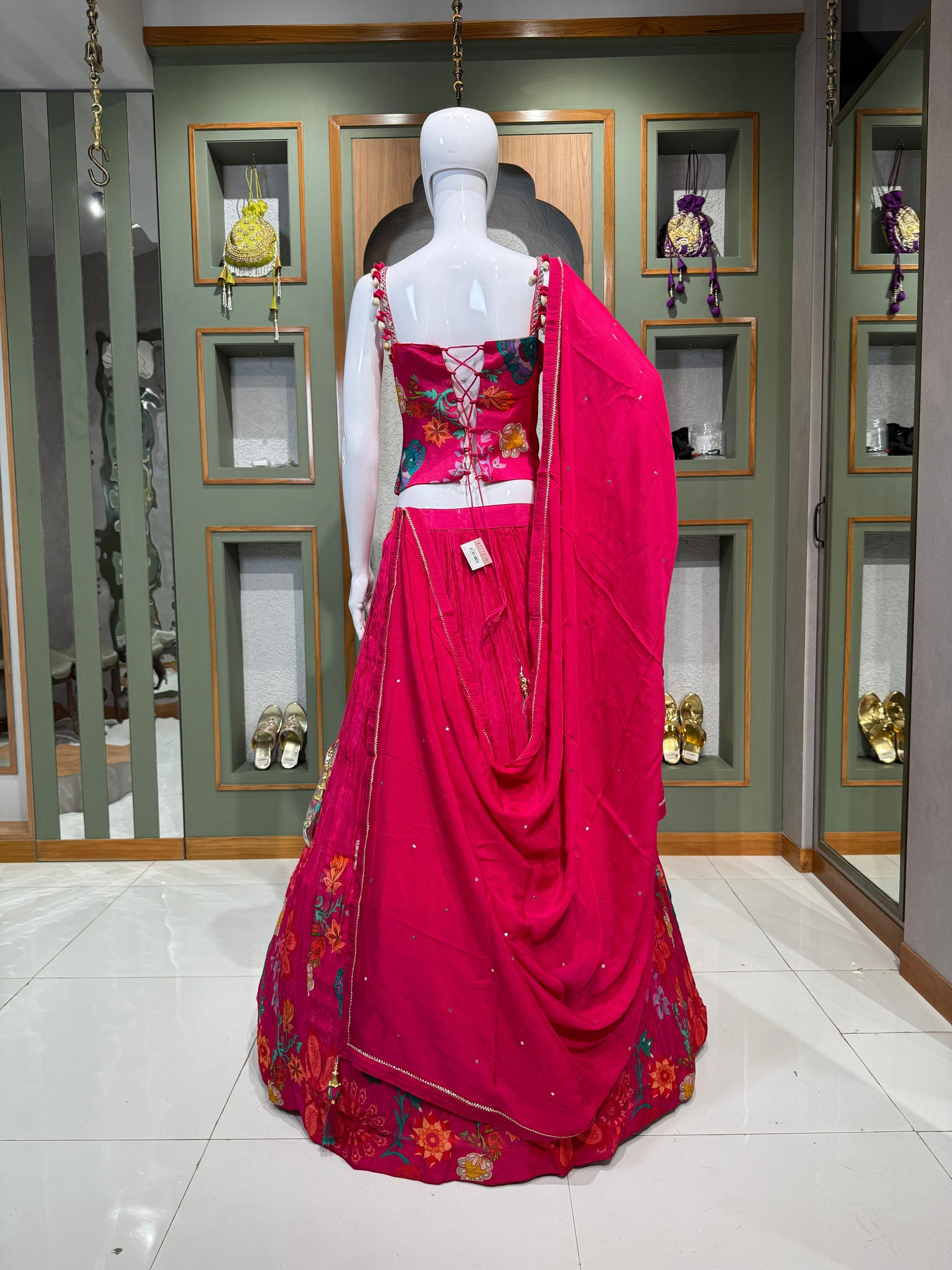 Completing the look is a designer dupatta, carefully curated to harmonize with the floral lehenga and codi work detailing. Draped gracefully, the dupatta adds softness and elegance, bringing the entire bridal ensemble together with refined sophistication.