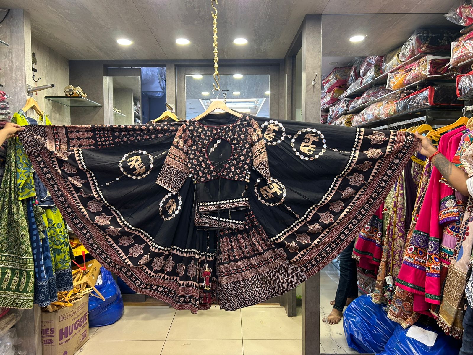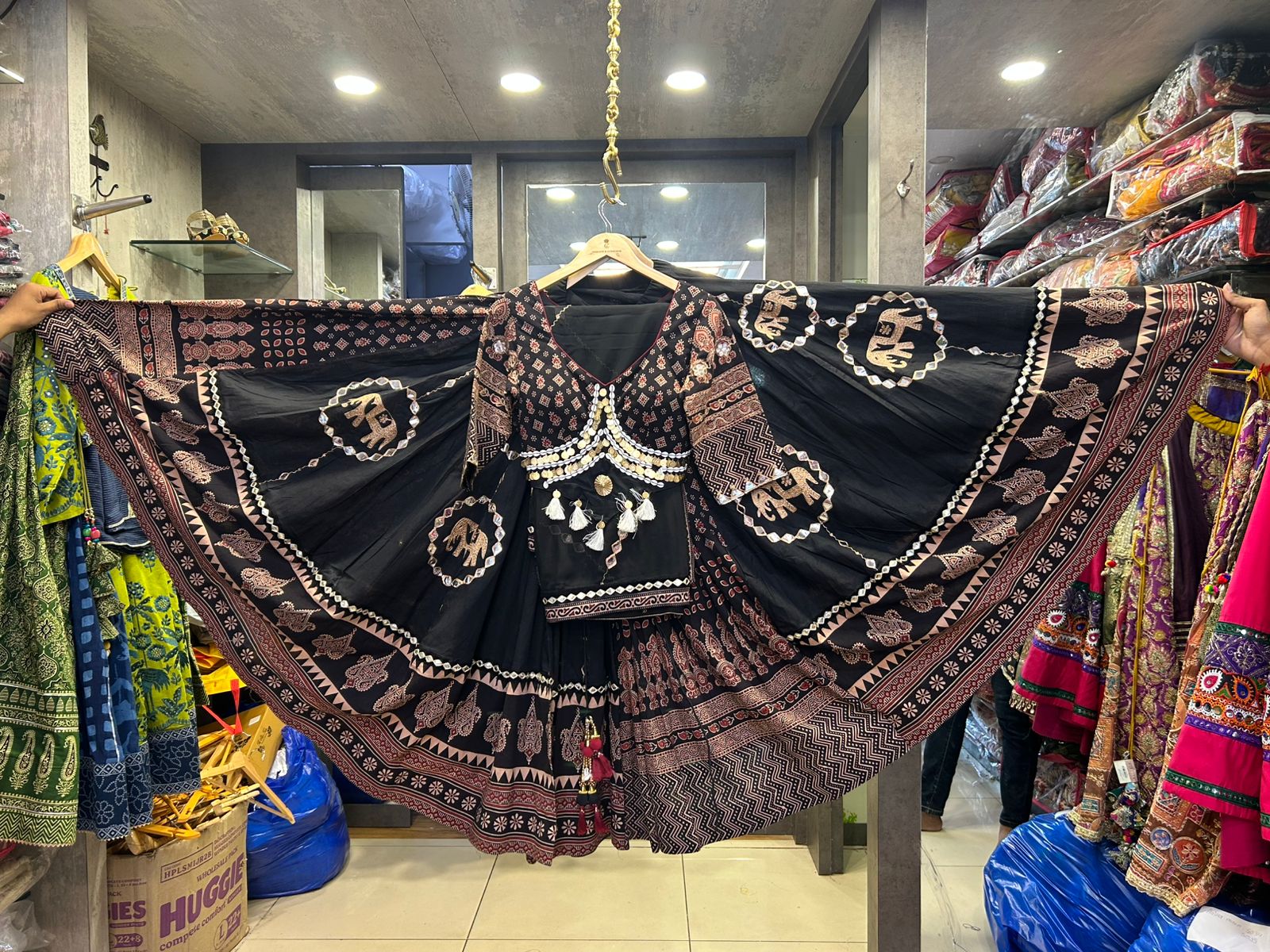 The cotton chaniya features a voluminous 12-meter flair, offering graceful movement and a striking silhouette. Lightweight yet full of character, it's perfect for twirls, spins, and endless dance sessions ā all without weighing you down.