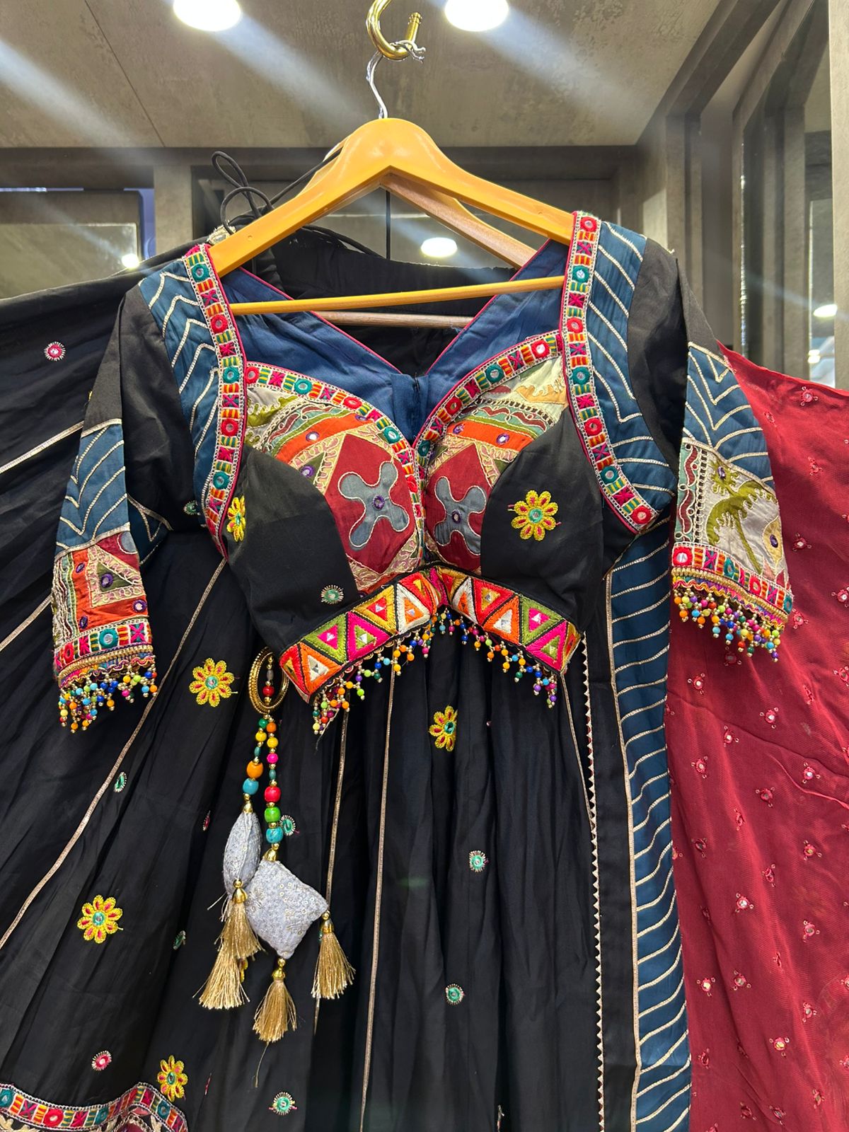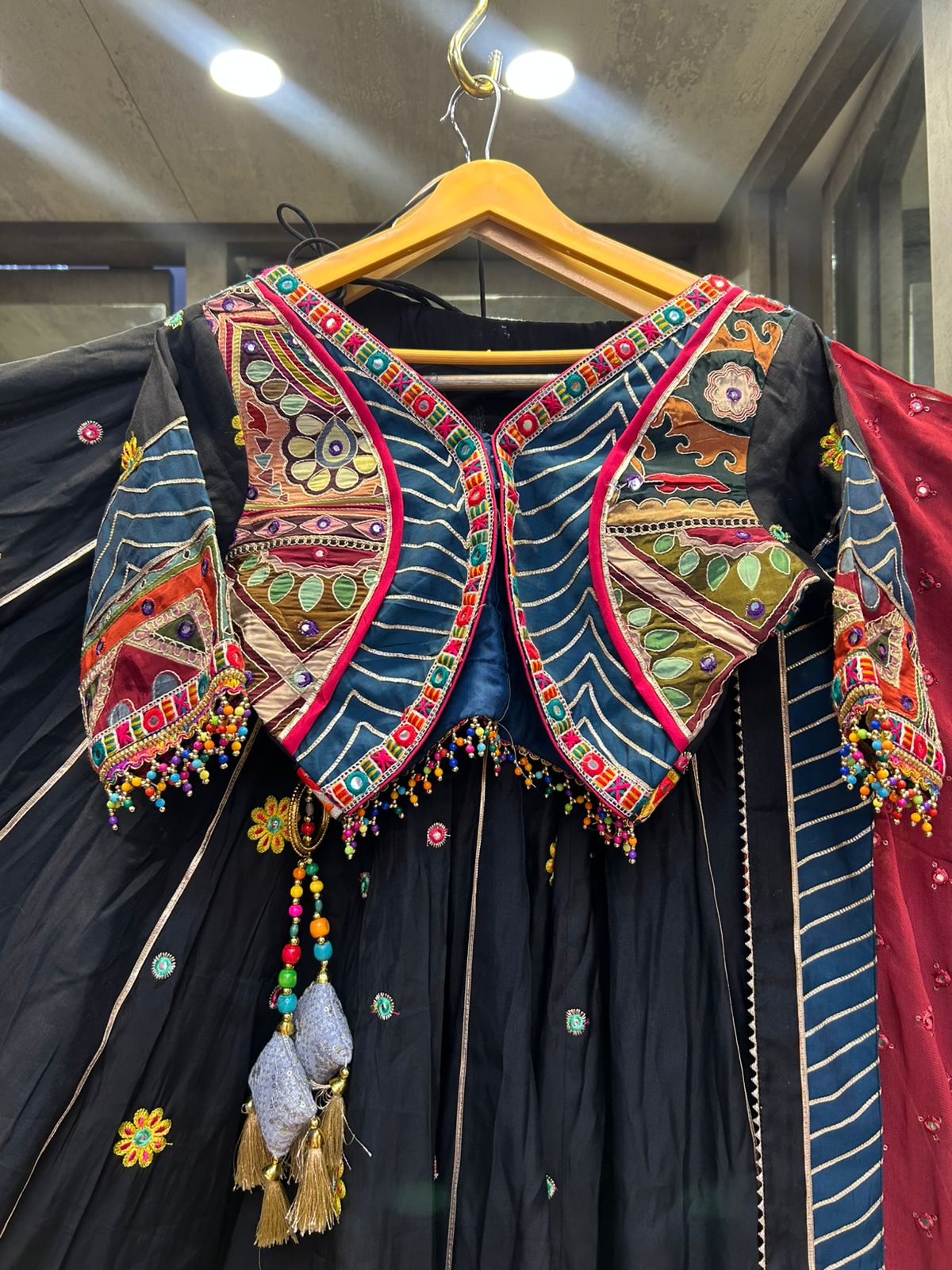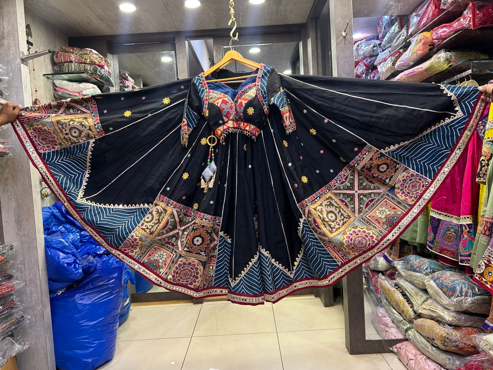 Crafted from premium Bombay silk, this chaniya is adorned with meticulous mirrorwork that catches the light beautifully. Its 12-meter flair ensures dramatic movement, making it perfect for traditional celebrations and festive dances. The fabric’s lustrous texture adds richness, while the intricate craftsmanship reflects timeless heritage.