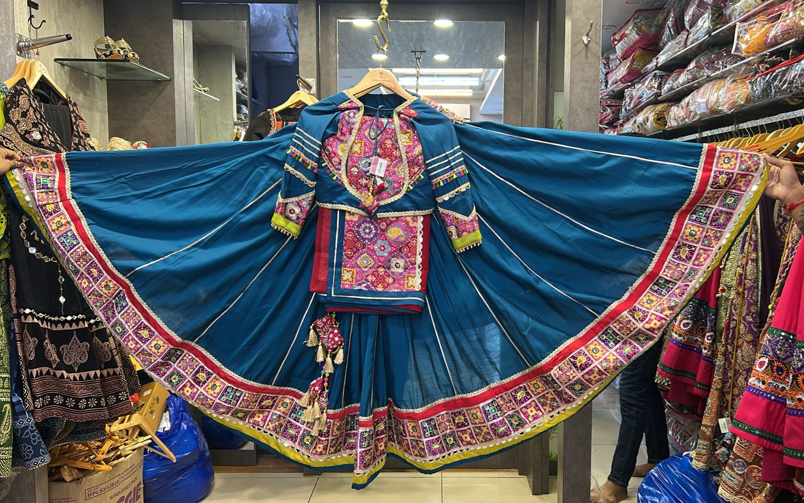 A perfect blend of tradition and modern elegance, “Royal Reflection” is a standout designer Chaniya Choli set from Kalpanascreations, Sindhubhavan. With the richness of mirror work on Bombay silk, the earthy charm of kodi hand embroidery, and the timeless appeal of a vintage dupatta, this ensemble is designed to capture hearts and turn heads — whether you're dancing at Garba or gracing a festive event.