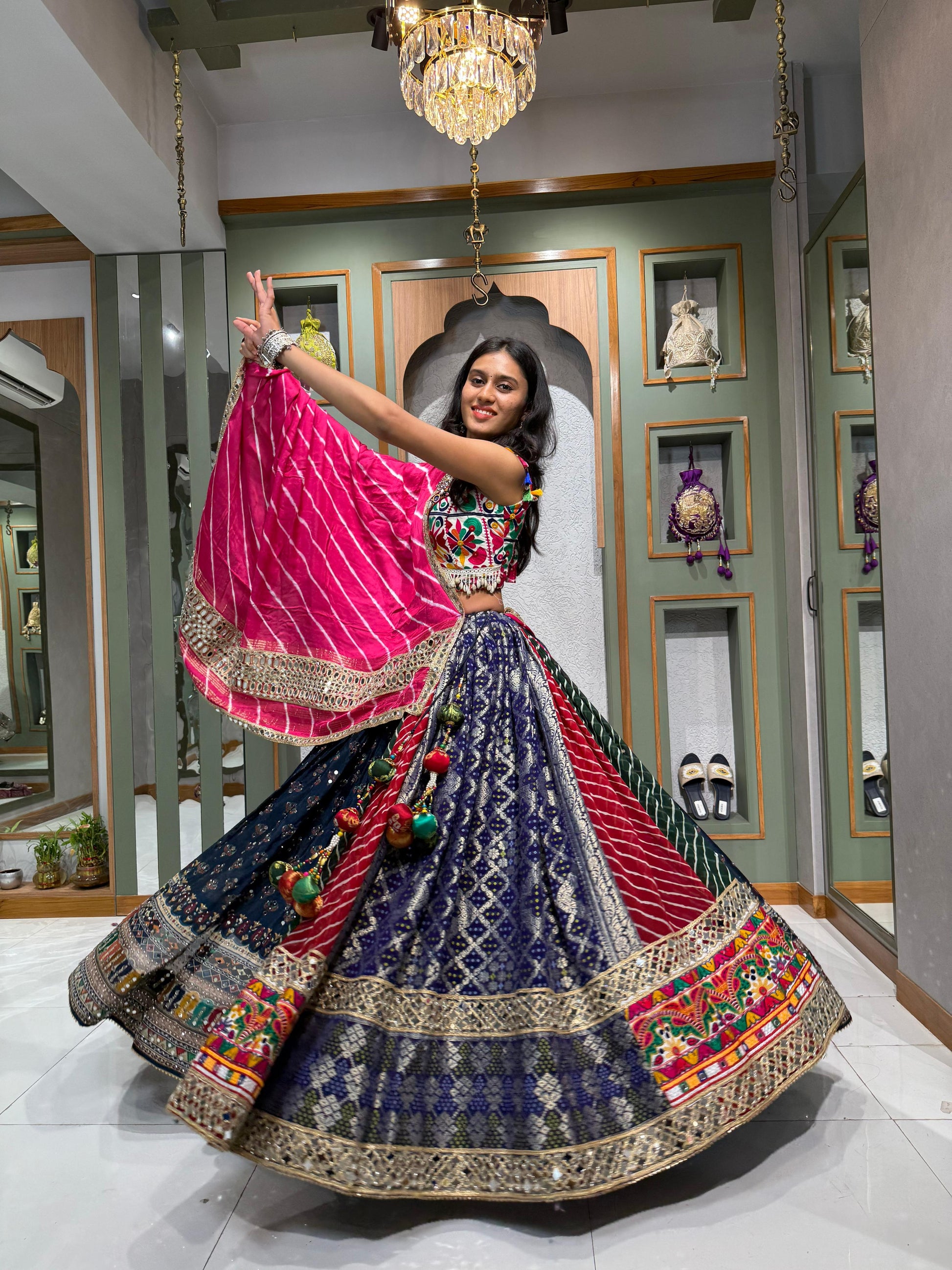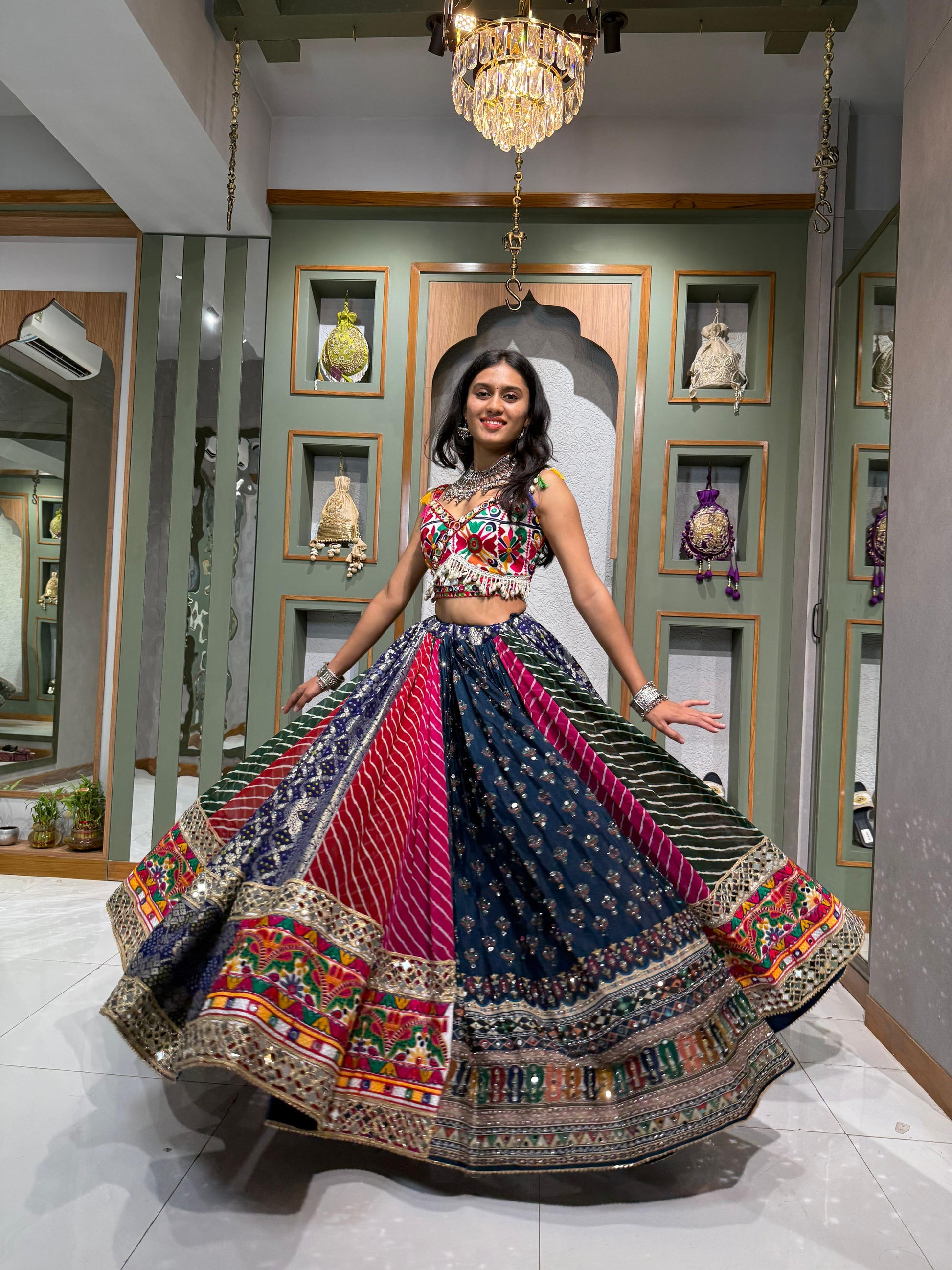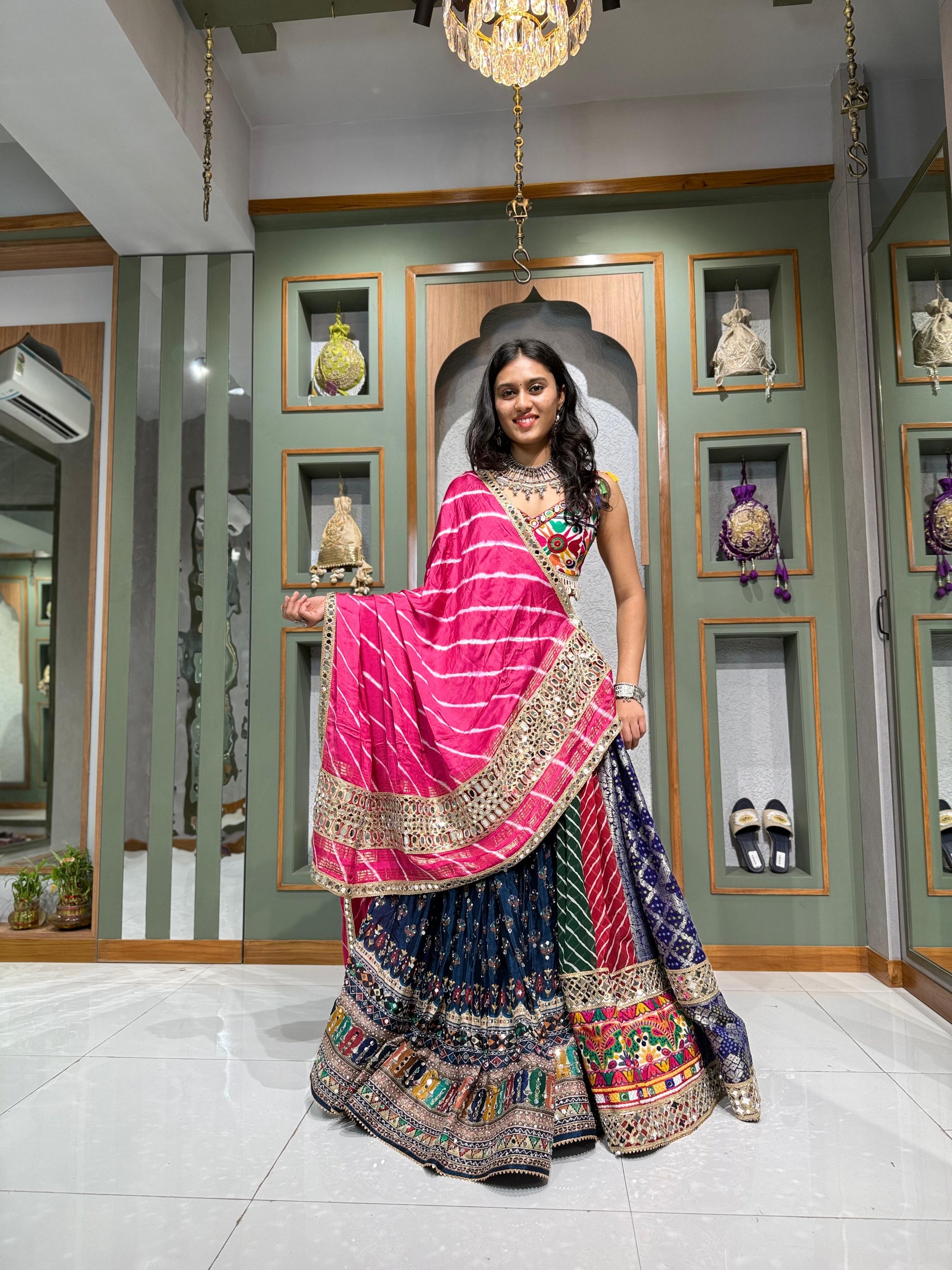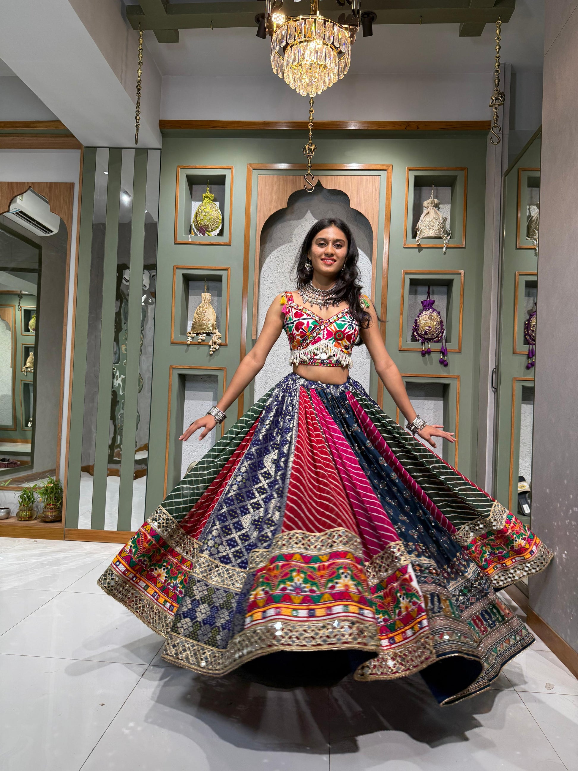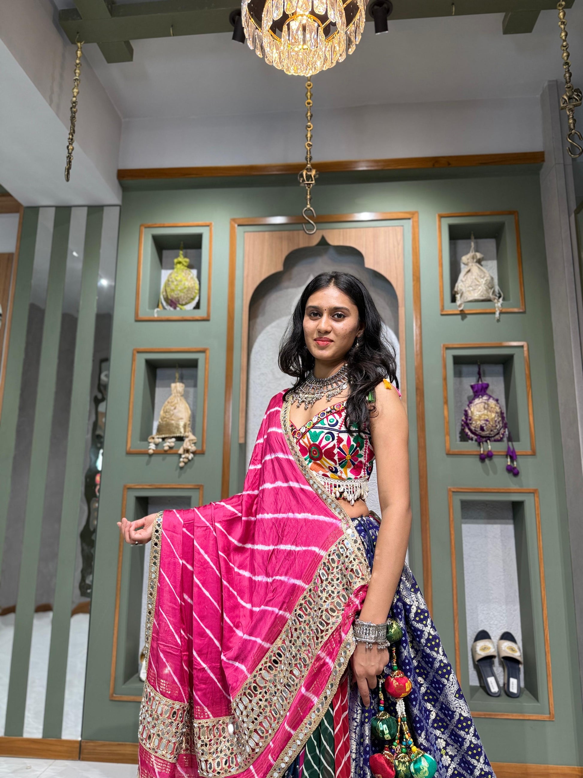 Multicolour Banarasi + Lehariya + Katchi + Mirror Work Chaniya (27-meter flair)