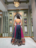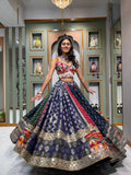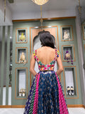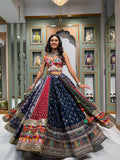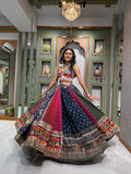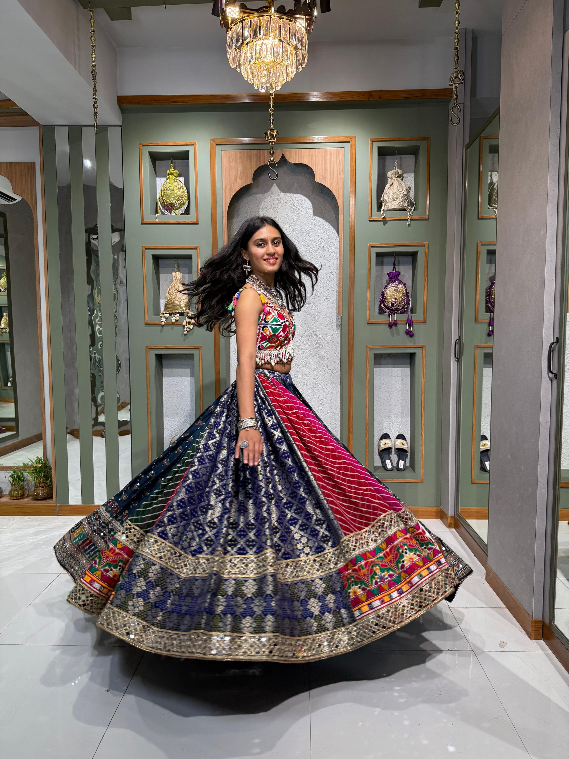 “Kaleidoscope Heritage” is a radiant expression of India’s artisanal heritage. This handcrafted designer chaniya choli features a stunning blend of Banarasi, Lehariya, Katchi patchwork, mirror embellishments, and hand-done kodi embroidery — creating an unforgettable mosaic of textures and colors. With 27 meters of multicolour kalis, the chaniya offers a majestic flair and rhythmic movement, making it a showstopper for festive nights, Navratri garbas, and heritage weddings.