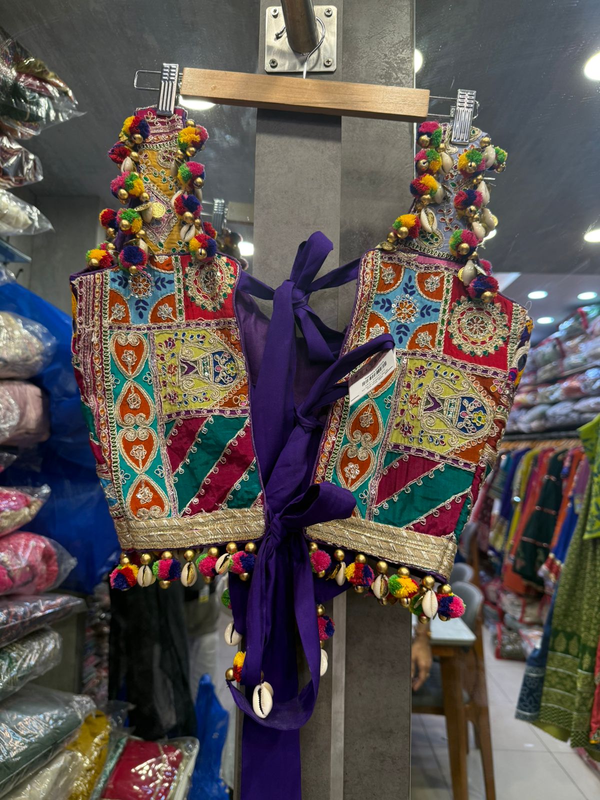 Elevate your traditional wardrobe with this exquisite handcrafted choli by Kalpana's Creation. Inspired by the rich cultural heritage of Gujarat, this blouse is a stunning showcase of Kutchi embroidery, mirror work, and colorful patchwork detailing.