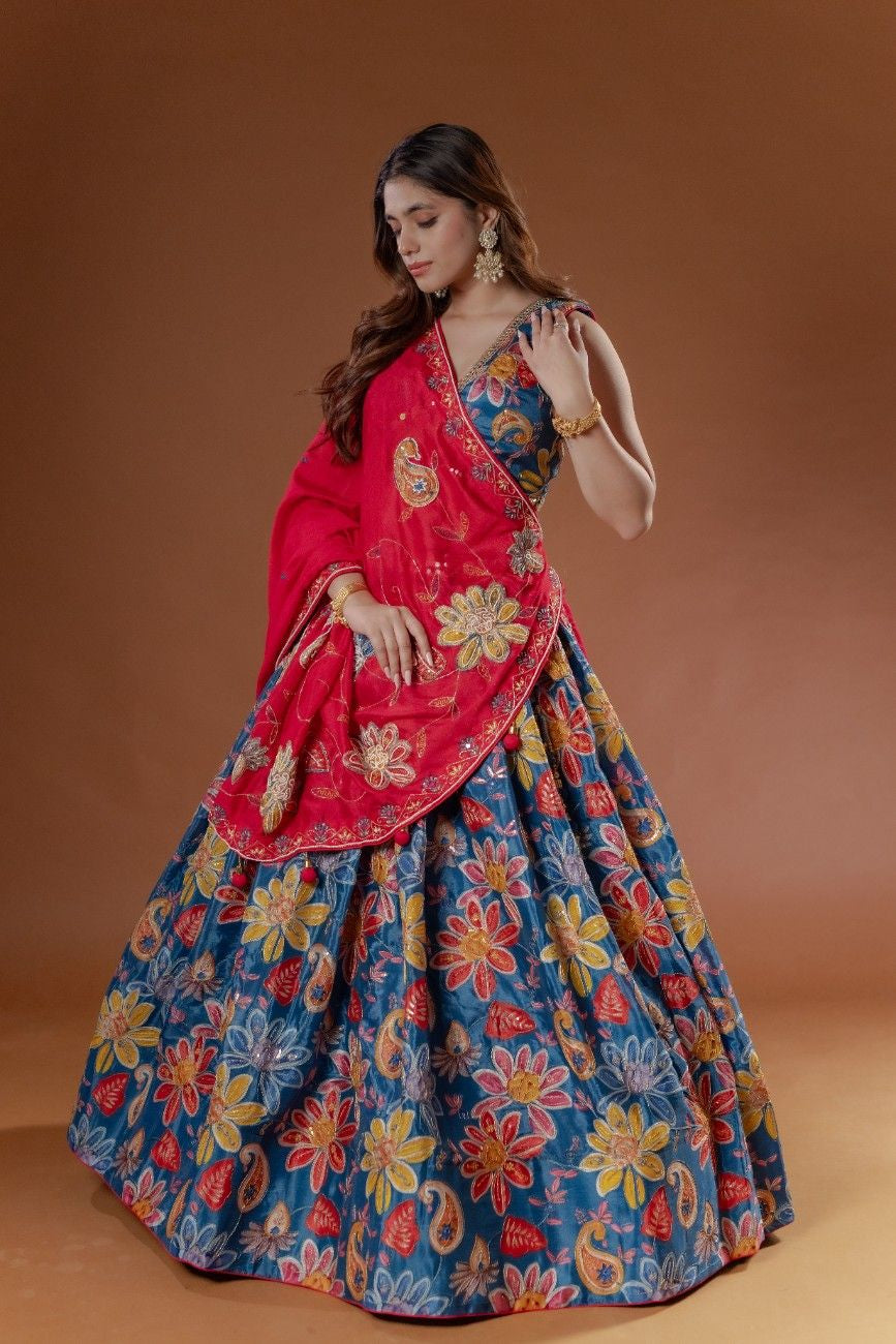 Designer Pure Silk–Based Ensemble with Flower Work & 5.5 Metre Flair