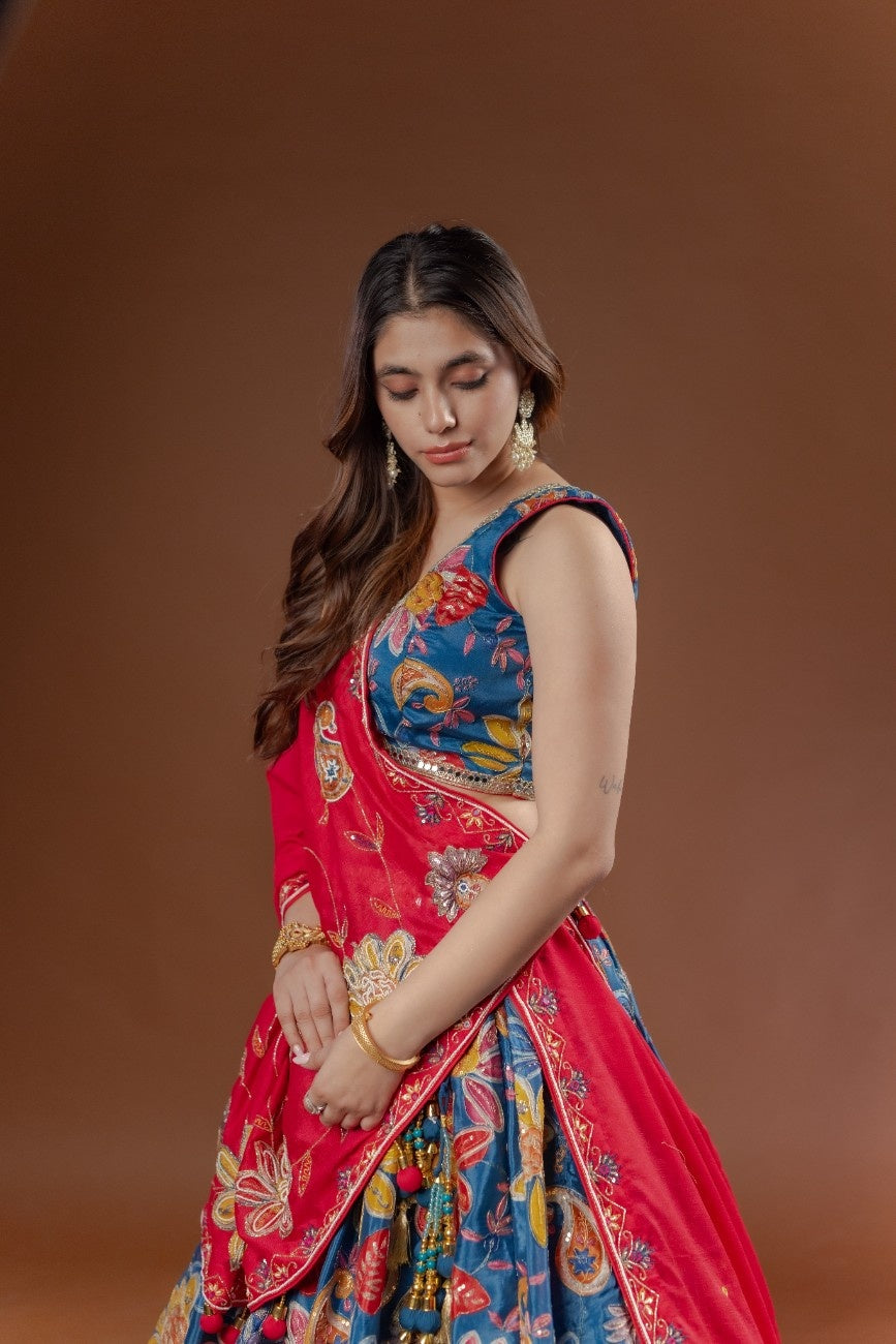 The outfit features a grand 5.5 metre flair, giving it a voluminous and majestic fall. The generous flair adds drama and movement, making it perfect for weddings, festive gatherings, garba nights, and special celebrations where elegance and impact matter.