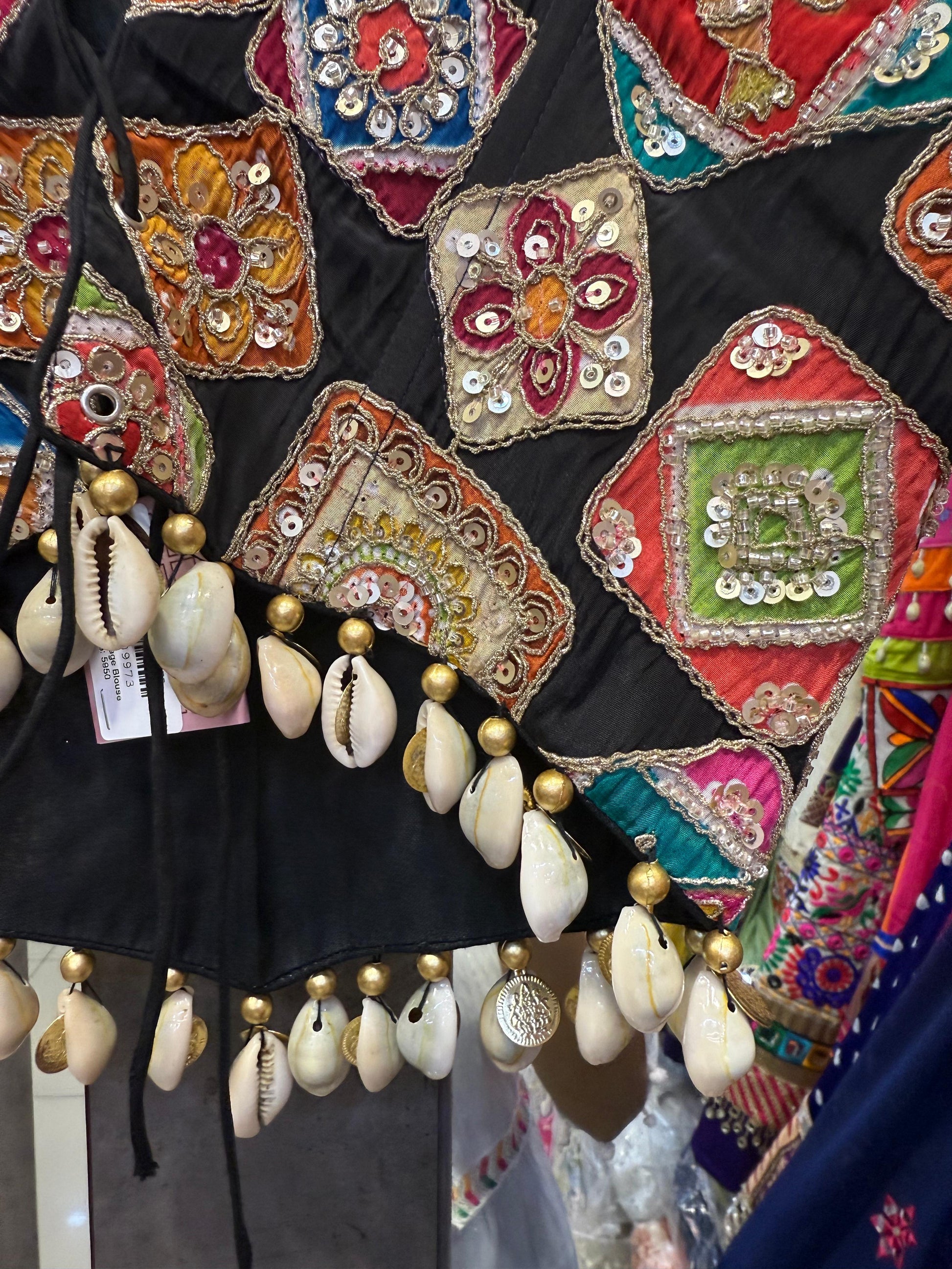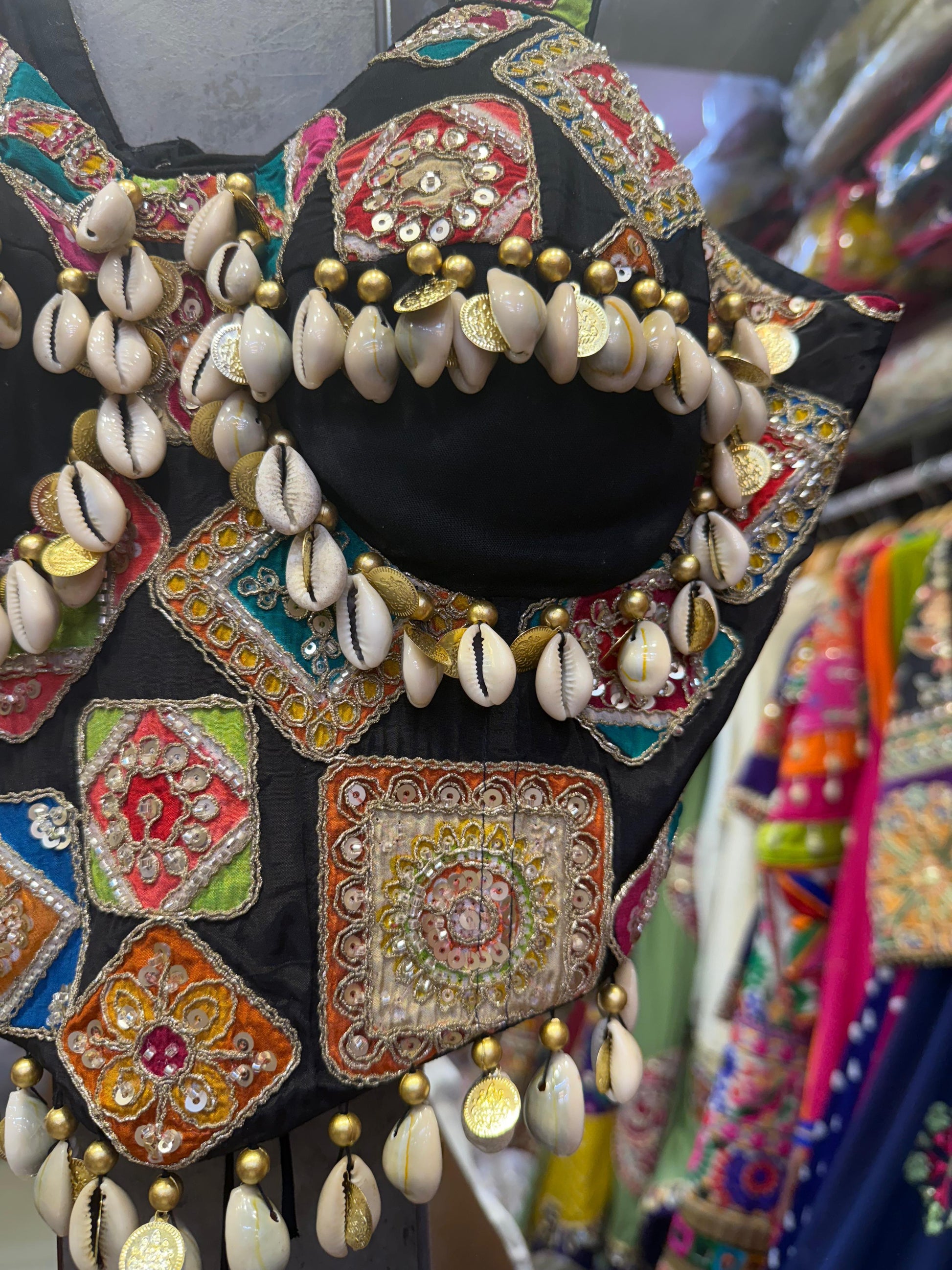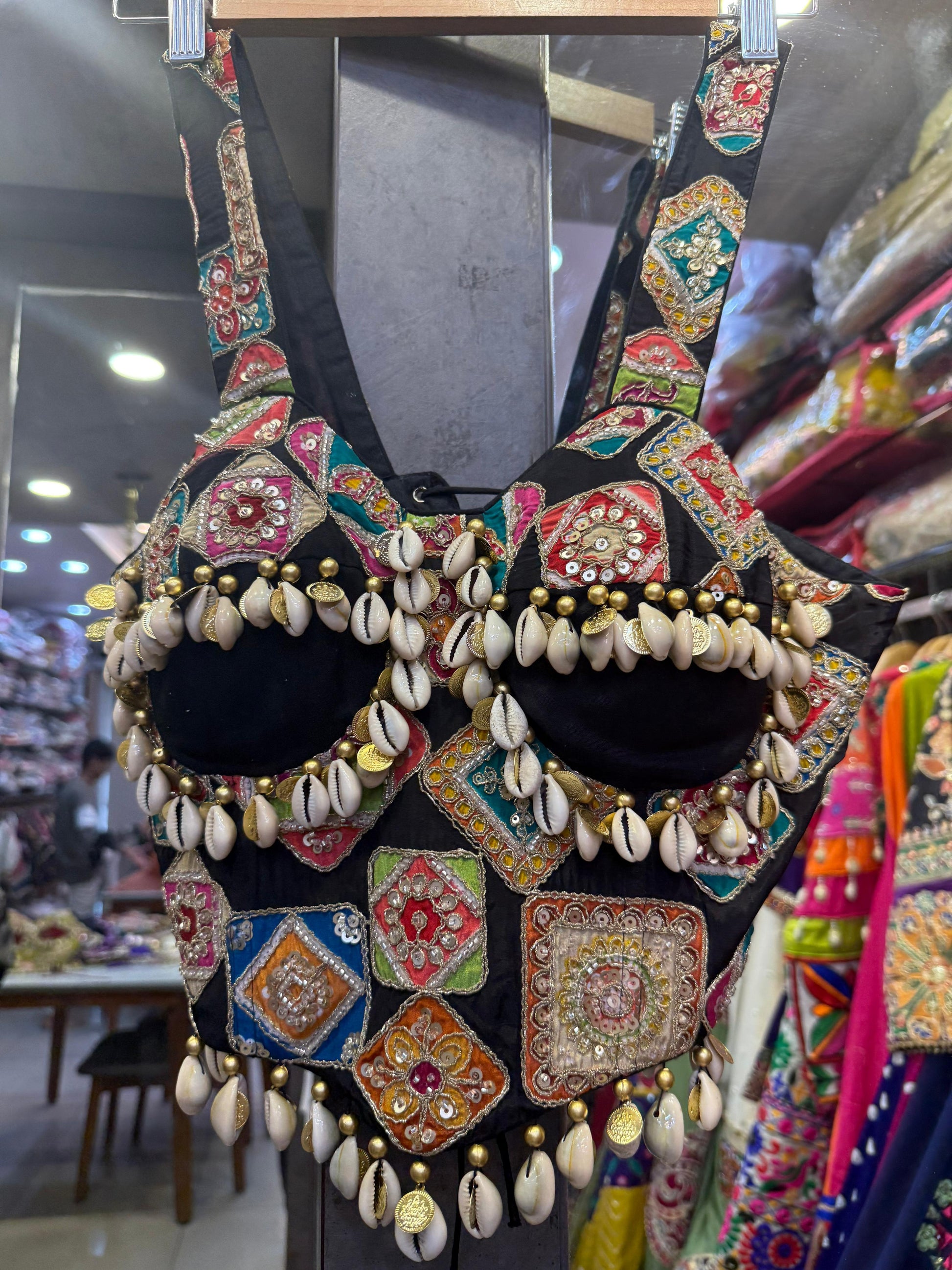 Decorated with real metal coin charms and cowrie shells that add movement, sound, and a true tribal flair to your look—perfect for Navratri, Garba nights, or cultural events.