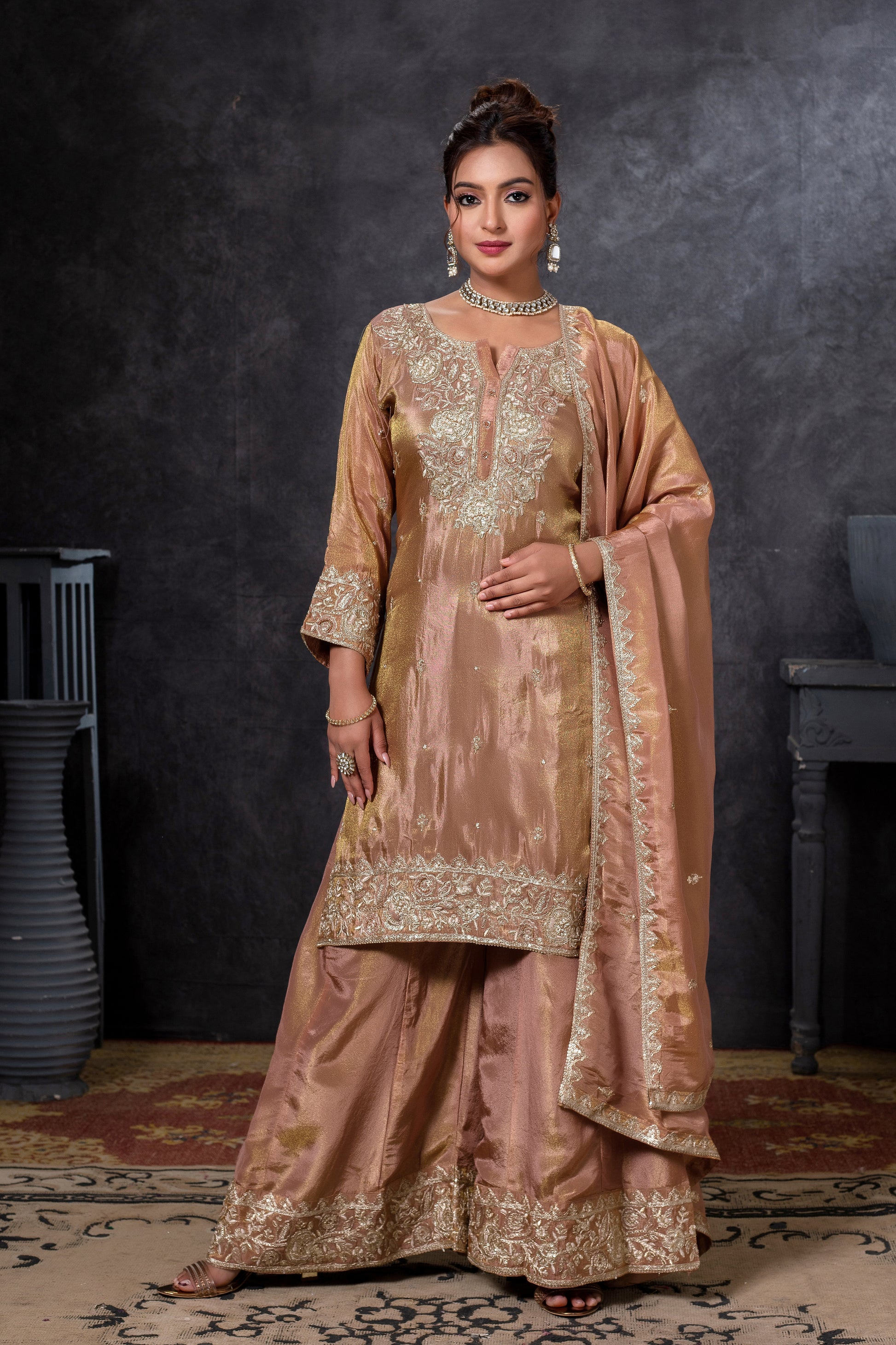 Designer Full-Sleeve Tissue Fabric Ensemble with Zardosi, Moti & Tikki Handwork
