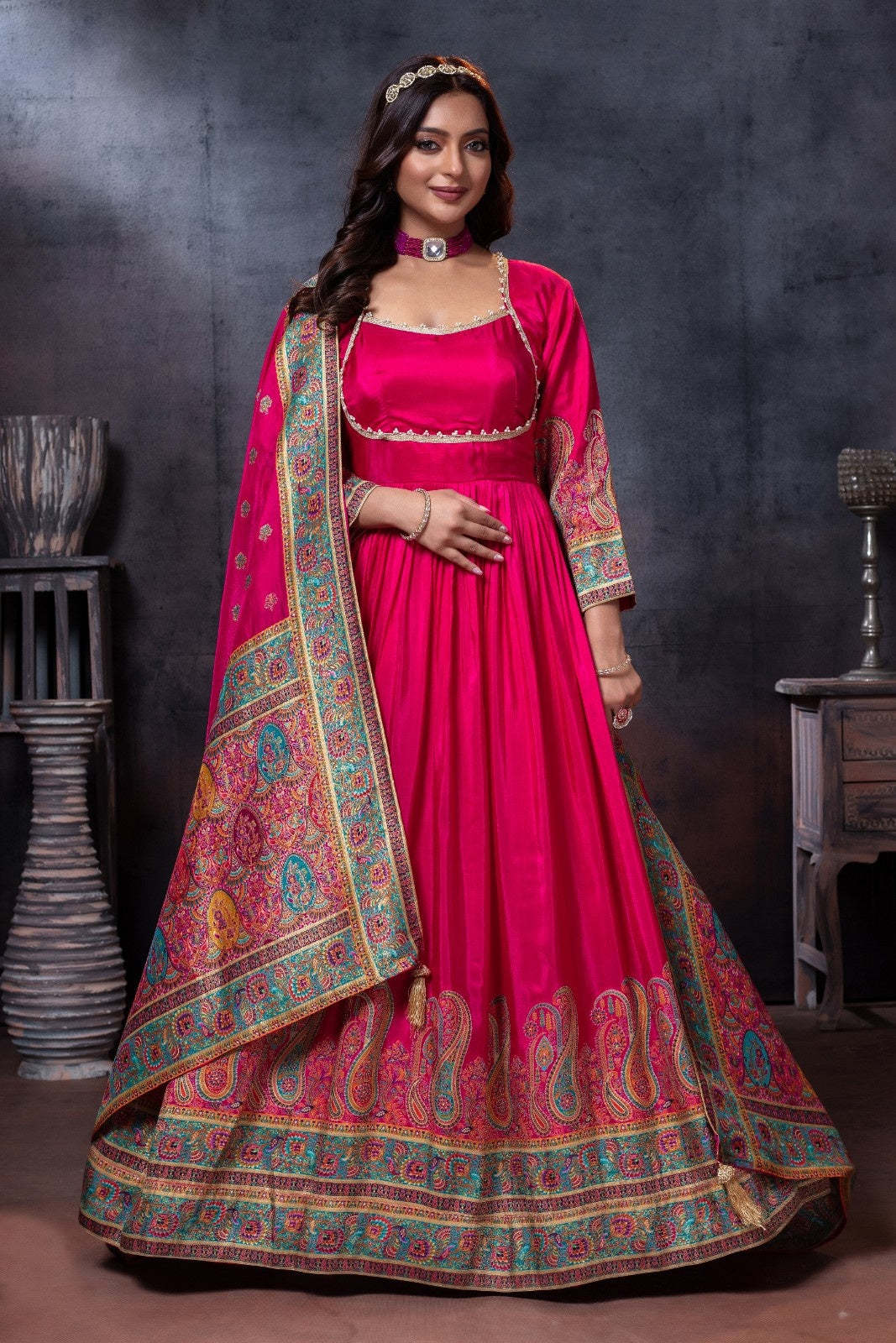 Adorned with an exquisite Pashmina-inspired print, the outfit reflects rich heritage motifs and artistic detailing. The intricate print lends depth and warmth to the design, creating a graceful and culturally rich appeal without being overpowering.