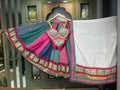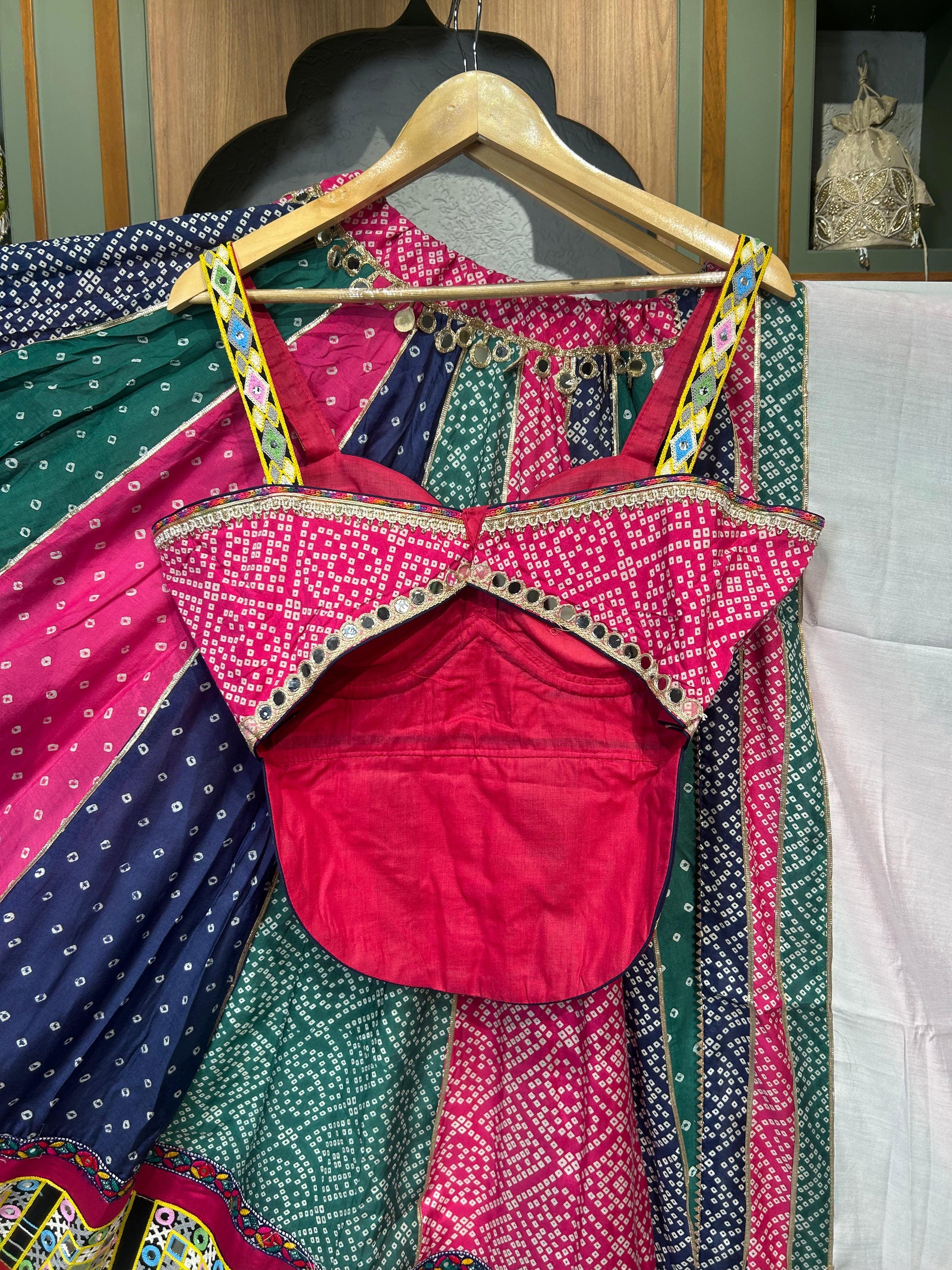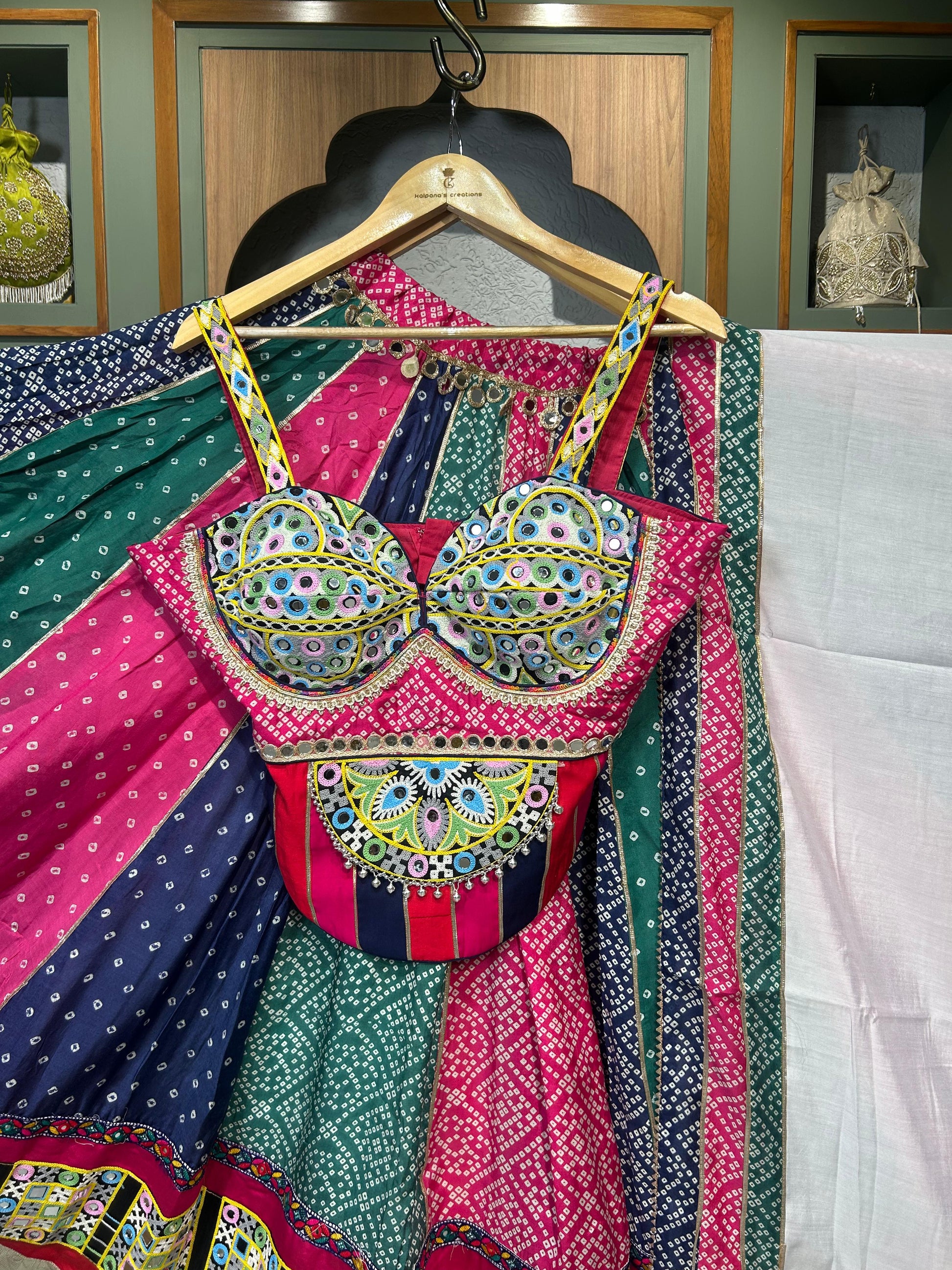 Step into heritage with contemporary poise in “Mirror Muse” by Kalpanascreations, Sindhubhavan — a breathtaking Chaniya Choli ensemble that fuses luxurious Bombay silk, handcrafted Kutch embroidery, and radiant mirror work. Designed with 12 meters of flare and finished with artisanal detailing, this outfit is a head-turner for Navratri, sangeet nights, or festive galas.