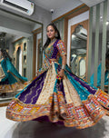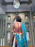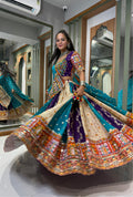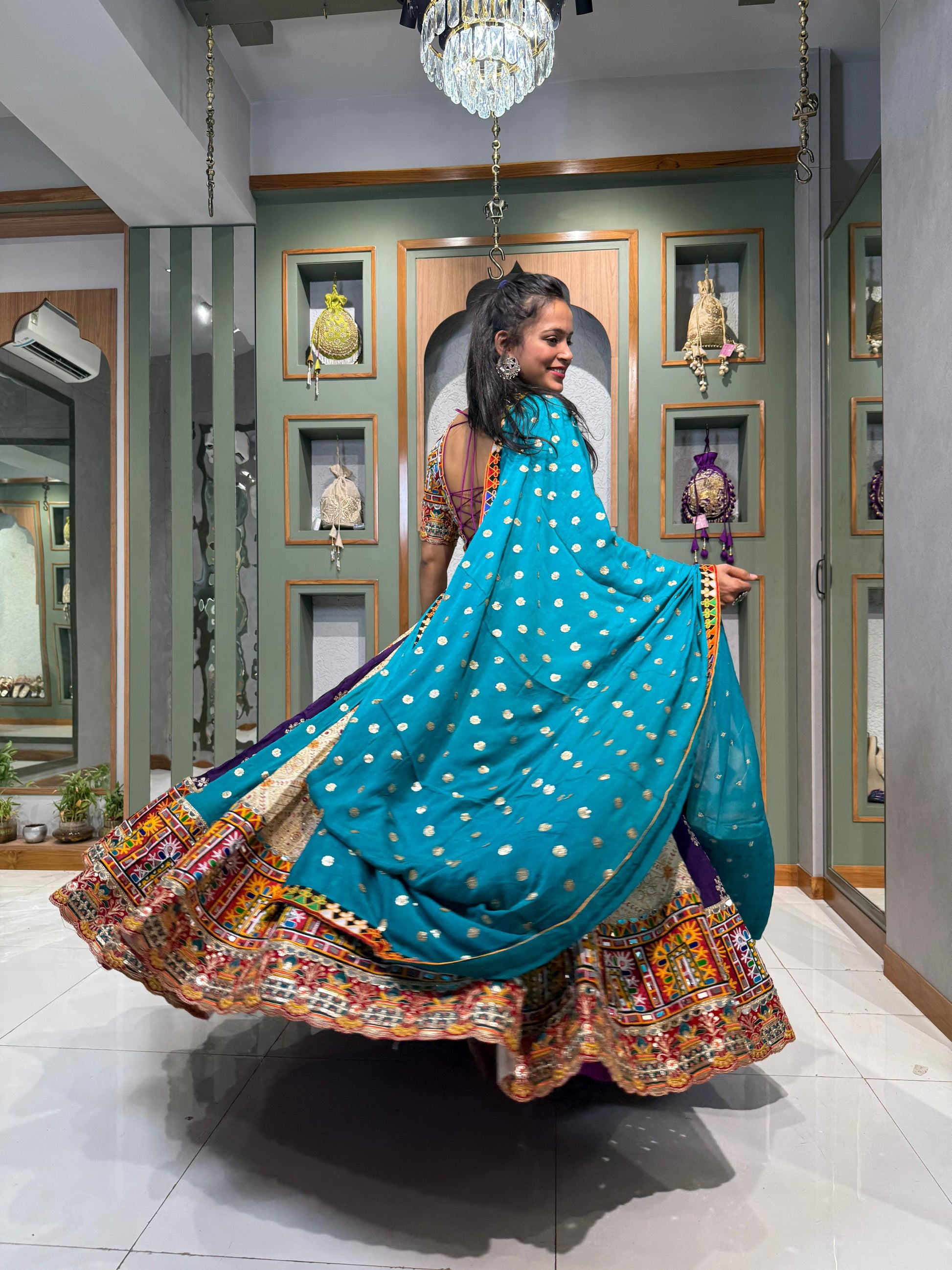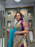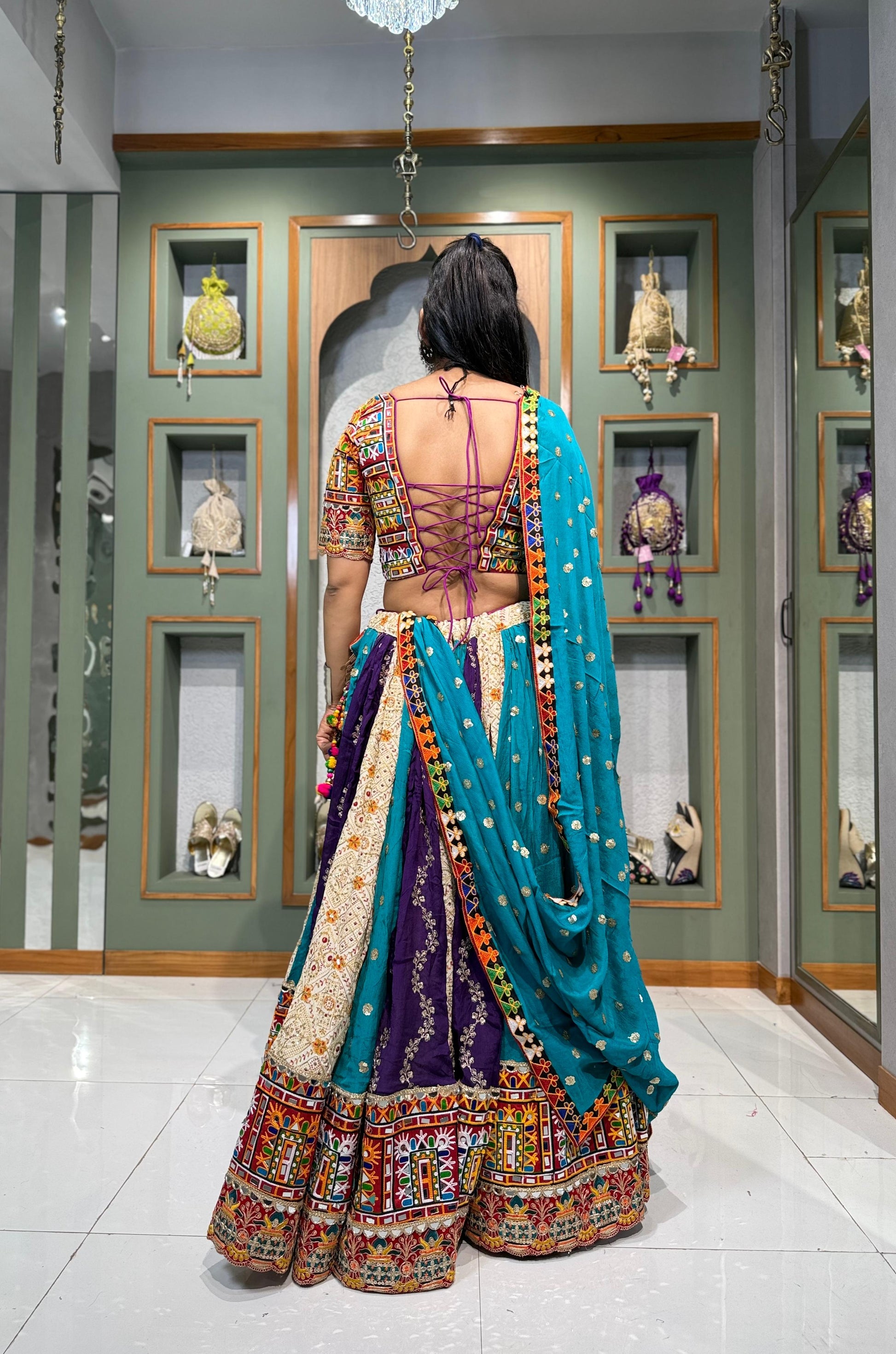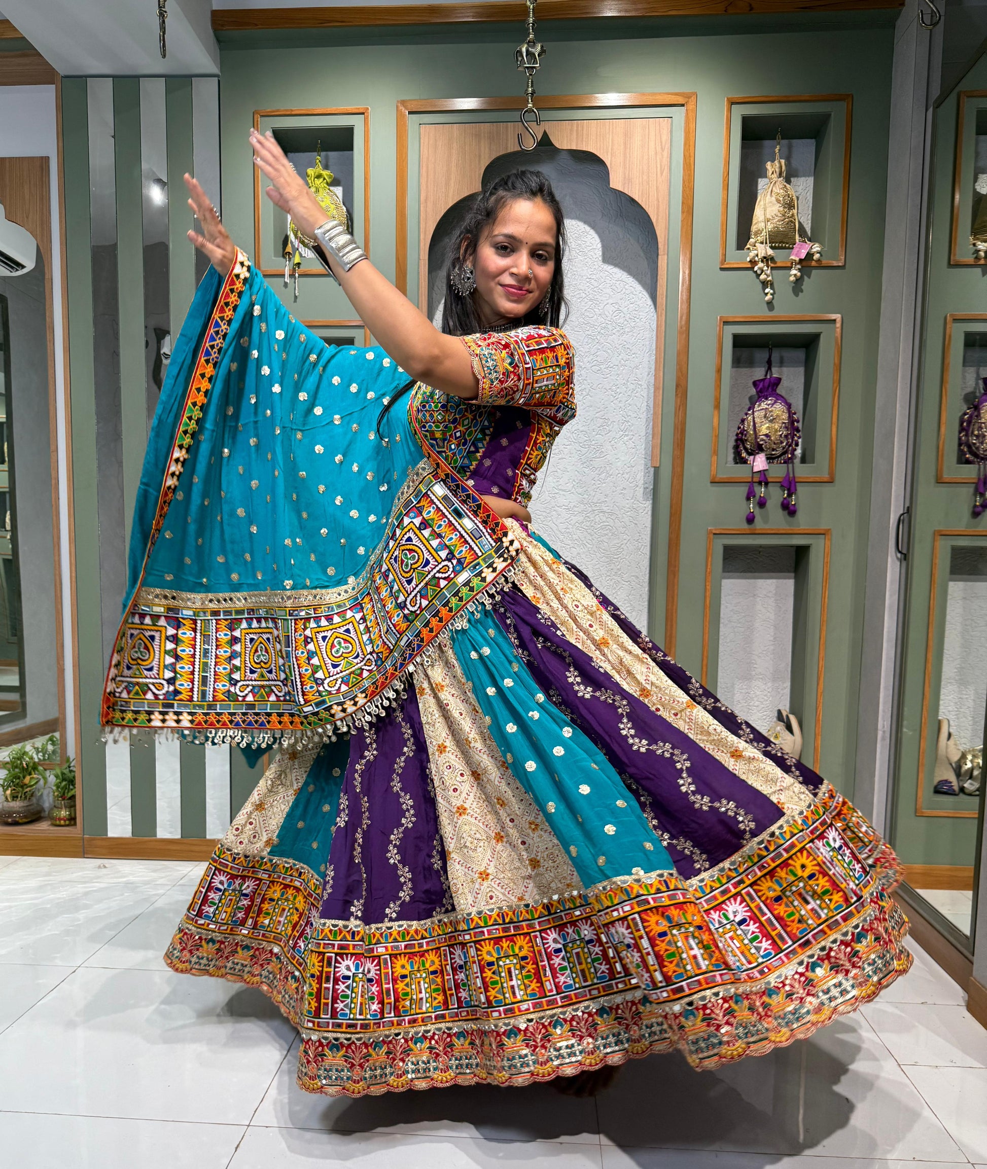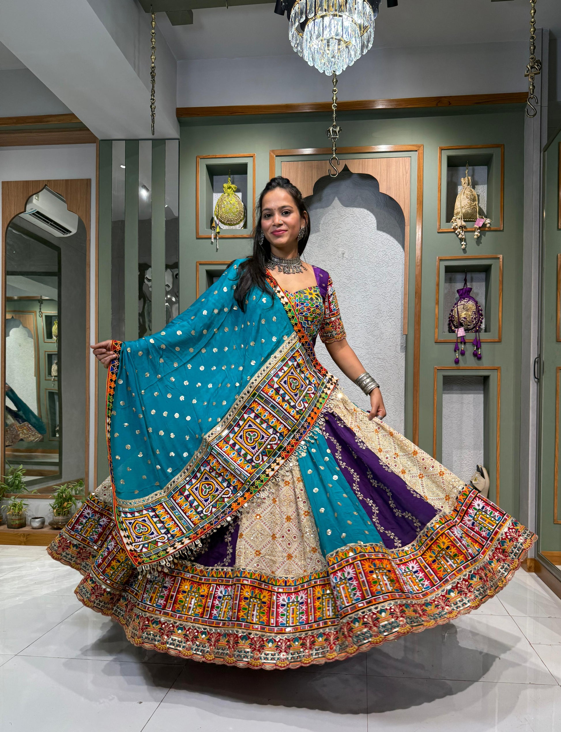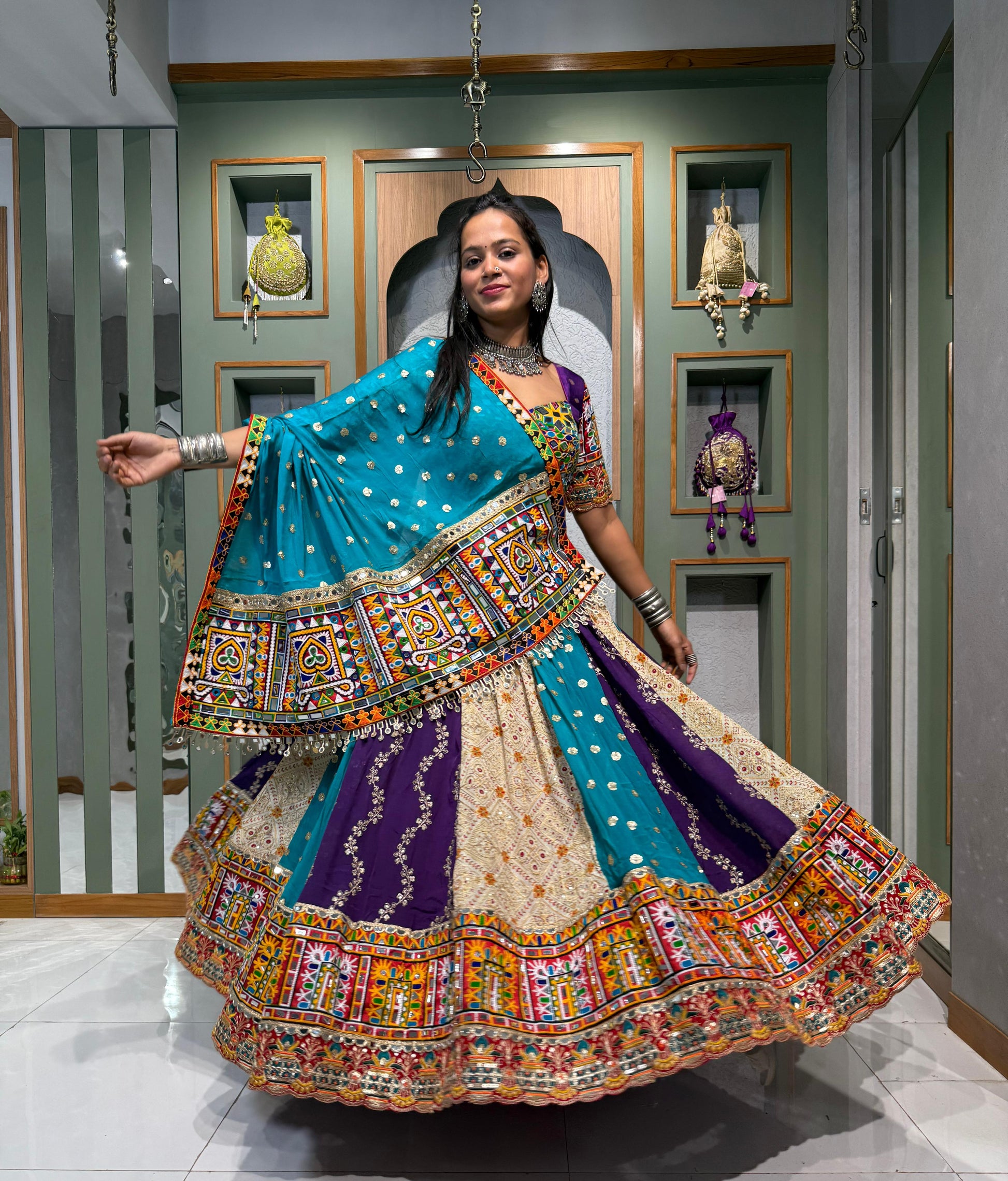 Unveil the art of heritage with “Folk Elegance” — a designer chaniya choli that blends traditional craft with modern sophistication. This masterpiece in flowing chinon boasts a dramatic 16-meter flair, radiating movement and grace. Adorned with multi-colored kalis in off-white, blue, and purple, and enhanced with Katchi mirror work and vintage hand detailing, this ensemble embodies timeless festive luxury.