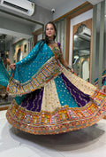The voluminous 16-meter flair chaniya creates a breathtaking silhouette, with every spin bringing the off-white, blue, and purple multi-kalis to life. Intricate Katchi mirror embroidery highlights the craftsmanship, making it a festive must-have.