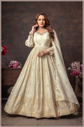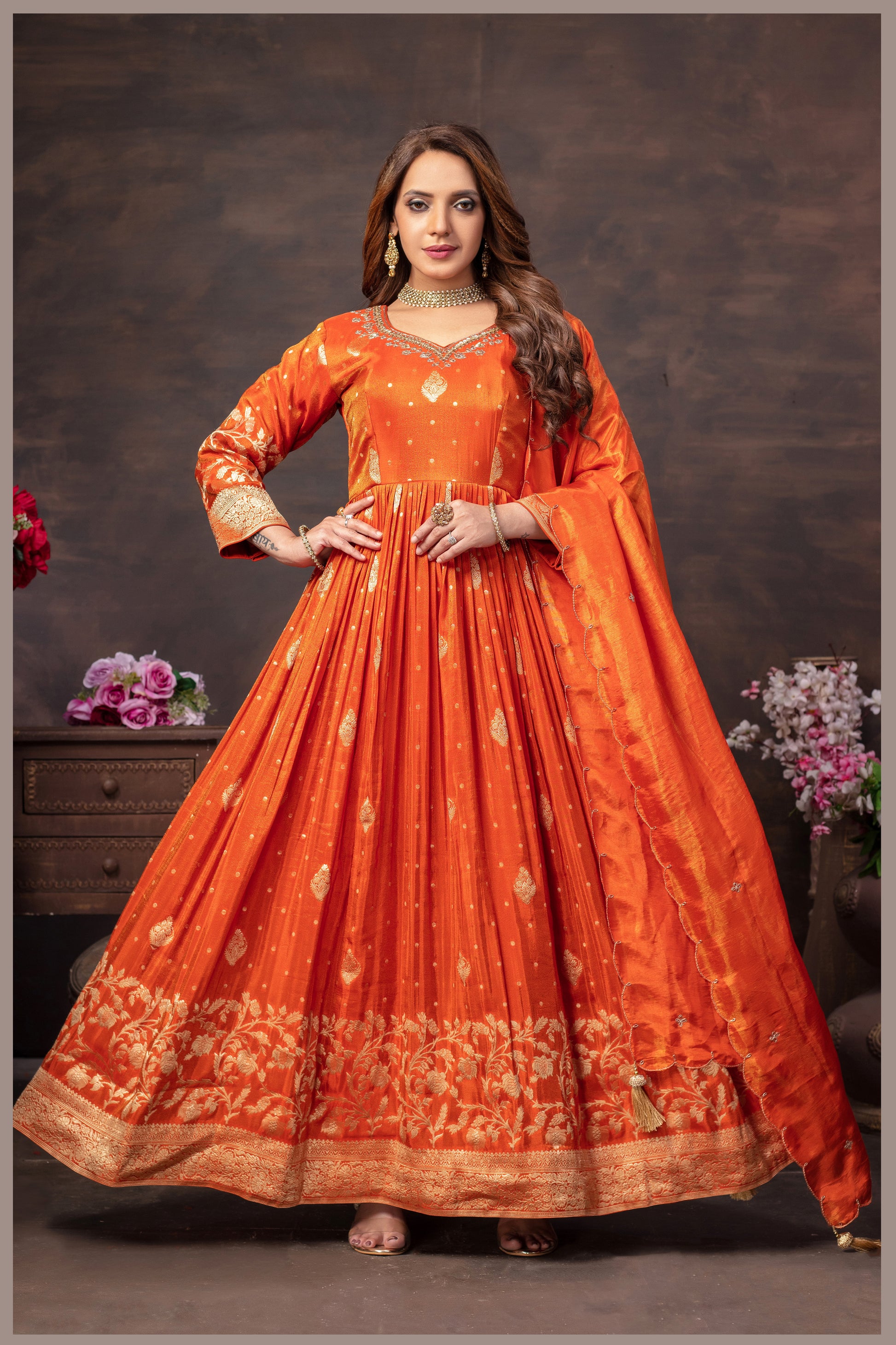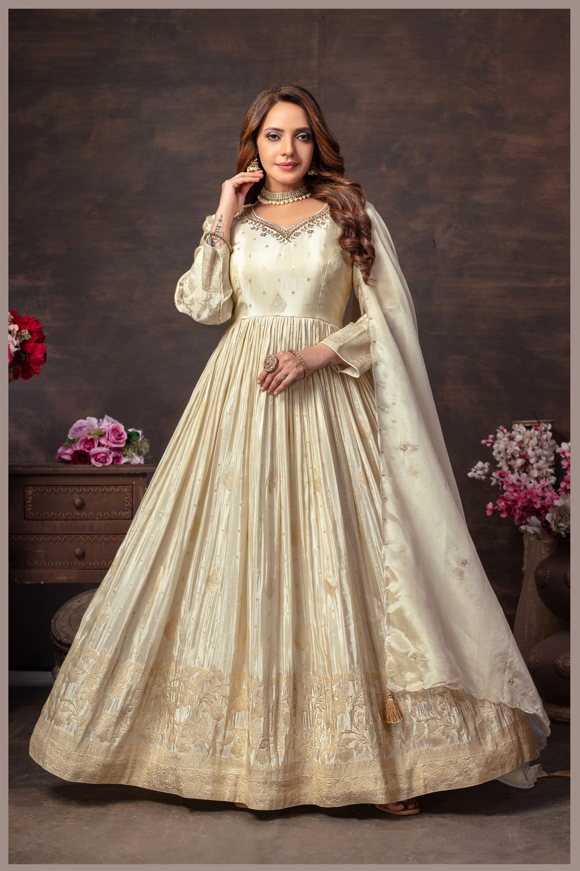 Crafted on a luxurious pure tissue base, this Anarkali radiates a soft, luminous sheen that feels light yet regal. The gown is beautifully enhanced with all-over Banarasi weaving patta, adding rich heritage detailing while maintaining a refined and elegant aesthetic. The flowing floor-length silhouette creates a graceful fall, making it a perfect choice for daytime and traditional ceremonies.