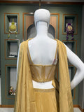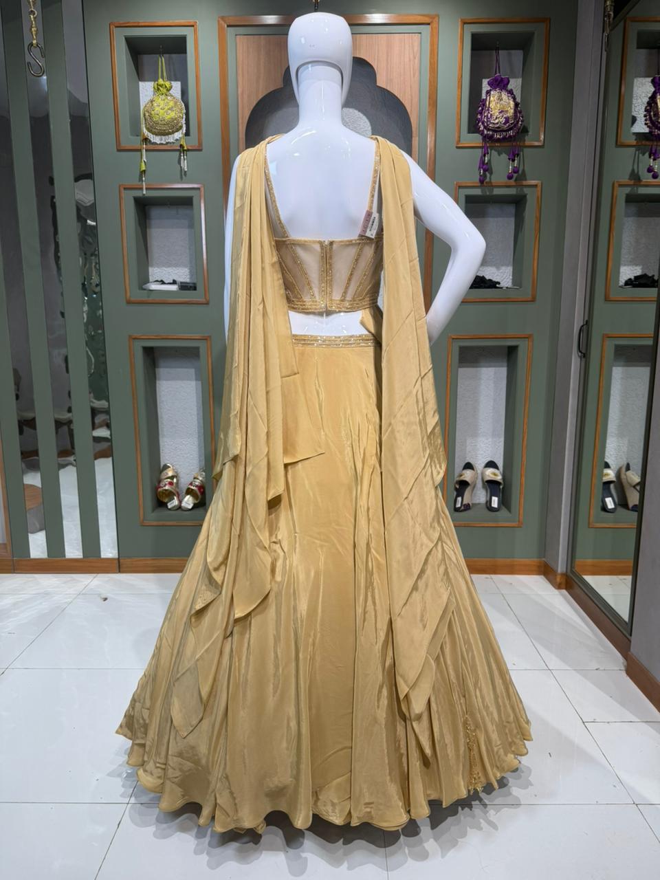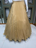 The lehenga is crafted in a luxurious gold-toned fabric that exudes royalty and glamour. Its rich texture and graceful volume create an elegant silhouette, while the premium finish ensures a flawless drape and movement. Designed to shine under festive lights, this lehenga captures attention with every step.
