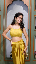 This modern festive ensemble features a pure modal silk pleated skirt, crafted to feel lightweight, flowy, and easy to carry through long ceremonies. The soft pleats create graceful movement, making it perfect for both rituals and celebration moments while maintaining a refined silhouette.