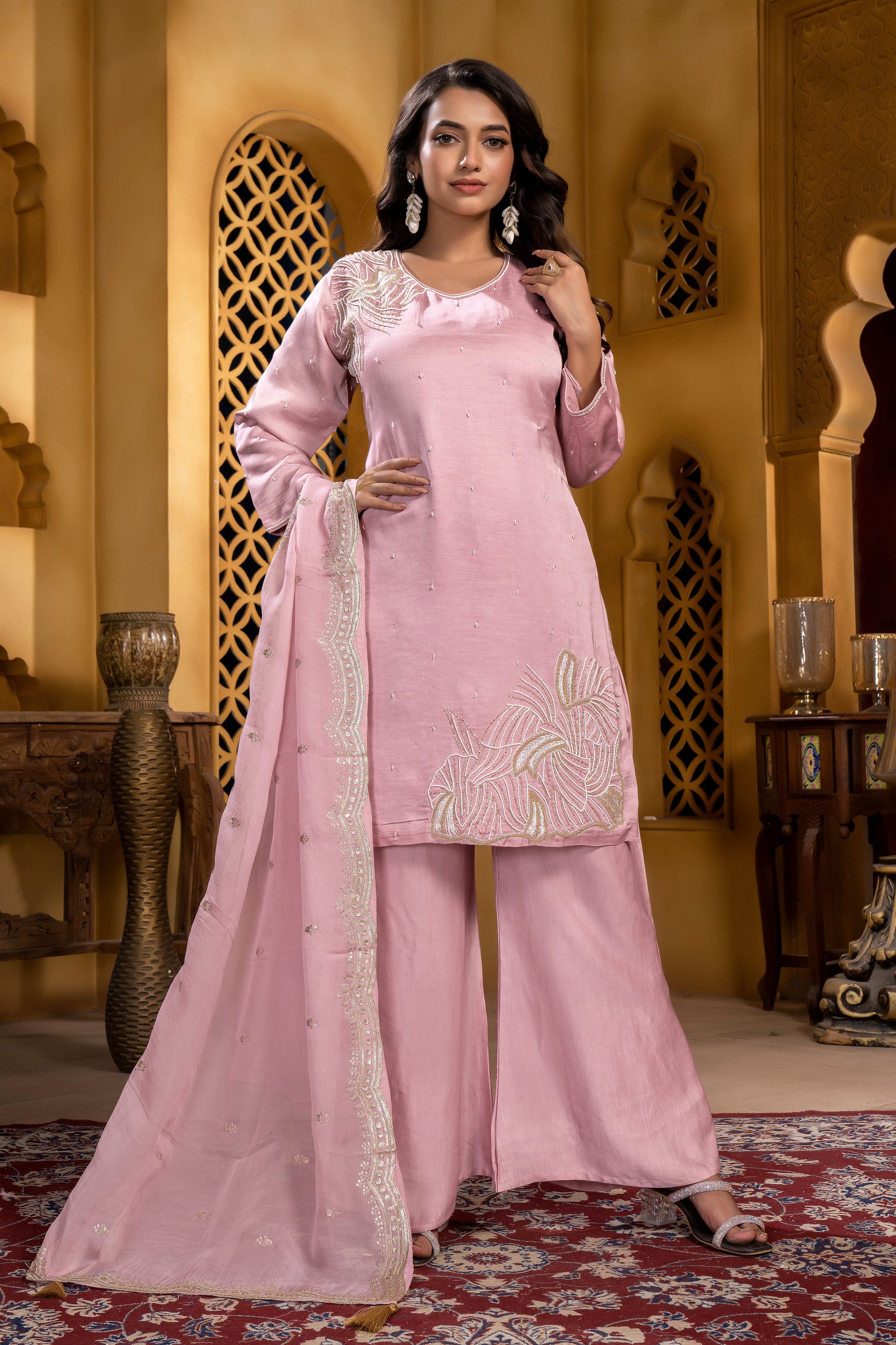 The short-length silhouette paired with full sleeves creates a chic and versatile look, ideal for styling with lehengas, skirts, shararas, or even tailored pants. The top is beautifully adorned with intricate Zardosi and cutdana handwork, adding rich detailing and elegant sparkle. The craftsmanship highlights fine artistry while keeping the overall design sophisticated and wearable.