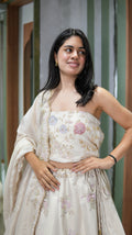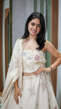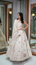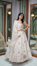 This stunning ensemble features a grand 7-meter flair lehenga crafted in luxurious pure tissue fabric, offering a beautiful flow and regal movement. The outfit is adorned with an exquisite abstract hand khatwork and zardosi work fusion, creating a rich yet graceful texture throughout. Rendered in a pure ivory color, the ensemble radiates sophistication, serenity, and understated opulence—ideal for summer celebrations and elegant daytime or evening functions.