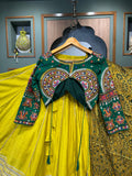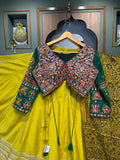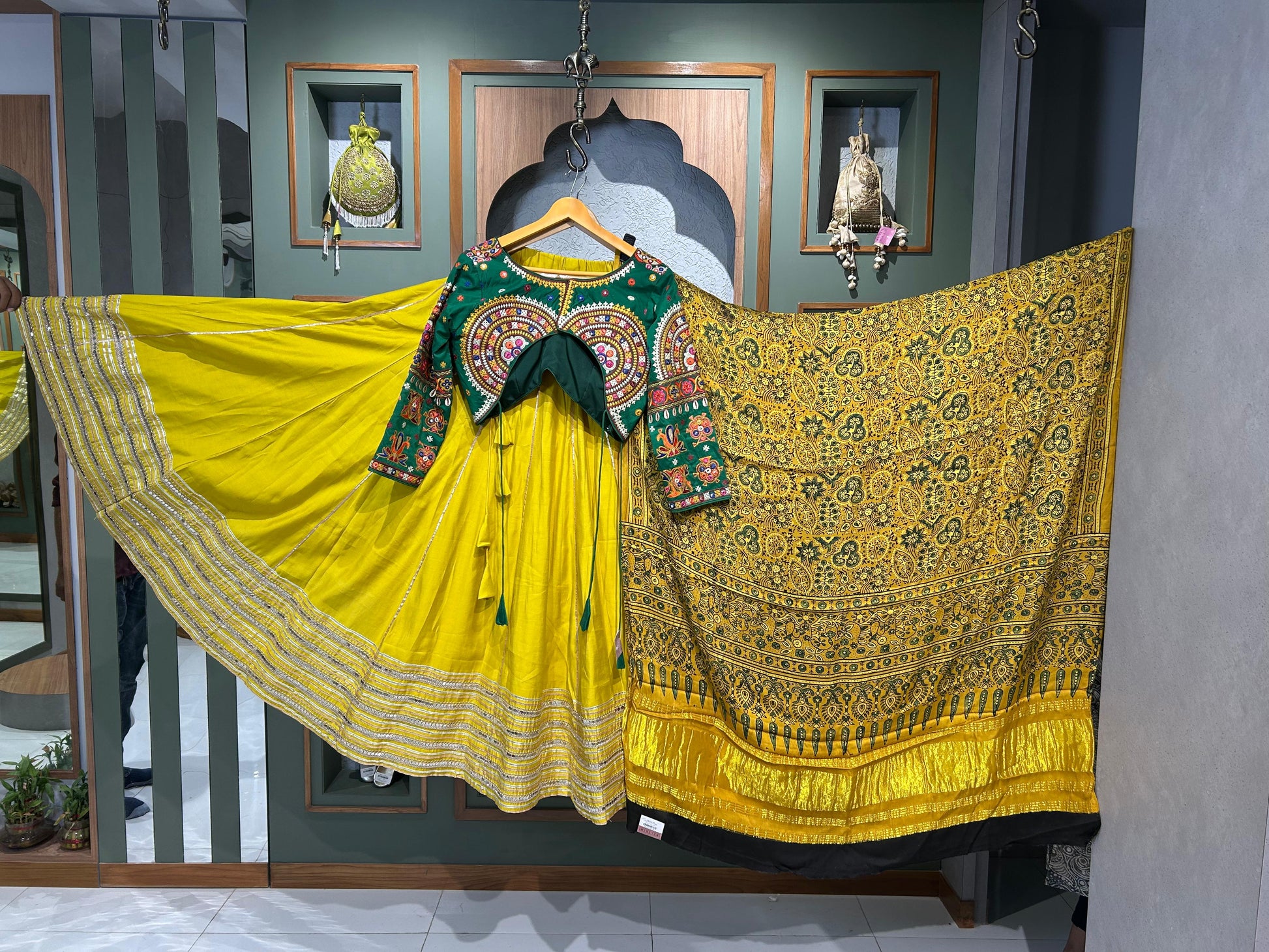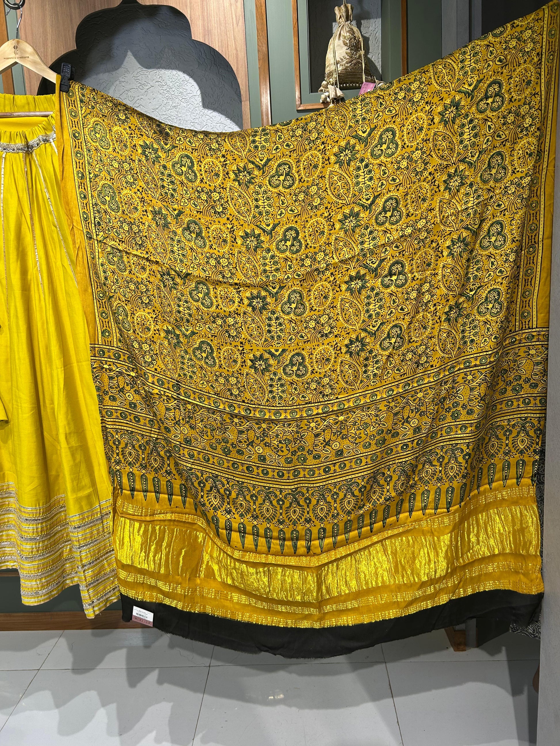 Celebrate culture, color, and craftsmanship with this showstopping Chaniya Choli set that exudes traditional elegance with a bold and festive vibe. Featuring a stunning sunny yellow Bombay silk chaniya, a handcrafted Katchi embroidered blouse, and a regal Ajrak dupatta, this ensemble is made for those who wish to shine at every festive gathering.