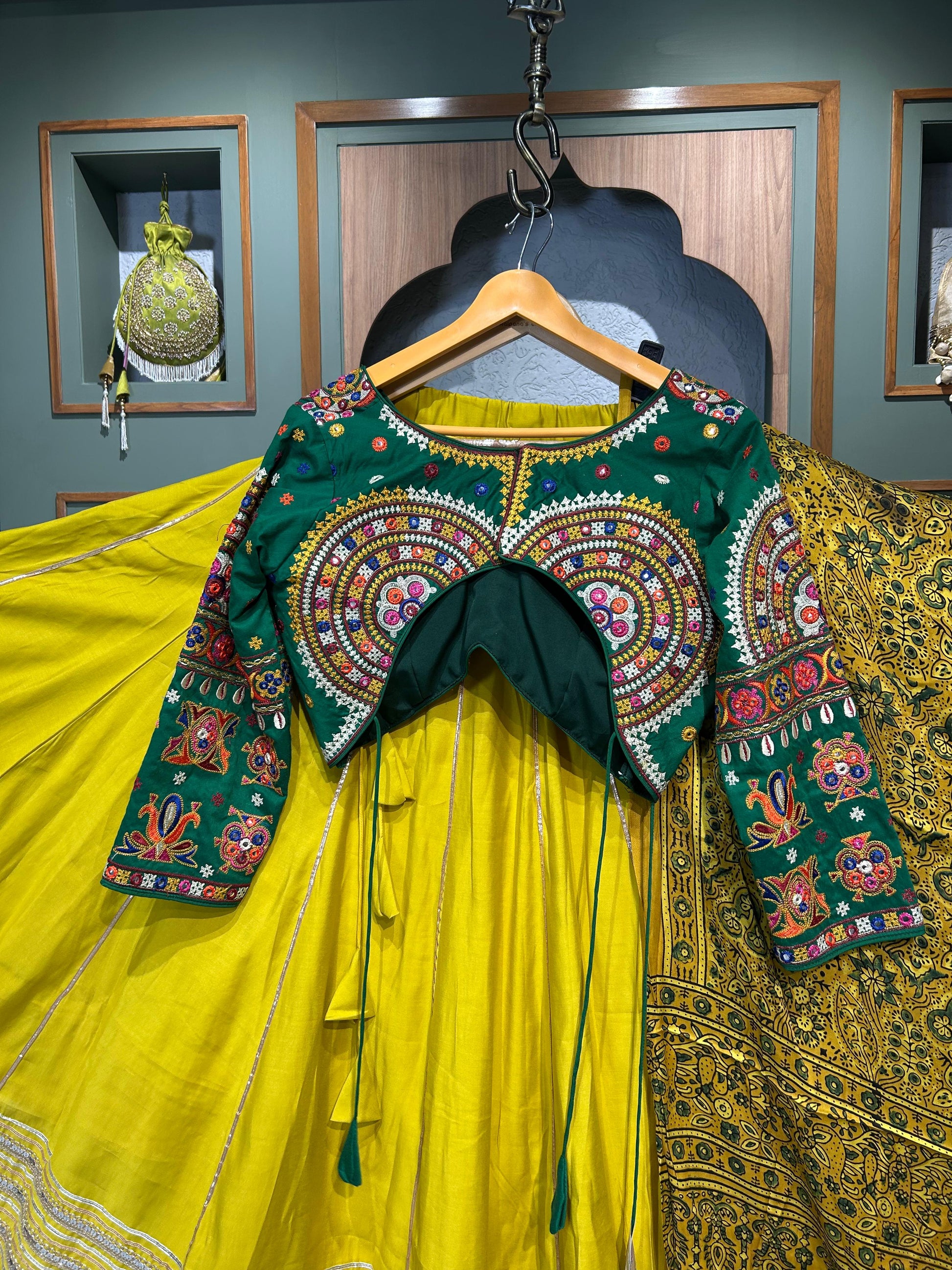 The Katchi blouse is a work of art — hand-embroidered with traditional motifs in multicolored threads on a deep green base. With mirror detailing, full-length sleeves, and back tie-up strings, it embodies Gujarat's rich cultural embroidery heritage. -