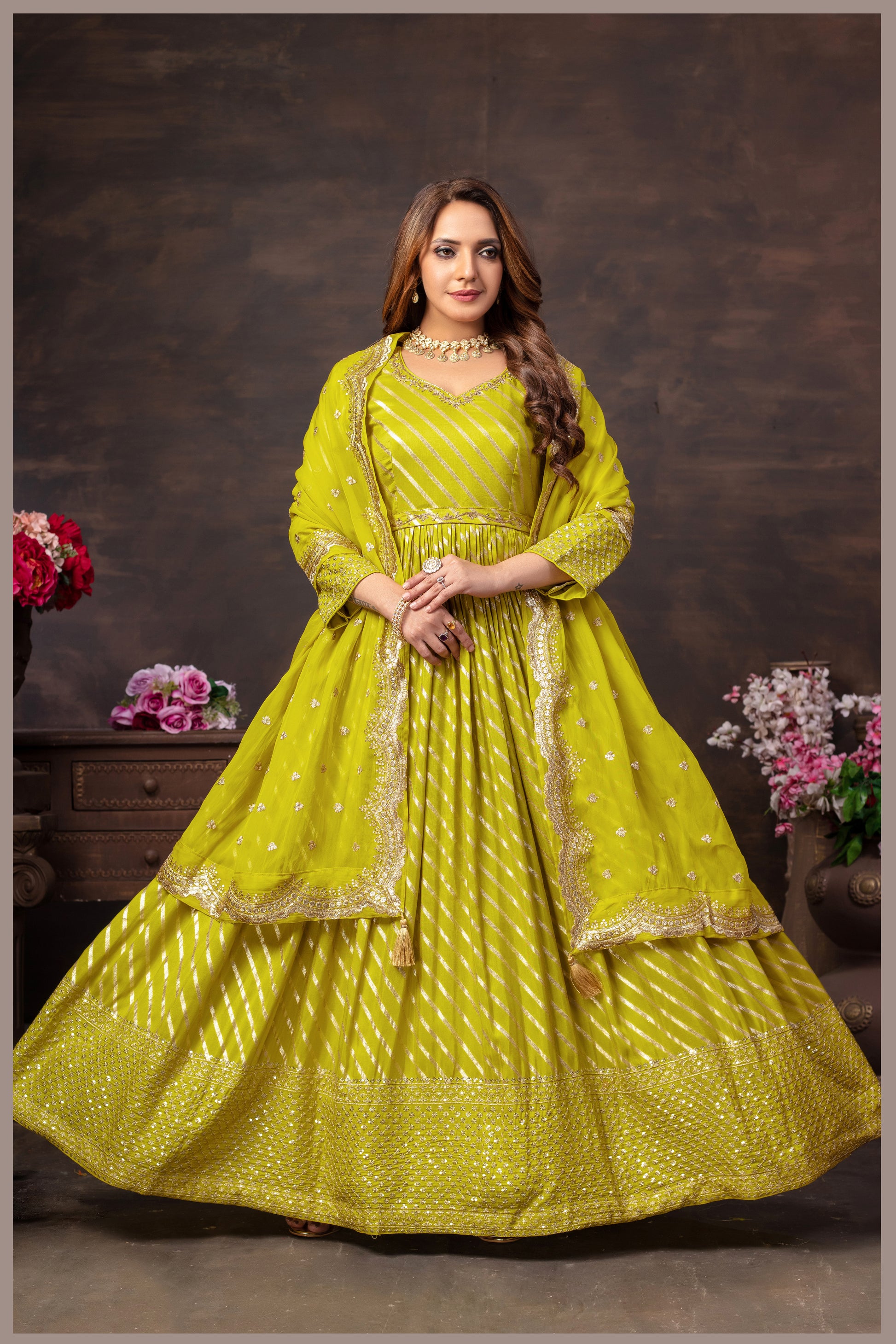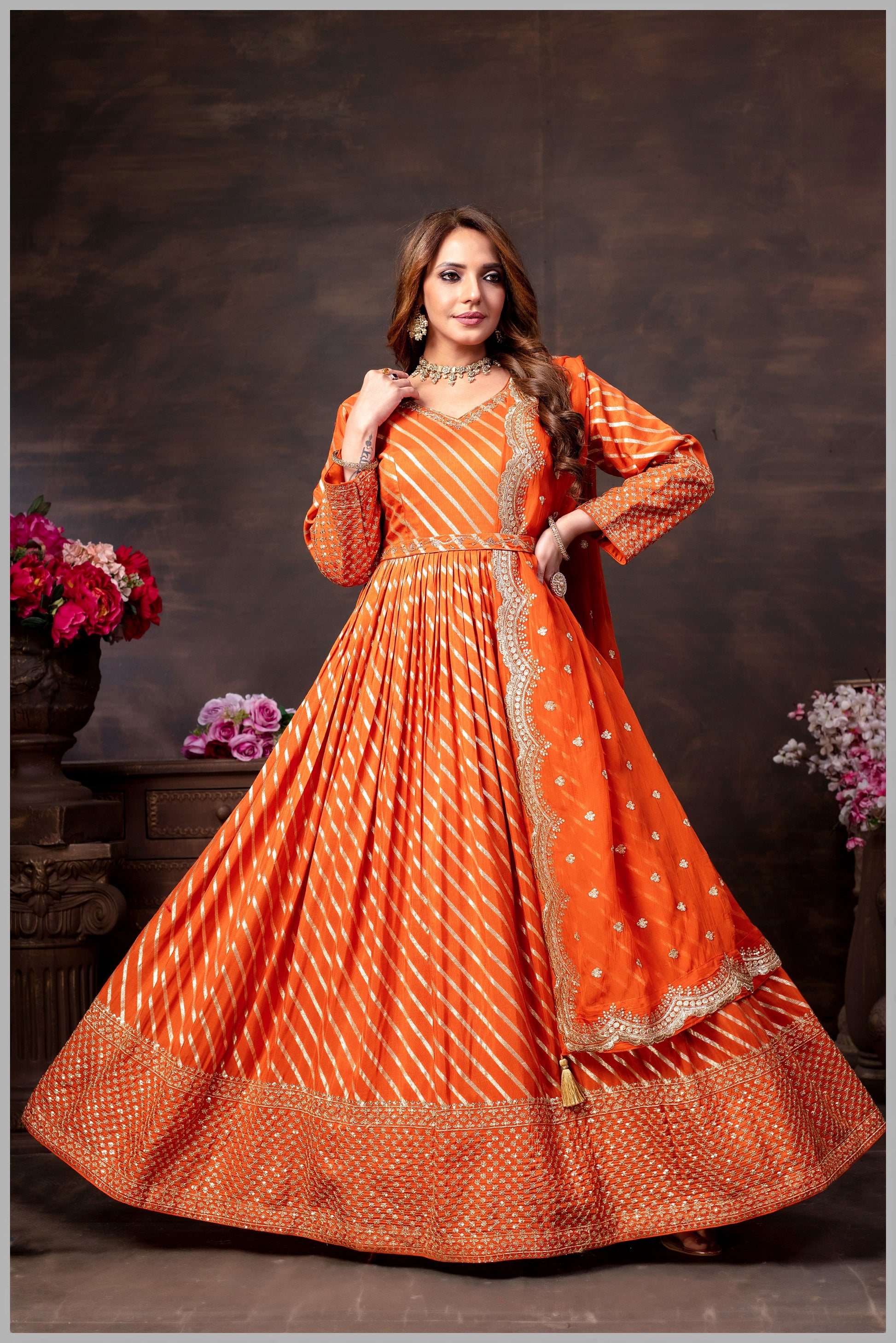 The gown is beautifully woven in classic Leheriya patterns, bringing a vibrant yet graceful flow that reflects rich Indian heritage. The luxurious Dola silk base offers a soft sheen, smooth texture, and elegant drape, enhancing the overall grandeur of the silhouette.