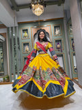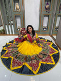 Step into regal tradition and artisanal opulence with “Saanjh Raag” — an exquisite Chaniya Choli ensemble by Kalpanascreations, Sindhubhavan. A radiant symphony of yellow and red Bombay silk, this set is embellished with vintage mirror handwork, rich Gaji patchwork, and a breathtaking 18-meter gher (flair) that gives every twirl a story of heritage and celebration. Perfect for Garba nights, cultural festivals, and bridal occasions.
