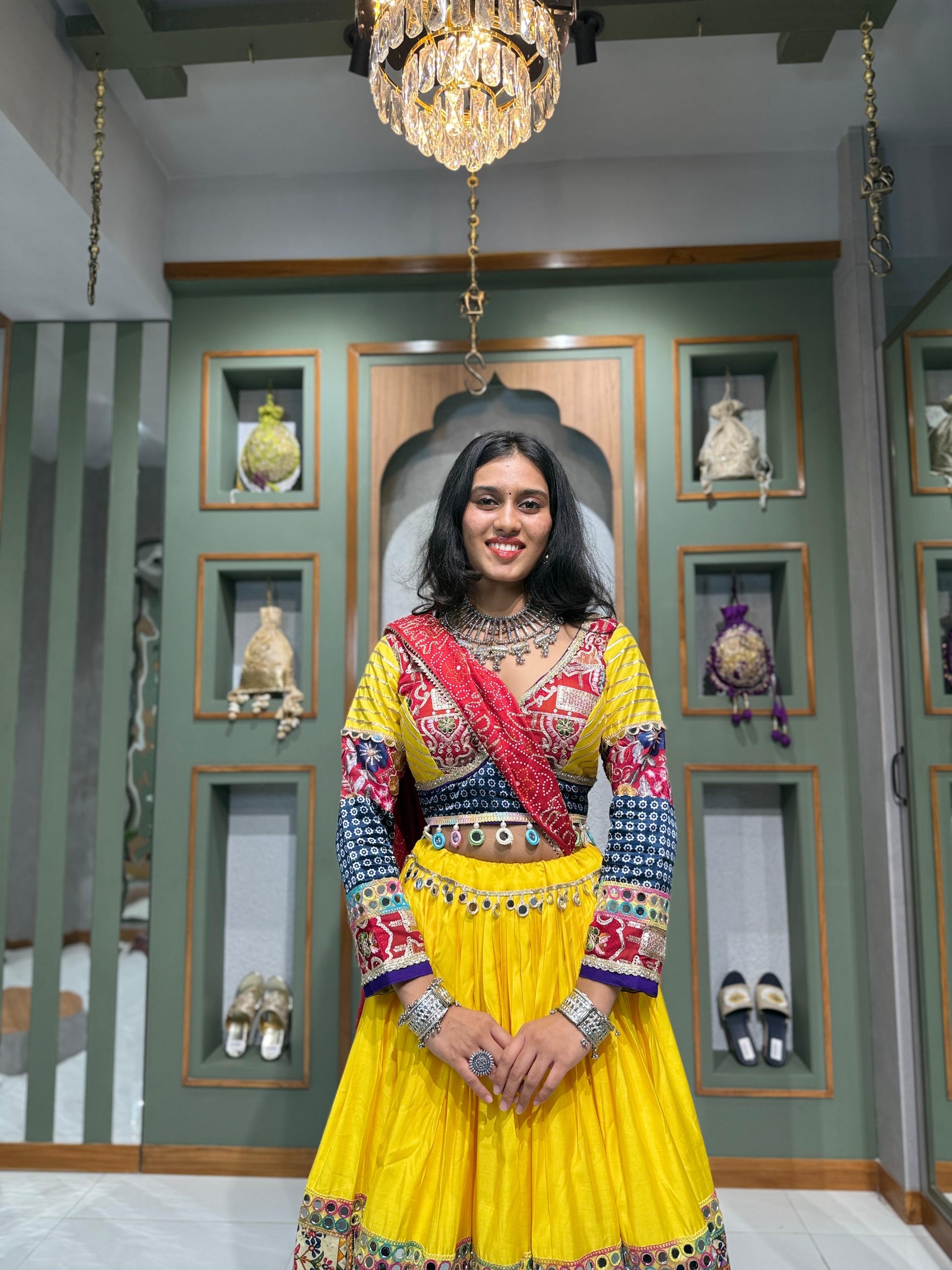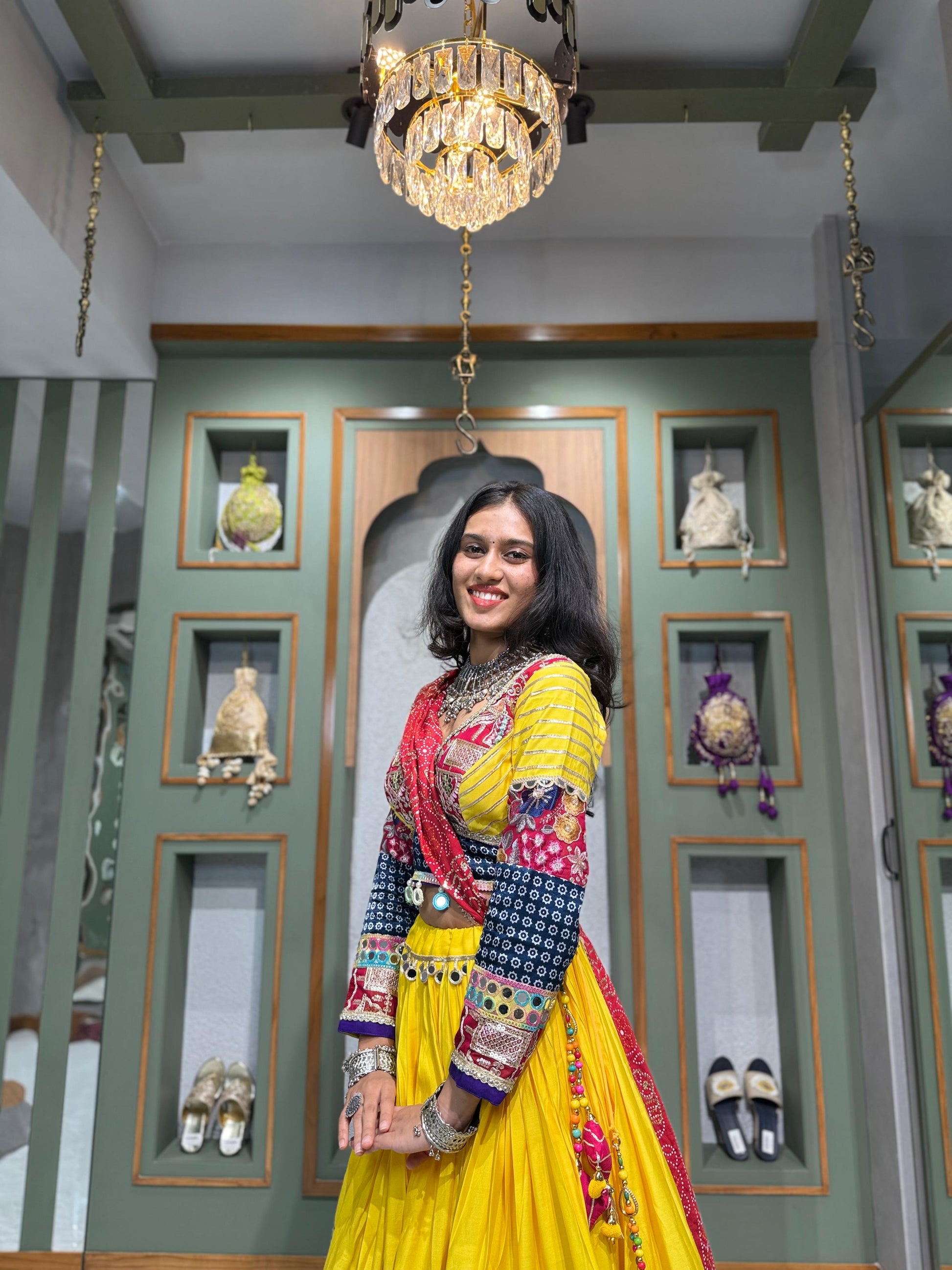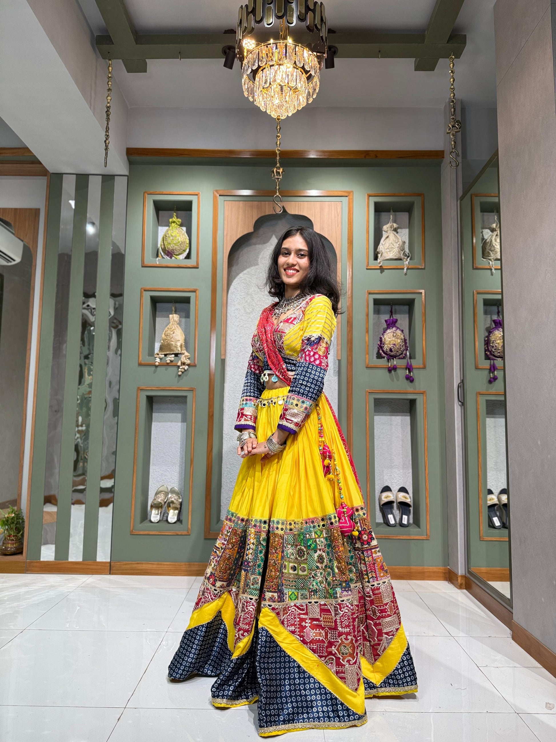 Crafted from premium Bombay silk, the chaniya is a showstopper. The vibrant dual-tone base in yellow and red captures festive vibrancy while hand-applied vintage mirror work adds sparkle. The Gaji patchwork borders reflect skilled craftsmanship rooted in Gujarat’s textile legacy. The voluminous 18-meter flair ensures majestic movement and queen-like presence.