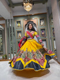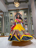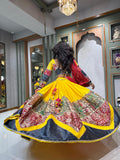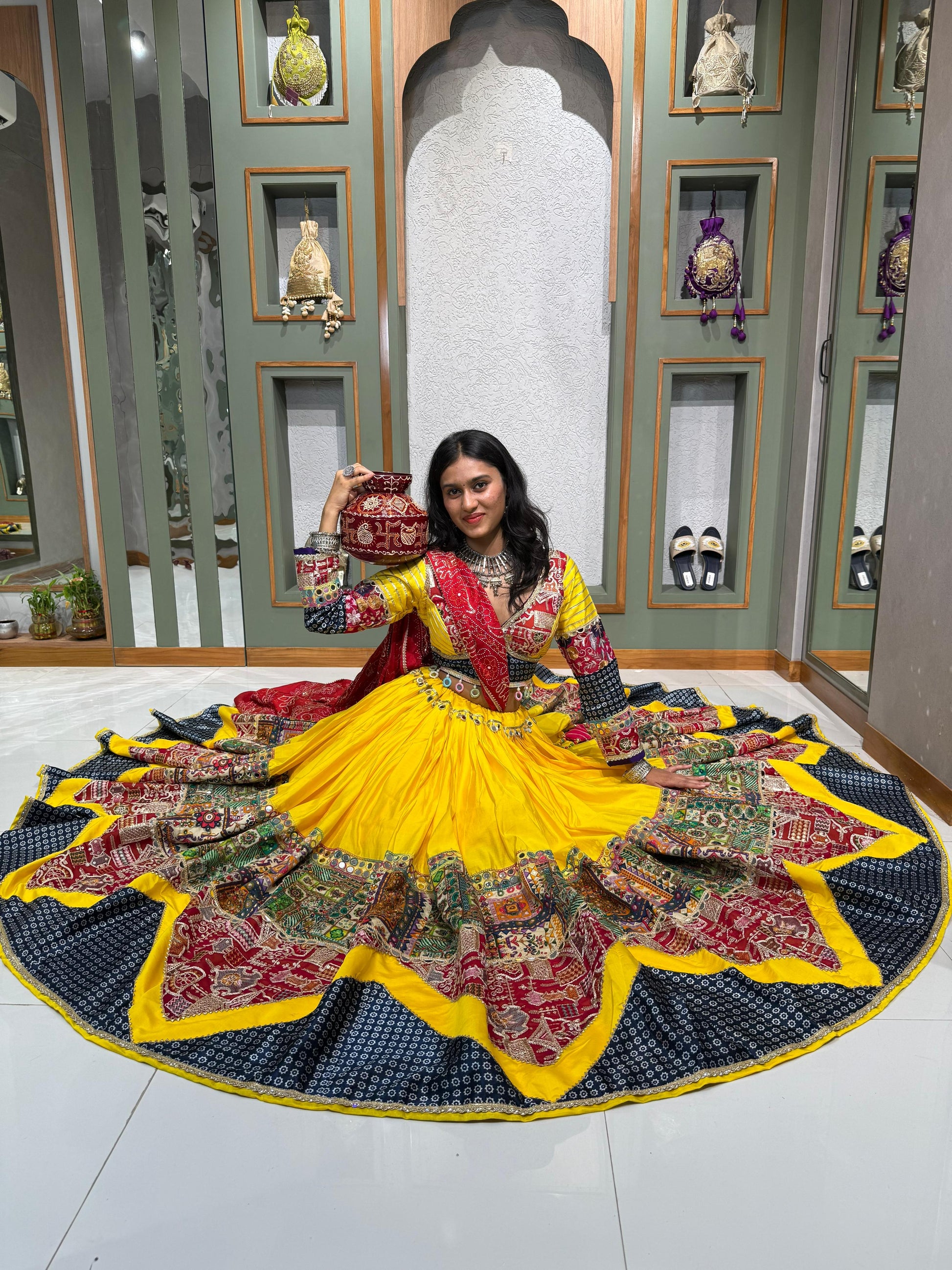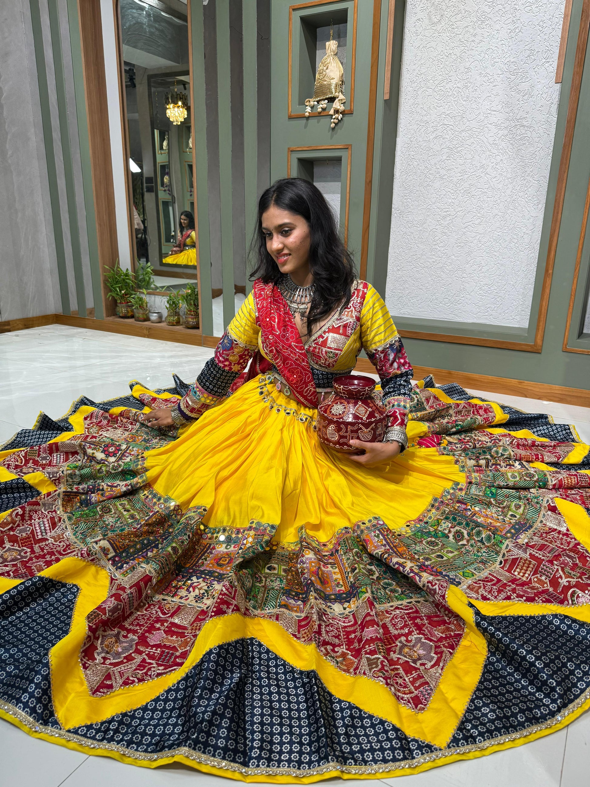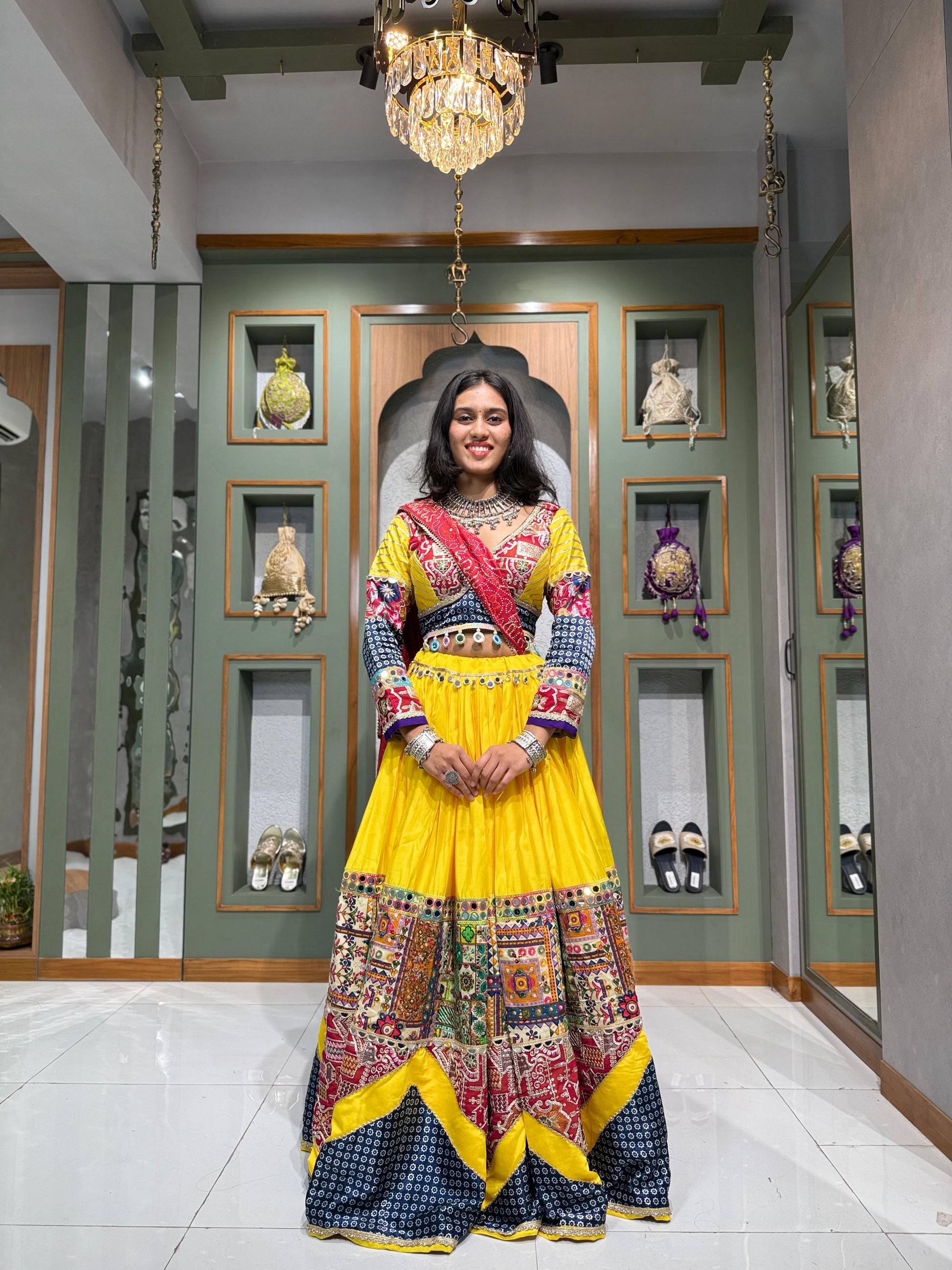 Crafted from premium Bombay silk, the chaniya is a showstopper. The vibrant dual-tone base in yellow and red captures festive vibrancy while hand-applied vintage mirror work adds sparkle. The Gaji patchwork borders reflect skilled craftsmanship rooted in Gujarat’s textile legacy. The voluminous 18-meter flair ensures majestic movement and queen-like presence.