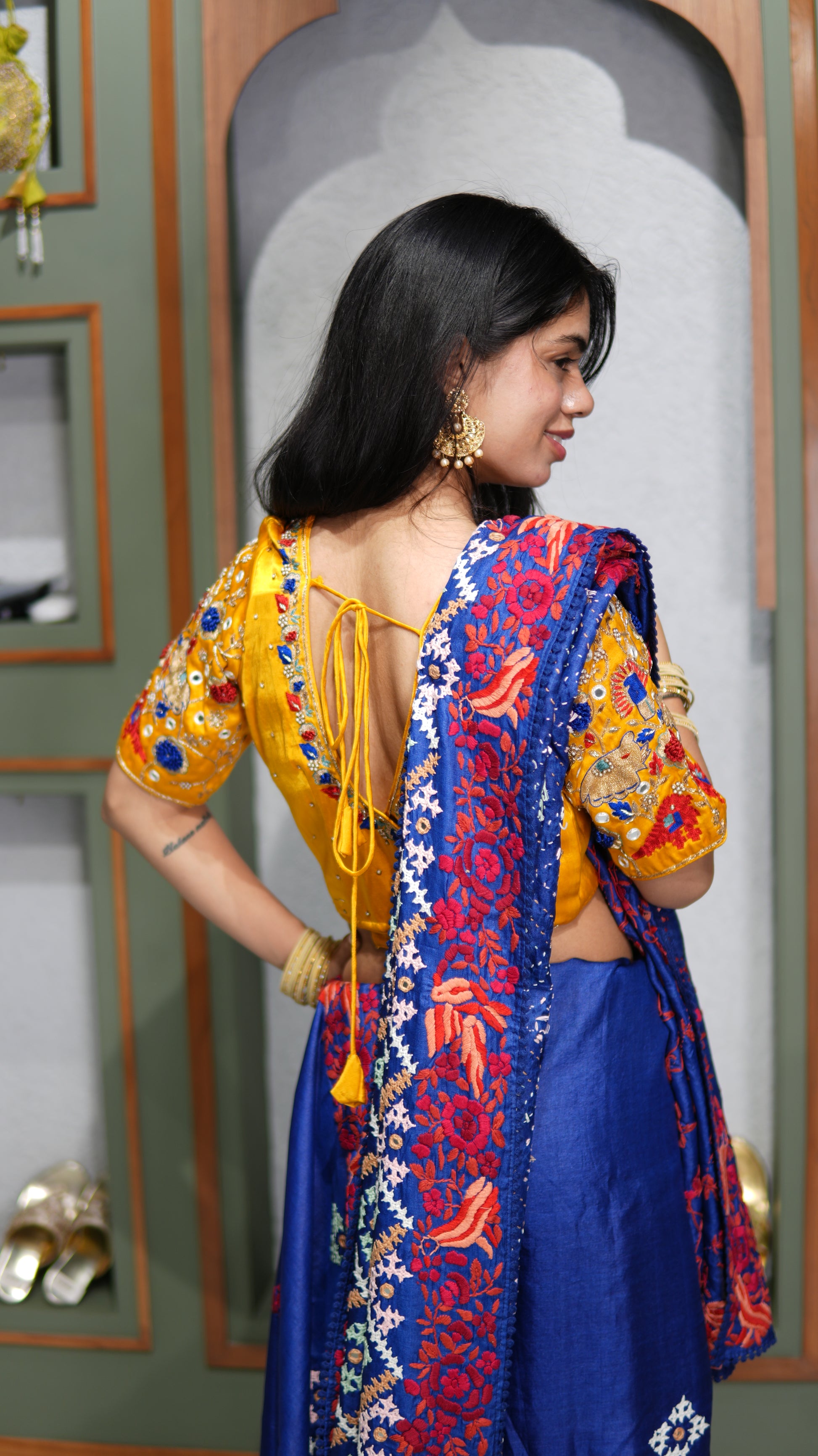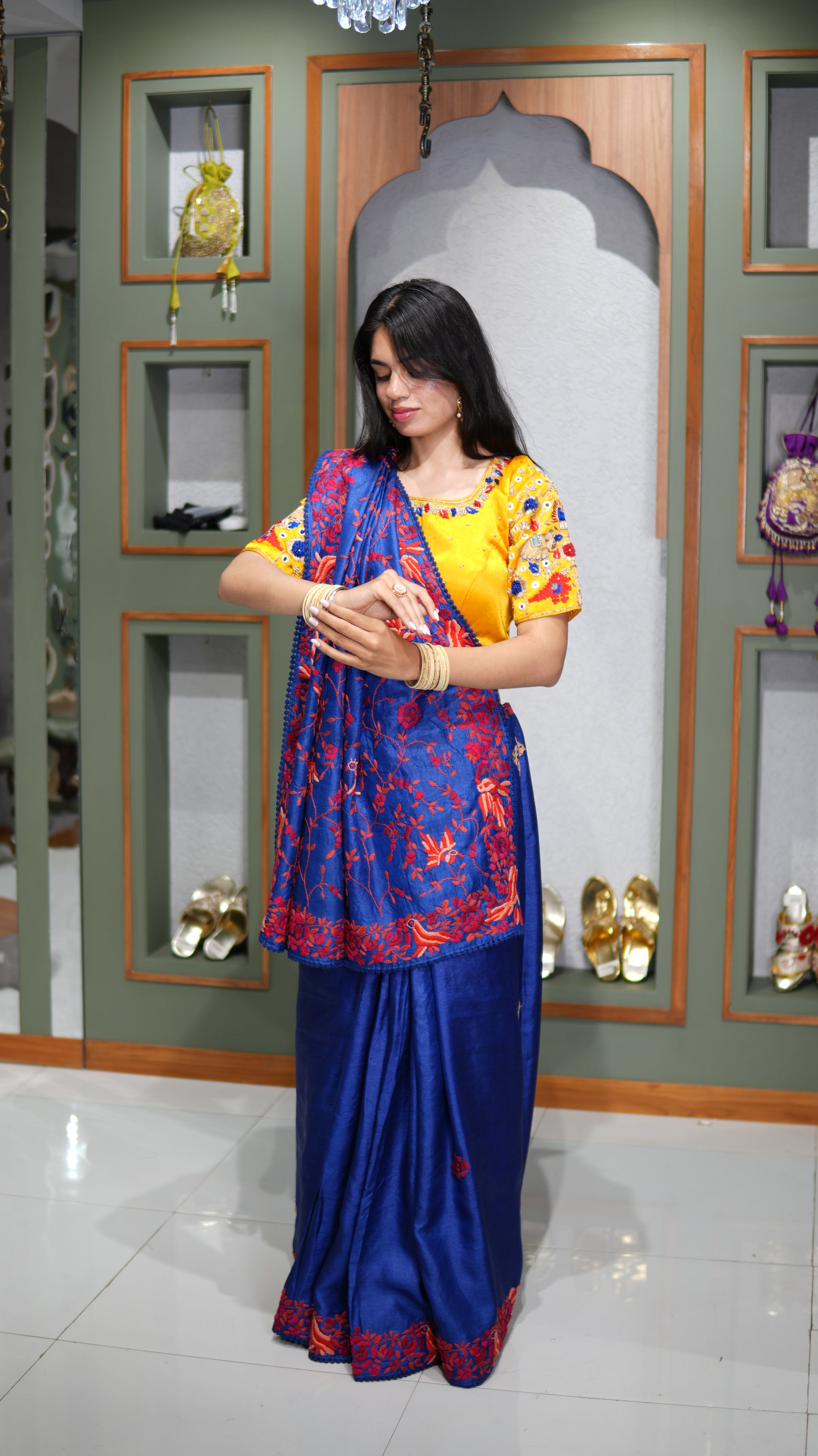 The highlight of this saree is the exquisite Kantha–Rabari fusion work crafted on semi Tussar silk, showcasing a beautiful blend of traditional hand embroidery techniques. This fusion reflects artisanal storytelling through intricate patterns, adding depth, character, and cultural richness to the saree while maintaining a sophisticated aesthetic.