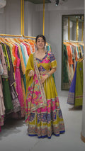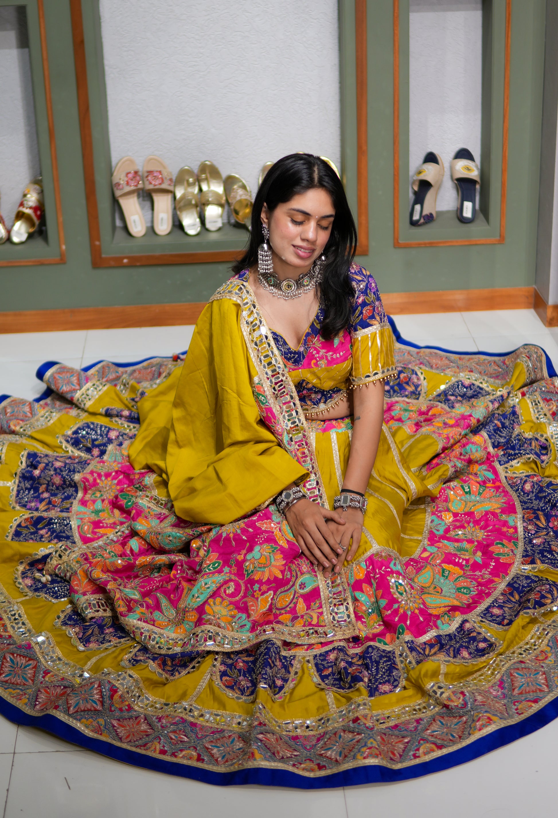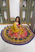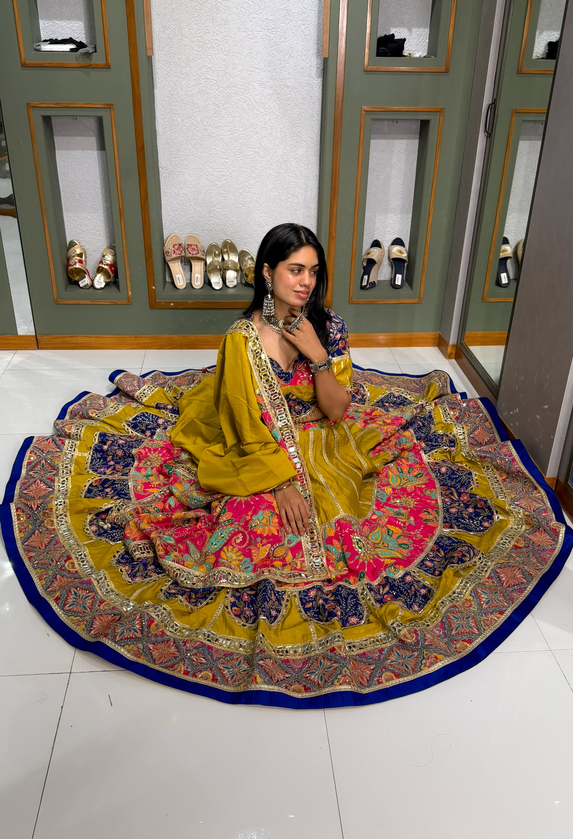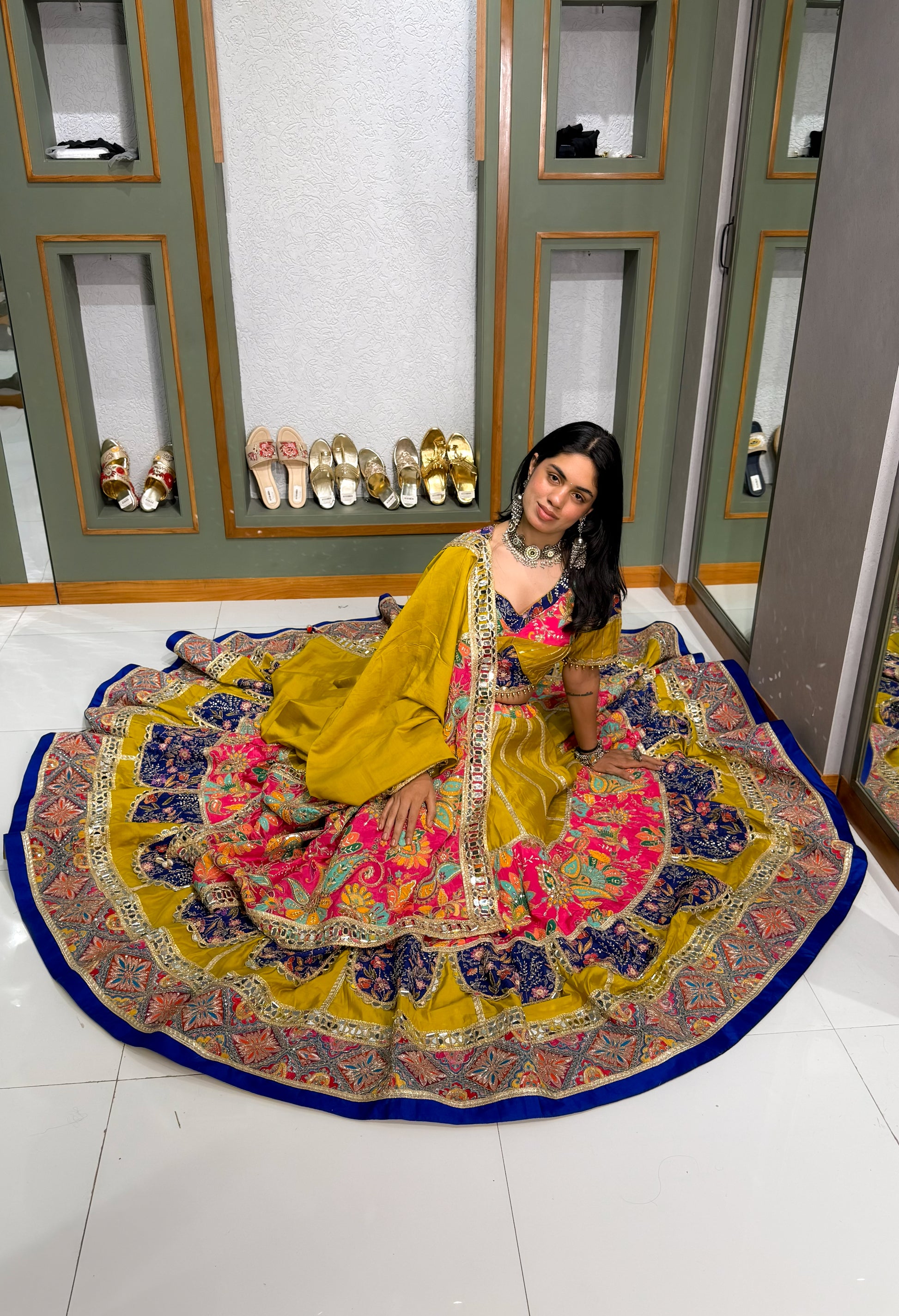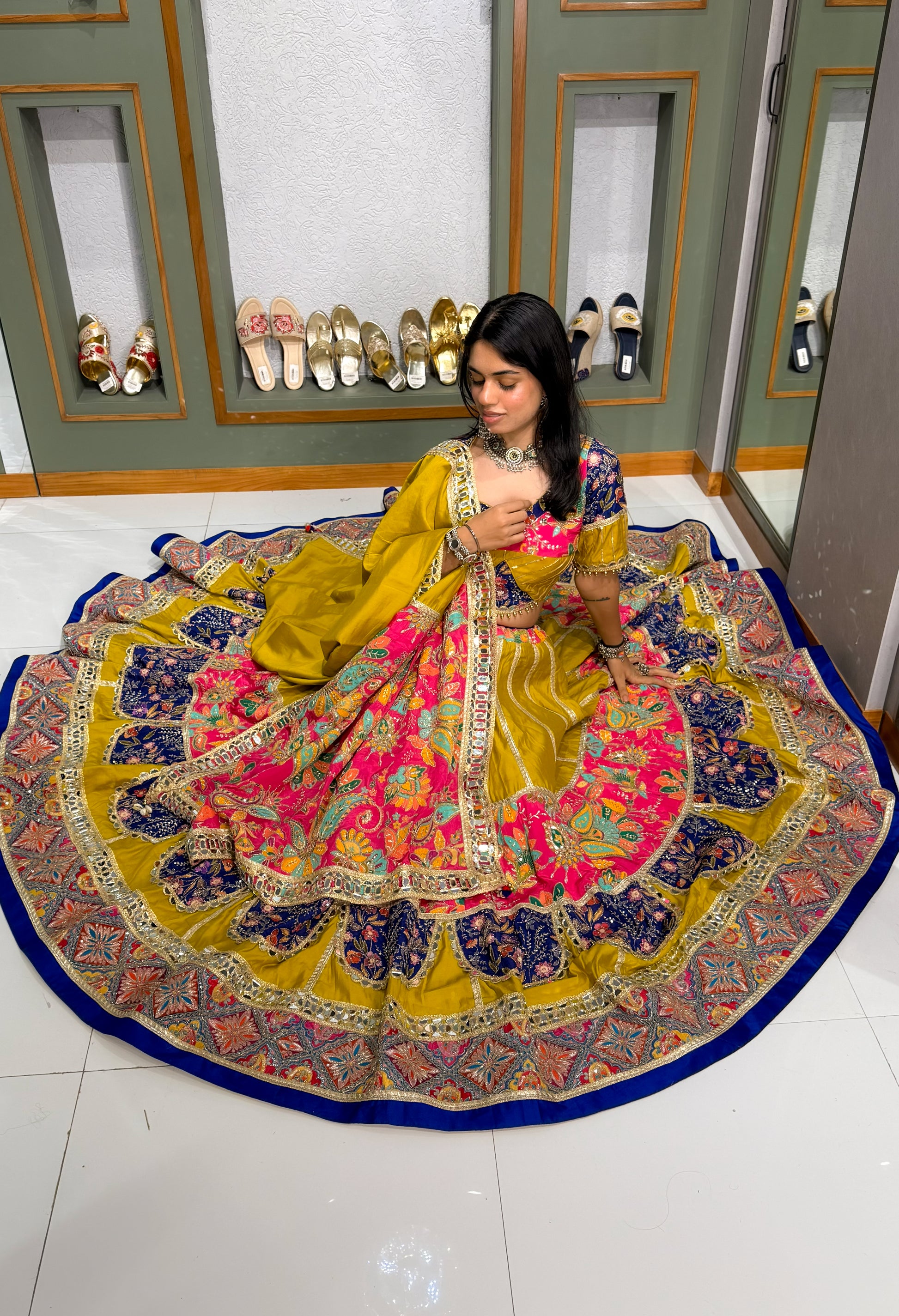 This masterpiece features an extraordinary 18+ meter flair, creating a voluminous and regal silhouette that moves with unmatched grace. Crafted entirely in premium Bombay silk material, the outfit offers a rich sheen, luxurious texture, and a fluid drape that enhances its couture appeal.