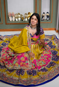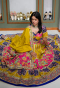 The design showcases a heavy vintage-inspired look with abstract fusion elements, blending traditional artistry with modern sensibilities. The ensemble is elevated by a striking designer color combination of Purple Rani and Lemon Yellow, creating a vibrant yet royal contrast that commands attention.
