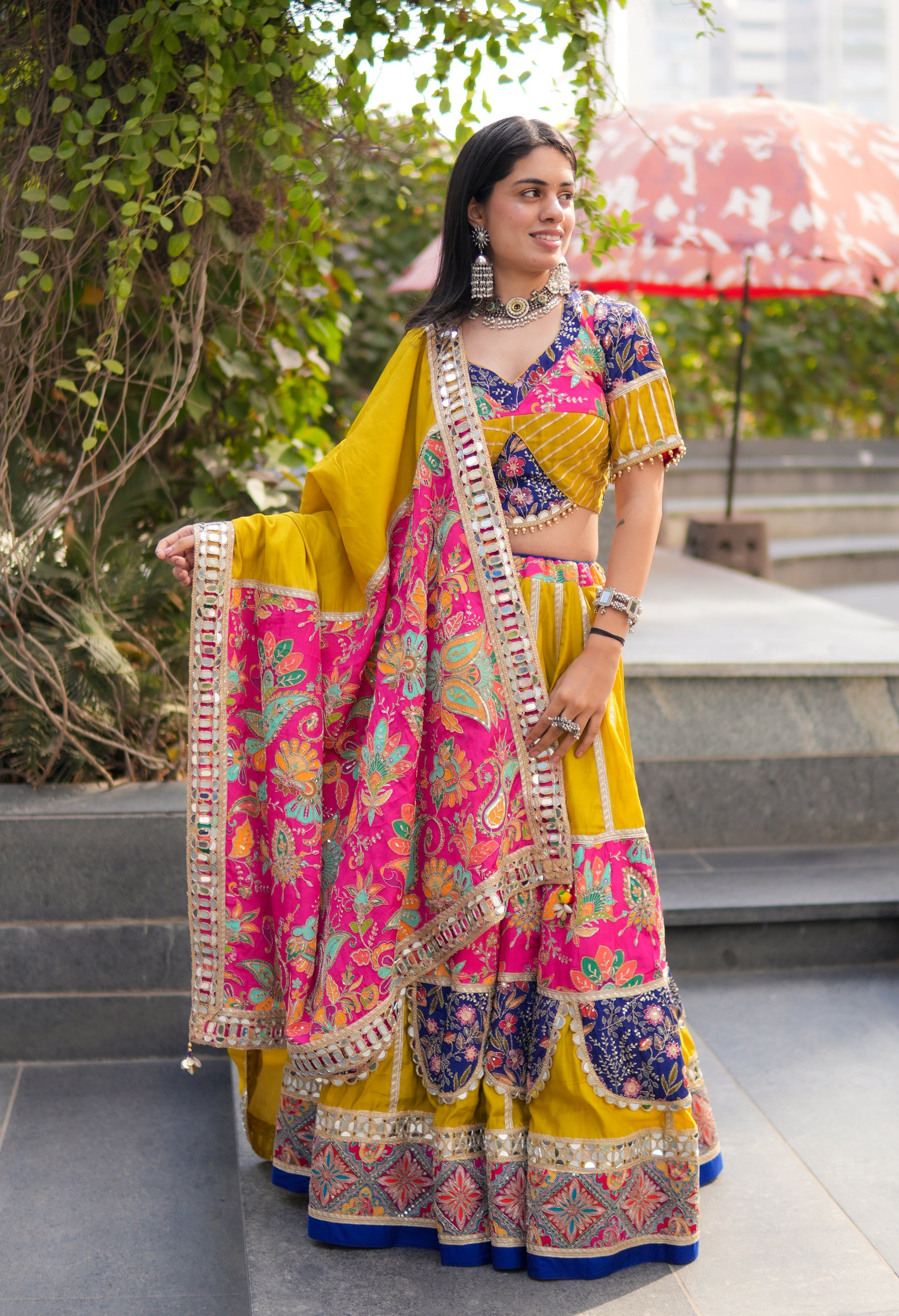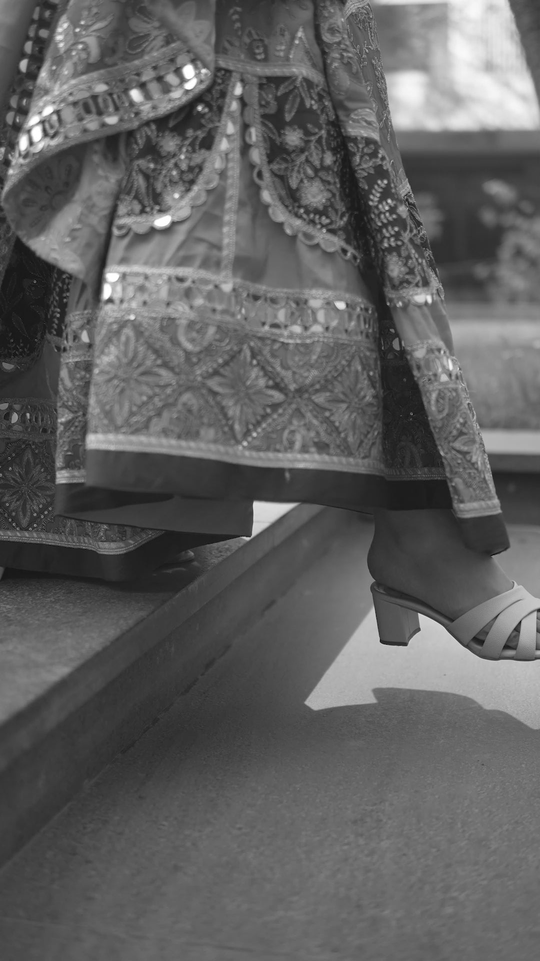 Adding to its opulence is real mirrorwork embroidery, meticulously handcrafted to reflect light beautifully and create a dazzling visual effect with every movement. The look is further enhanced with designer khatwork tassels, adding texture, detail, and a distinctive handcrafted finish that completes the ensemble with finesse.