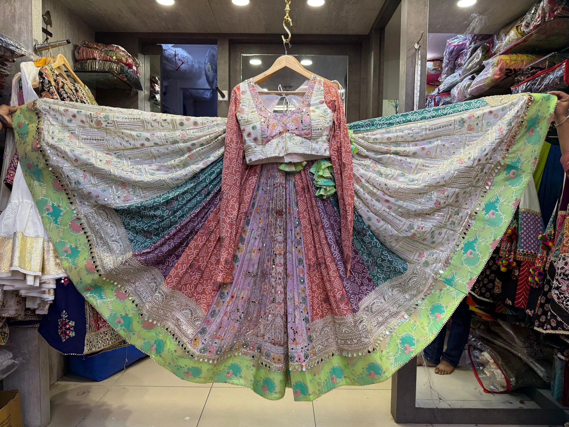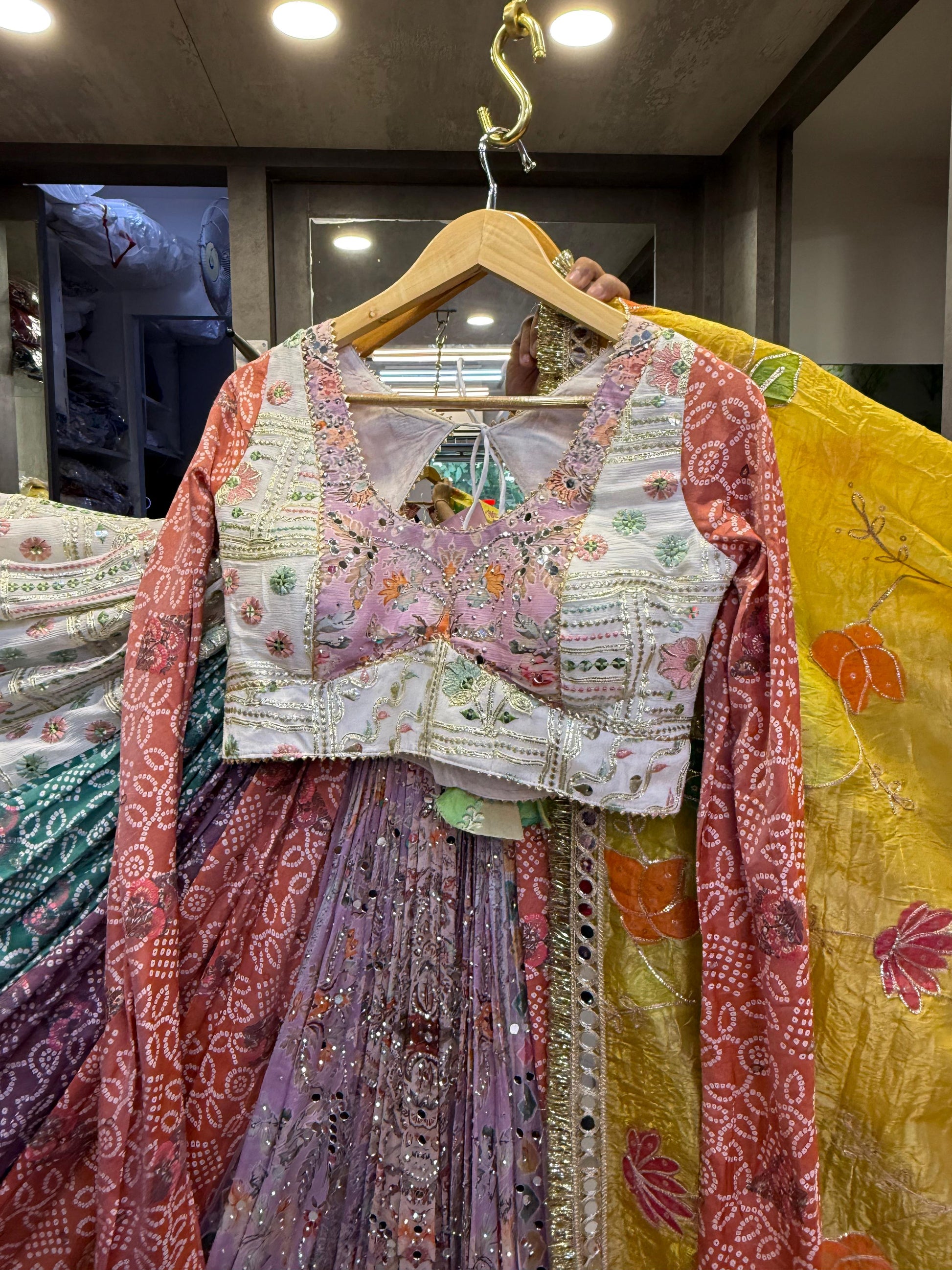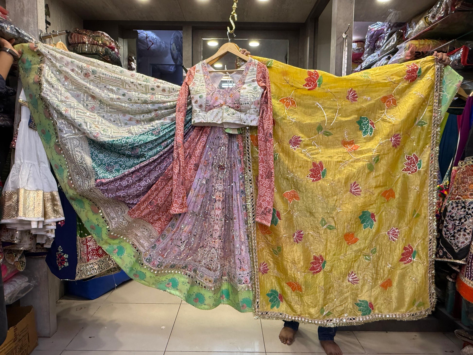 Float into any celebration with grace in “Pastel Reverie” — a designer chaniya choli ensemble by Kalpanascreations, Sindhubhavan. This masterpiece celebrates pastel elegance through the lens of traditional craftsmanship. With delicate hand embroidery, sequin sparkle, authentic mirror work, and subtle bandhani accents, this outfit blends heritage with heavenly charm. Completed with a light-as-air organza dupatta, this ensemble is perfect for daytime weddings, festive occasions, sangeets, or pre-wedding shoots.