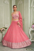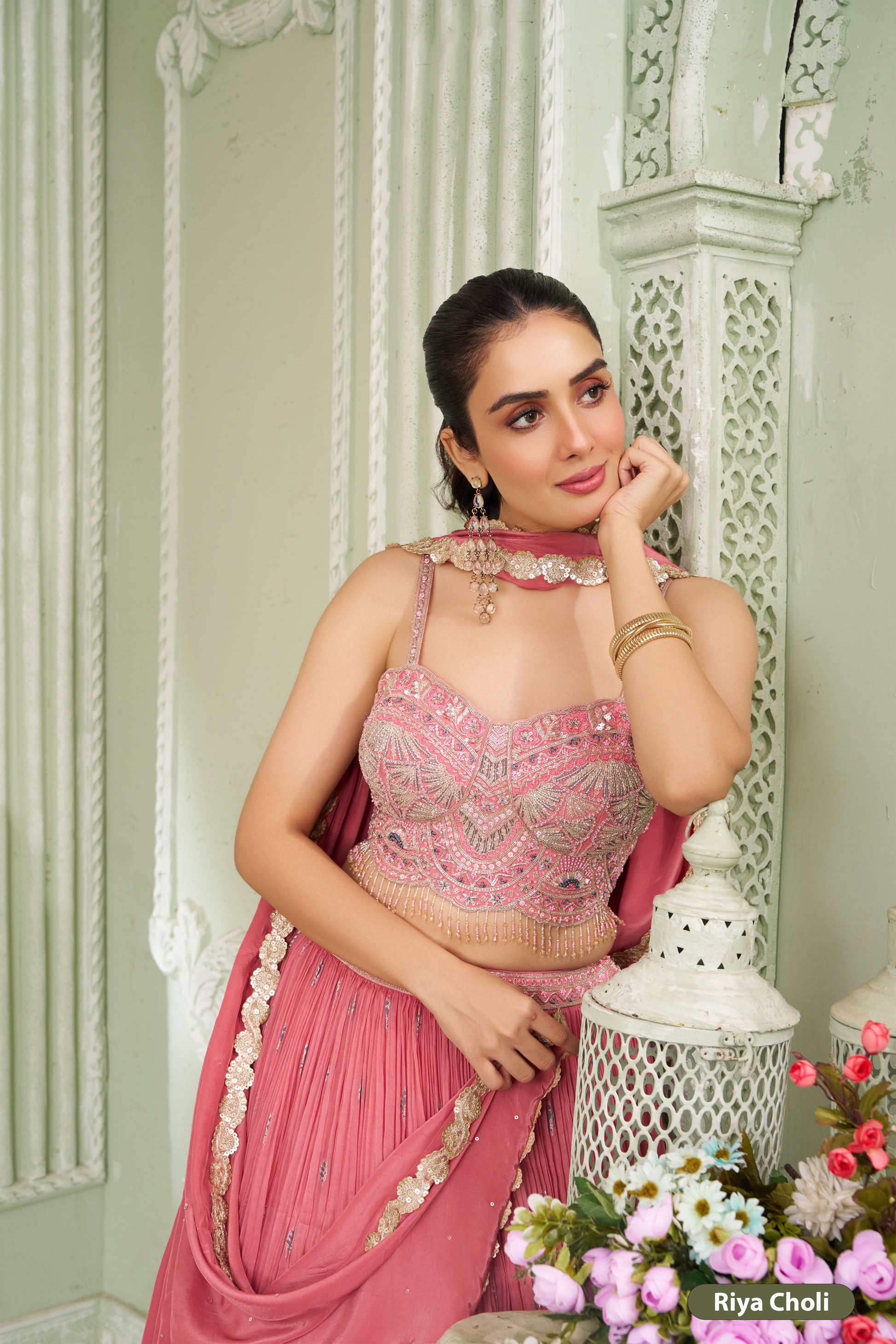 Rendered in a sophisticated pink hue, this outfit exudes calm grace and modern royalty, making it a timeless choice for premium occasions. The ensemble features a dramatic 5.5–6 meter flair, creating a beautifully voluminous silhouette that moves with elegance and grandeur. The base is enriched with Banarasi weaving and delicate butti motifs, adding depth, texture, and a classic Indian heritage charm to the overall look.