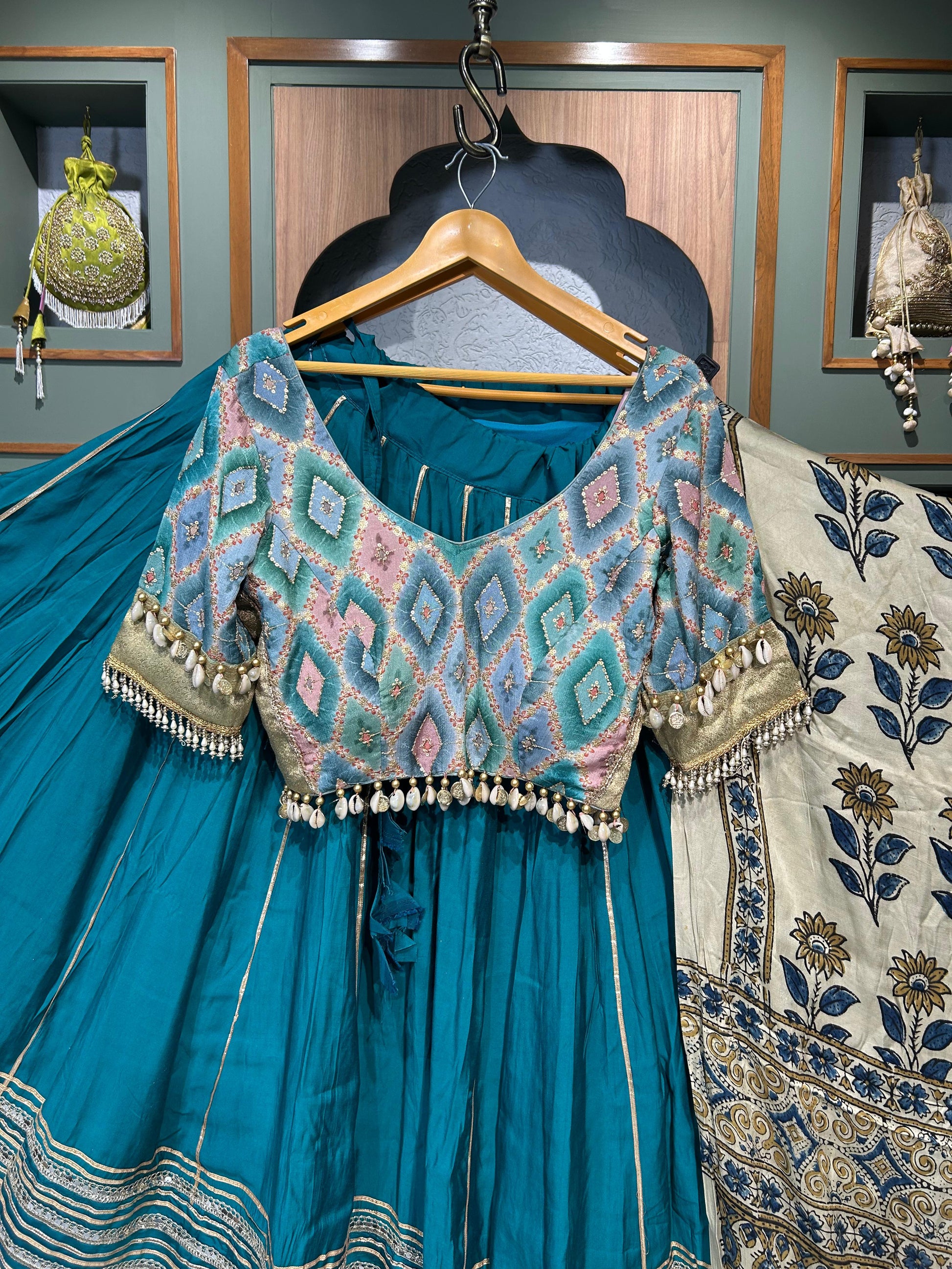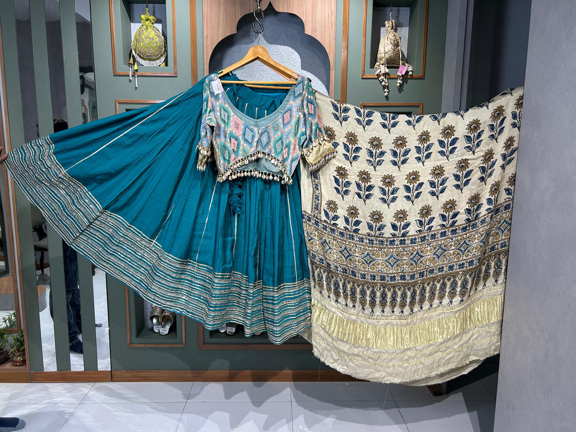 Peacock Teal Bombay Silk Chaniya Choli Set with Vintage Blouse & Ajrak Dupatta