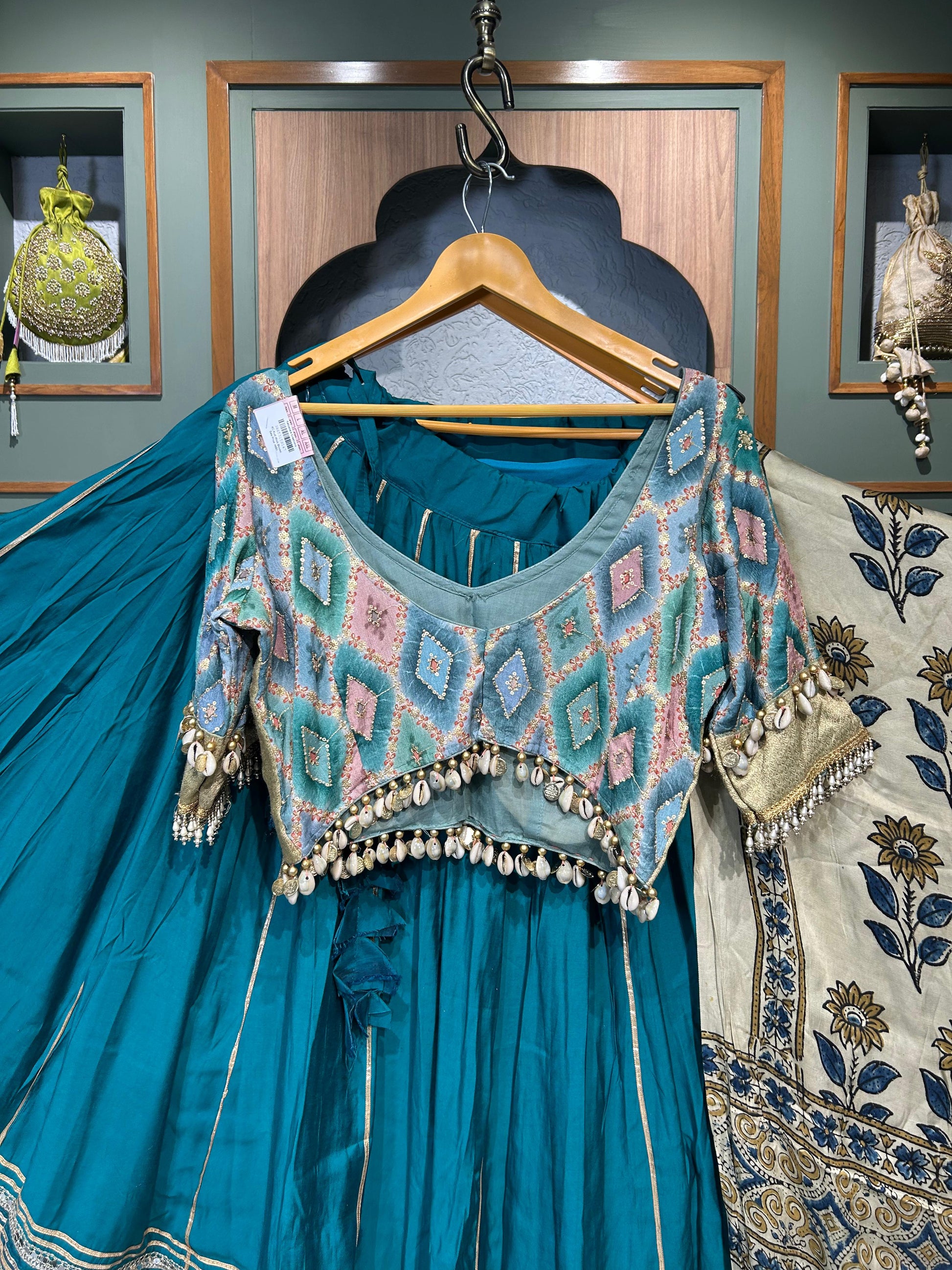 The lehenga is crafted from premium Bombay silk in a regal peacock teal shade, offering an elegant fall and sheen. With a grand 12-meter flair, it ensures dramatic volume and movement — perfect for twirling during dance and festive occasions. The hemline is beautifully adorned with traditional mirror and thread work detailing in complementary hues. -