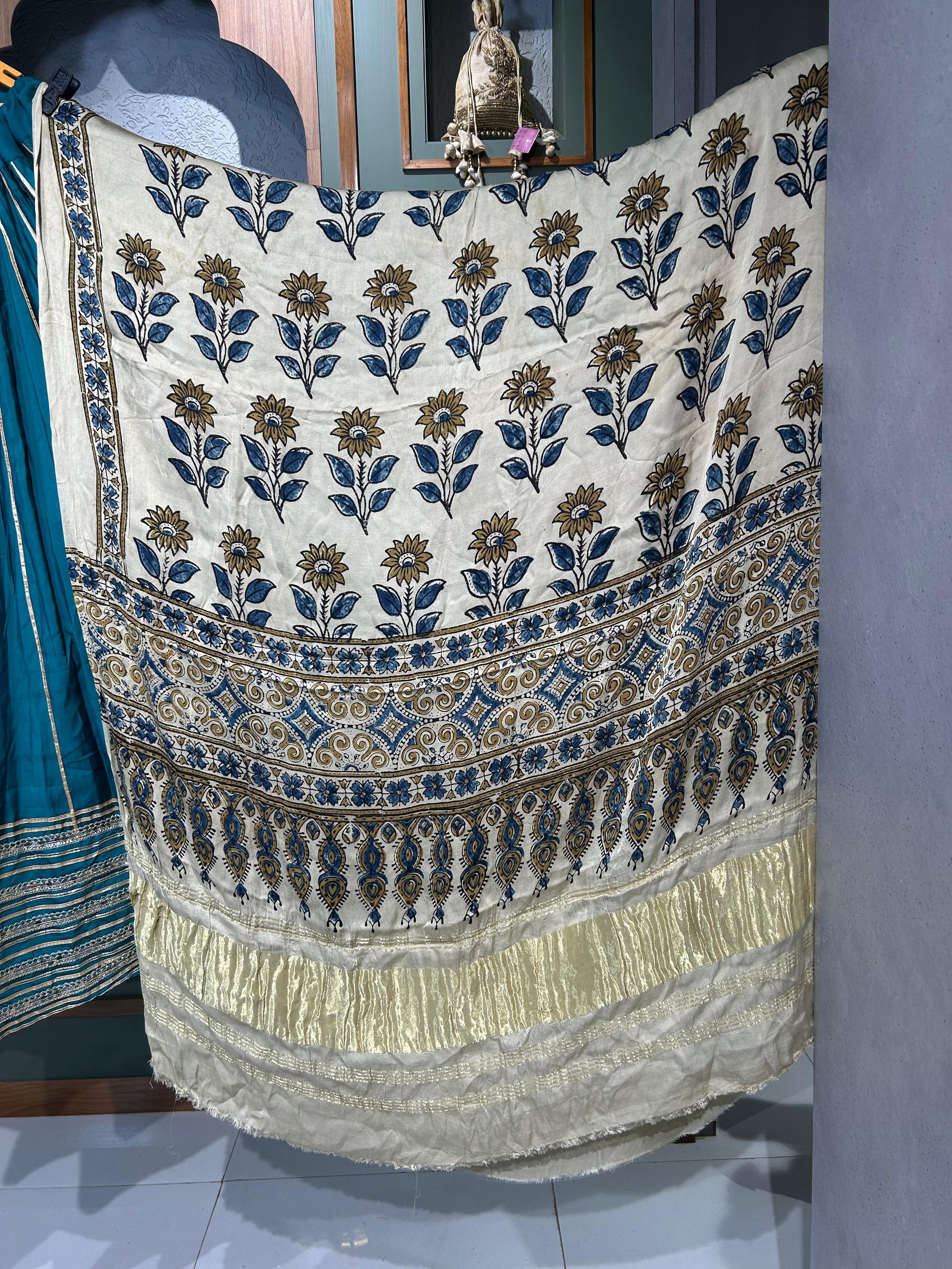 The Ajrak dupatta is an elegant off-white base with hand-block floral motifs in navy and mustard tones. Traditional Ajrak border detailing and a pleated fabric panel at the bottom complete its unique, handcrafted appeal — a true heirloom piece.
