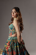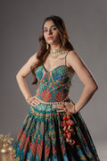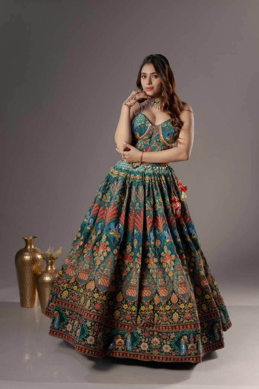 The ensemble features a designer corset-style blouse, tailored on a pure silk base that offers a rich texture, natural sheen, and a structured, flattering fit. The corset silhouette enhances the form beautifully, making it a perfect blend of modern fashion and traditional charm.