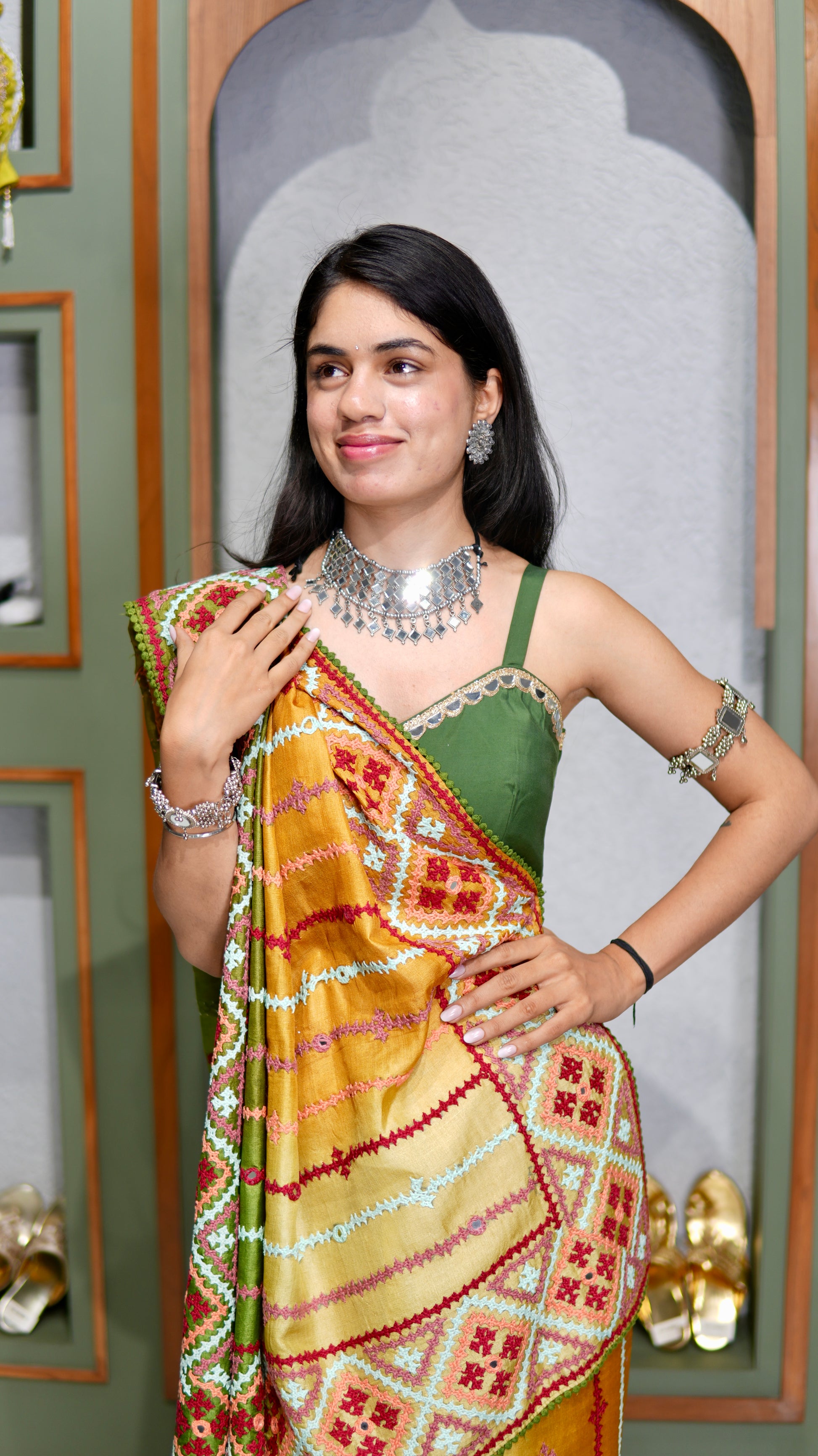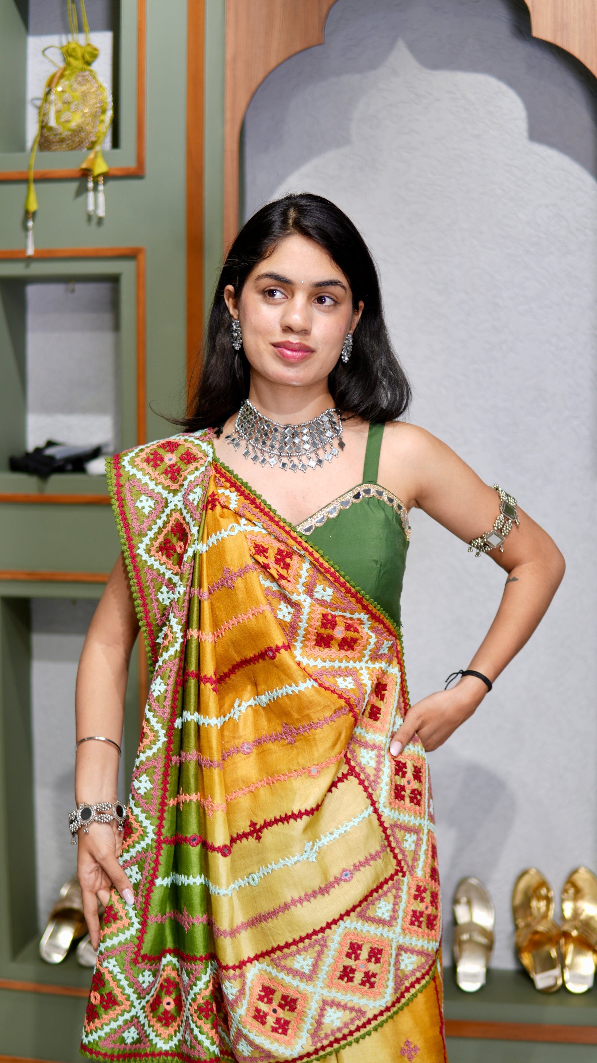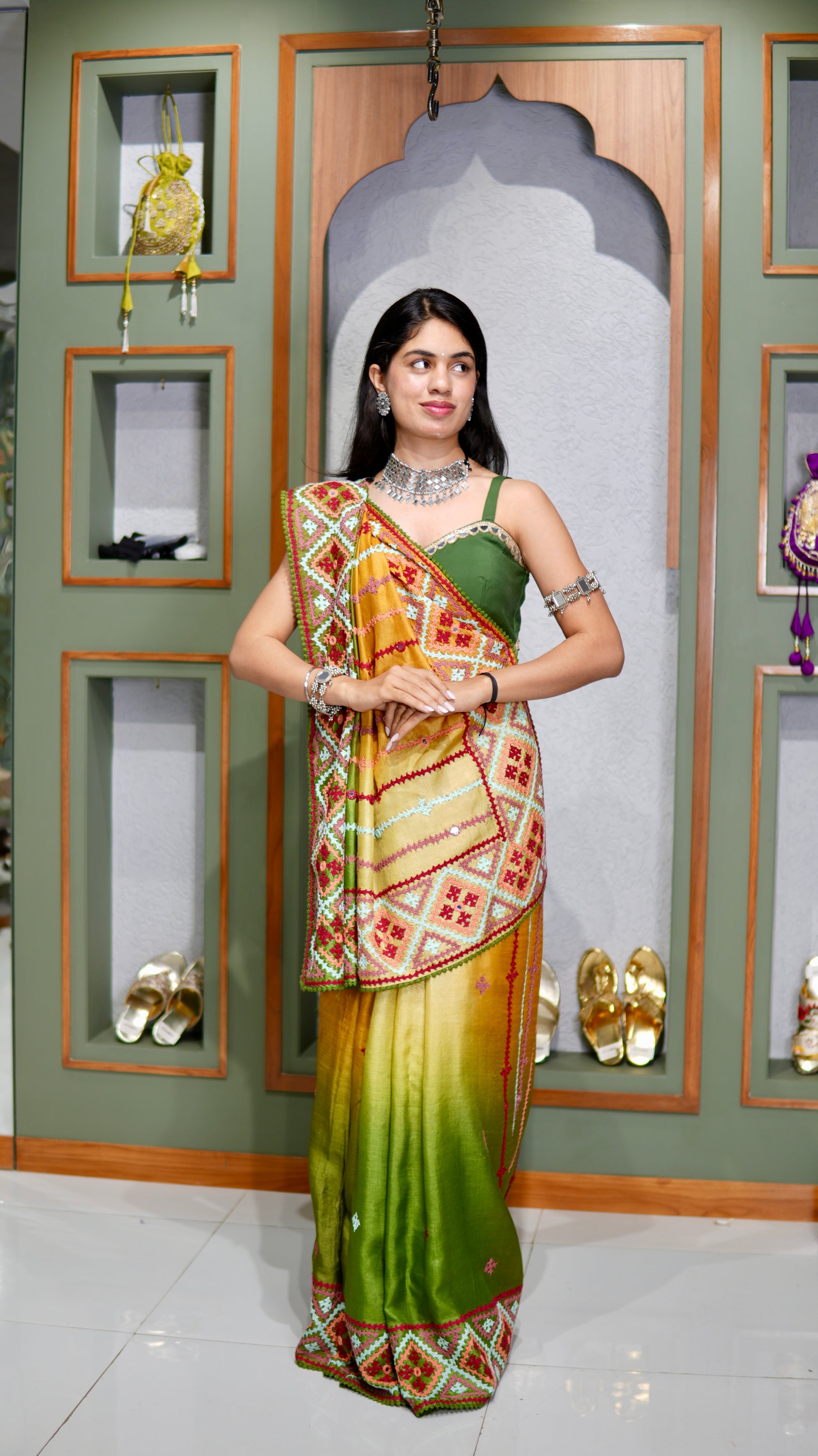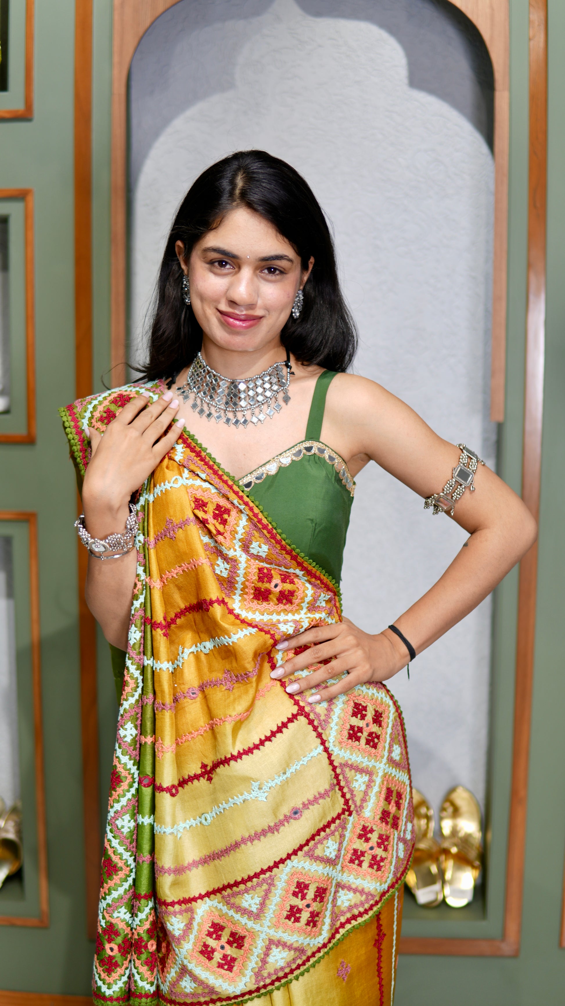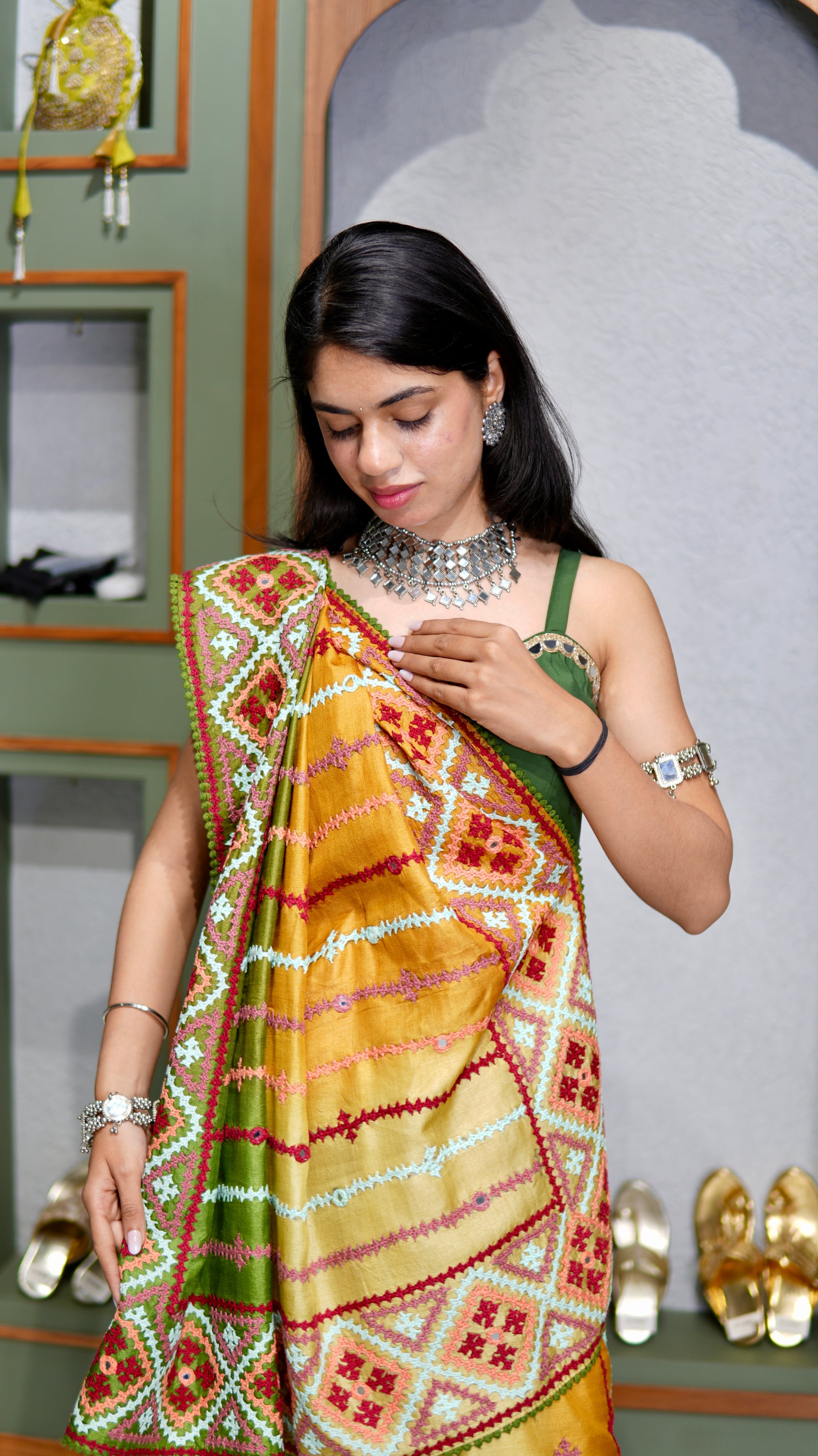 Kantha–Rabari fusion handwork on semi Tussar silk