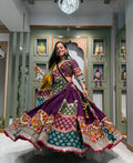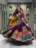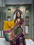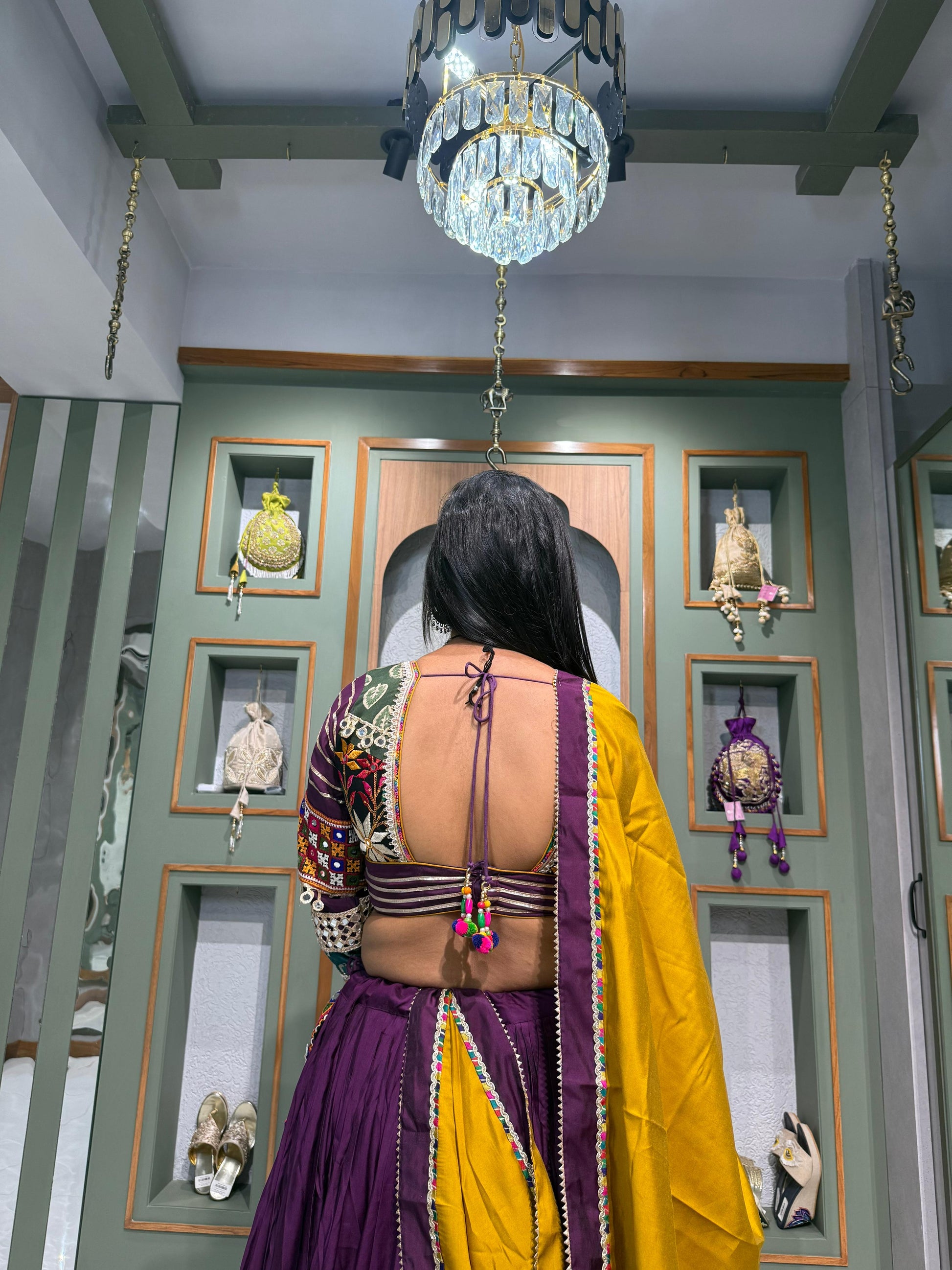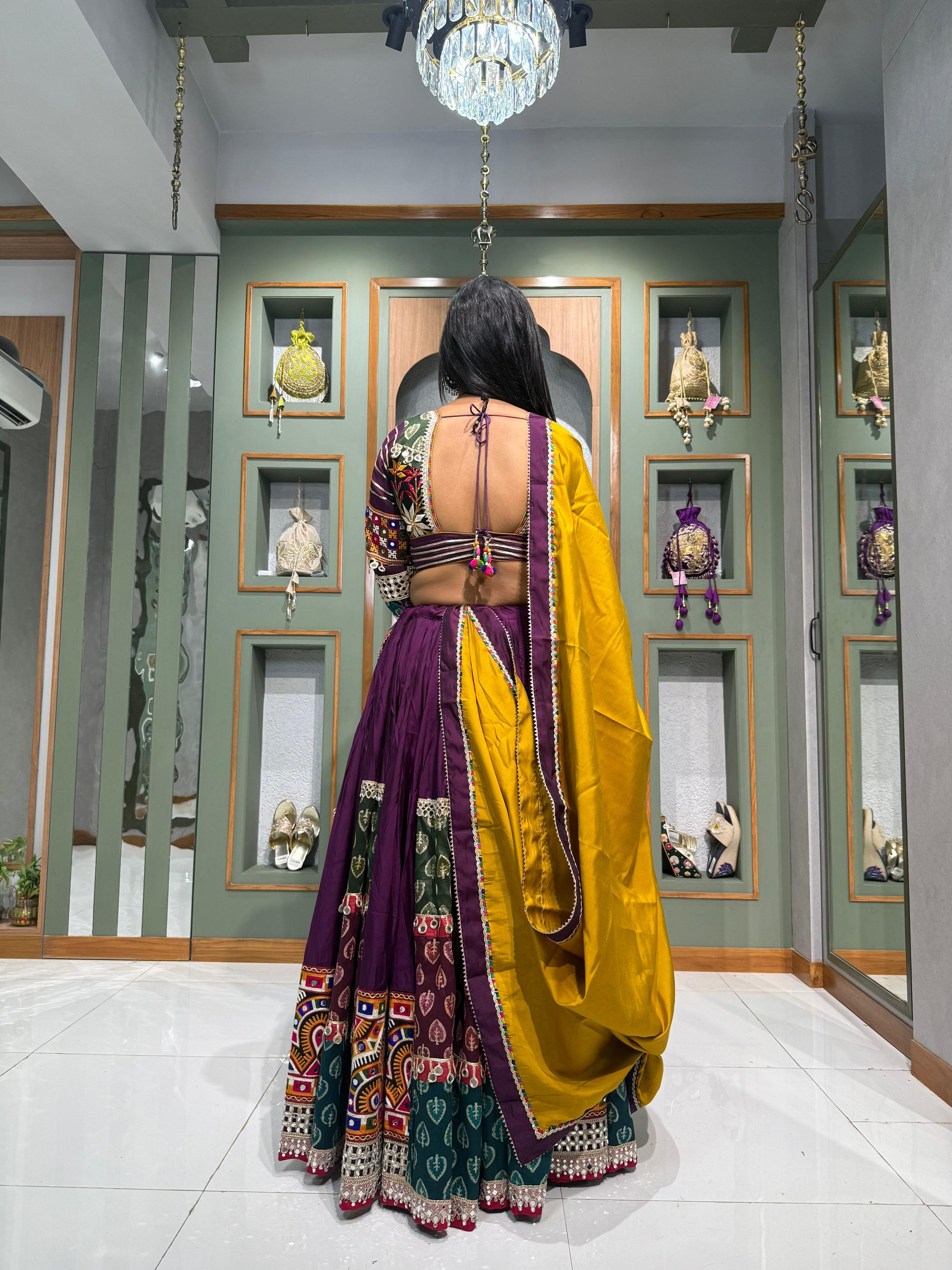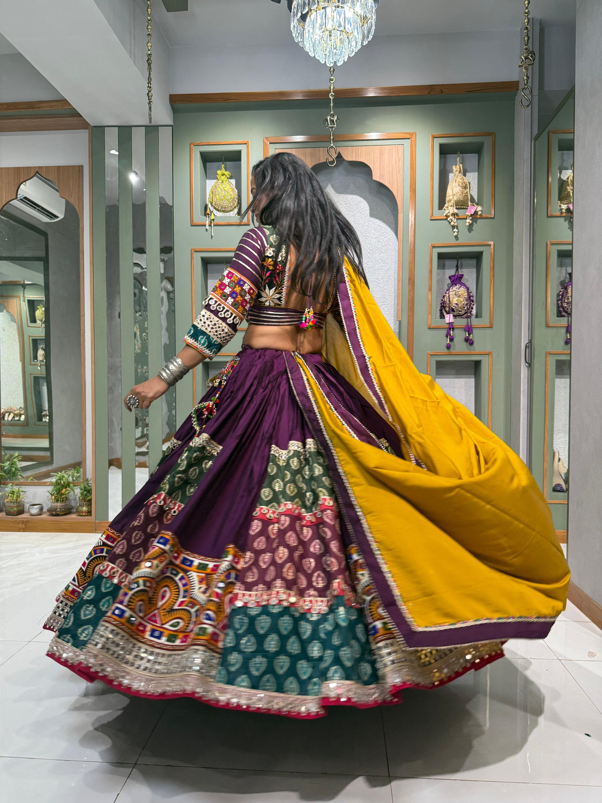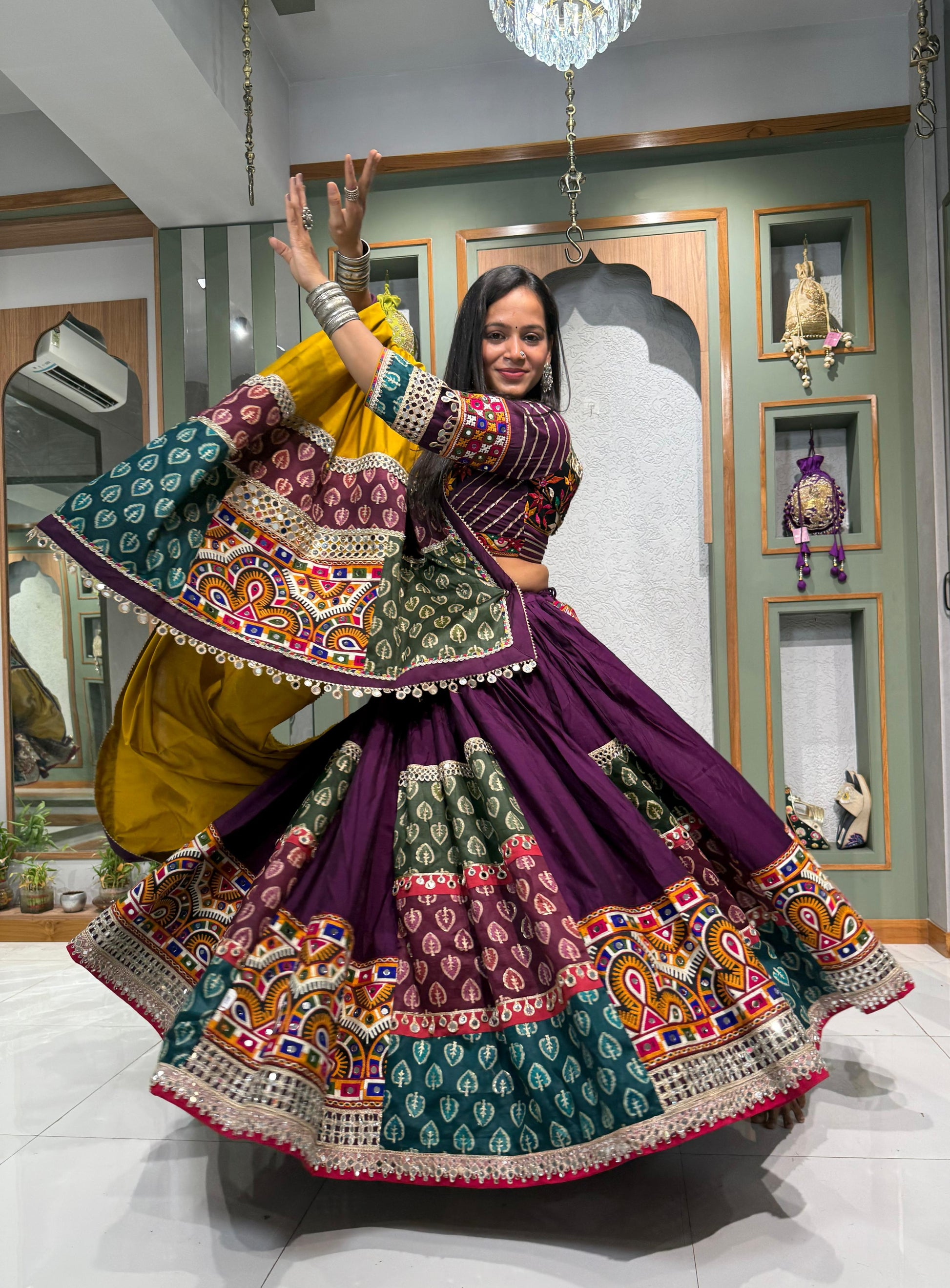 Step into the world of regal tradition with “Royal Heritage”, a statement chaniya choli from Kalpanascreations, Sindhubhavan. Designed in a rich wine and mustard palette, this ensemble showcases a stunning fusion of Ajrakh prints, Kutch mirror work, and fine hand embroidery on luxe Bombay silk. Every detail is meticulously crafted to celebrate heritage while embracing a bold, modern elegance.