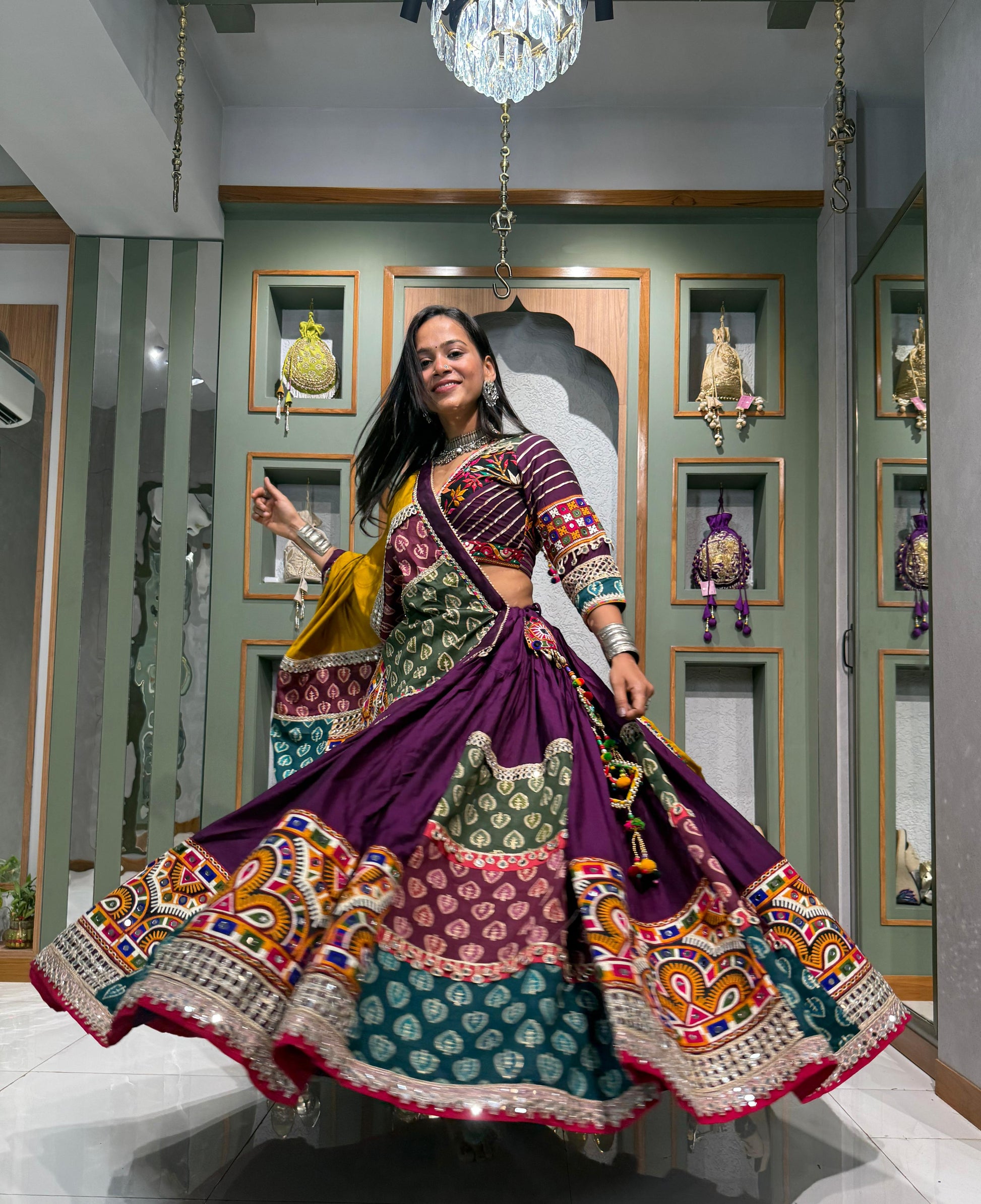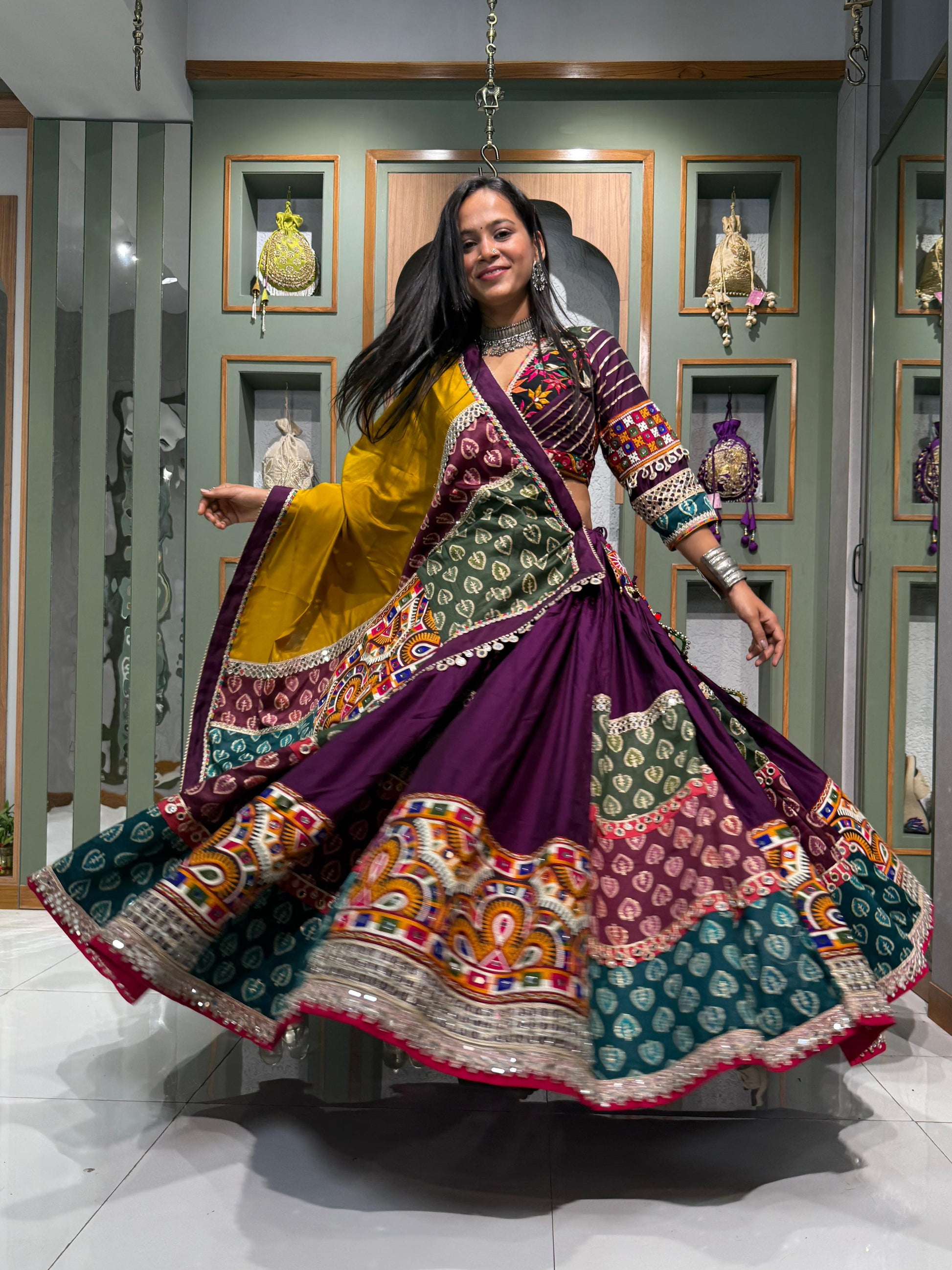 The Bombay silk chaniya boasts luxurious texture and depth, enhanced by intricate Ajrakh prints and traditional Kutch mirror work. Its lavish 16-meter flair ensures a show-stopping silhouette with every step, exuding unmatched festive grandeur.