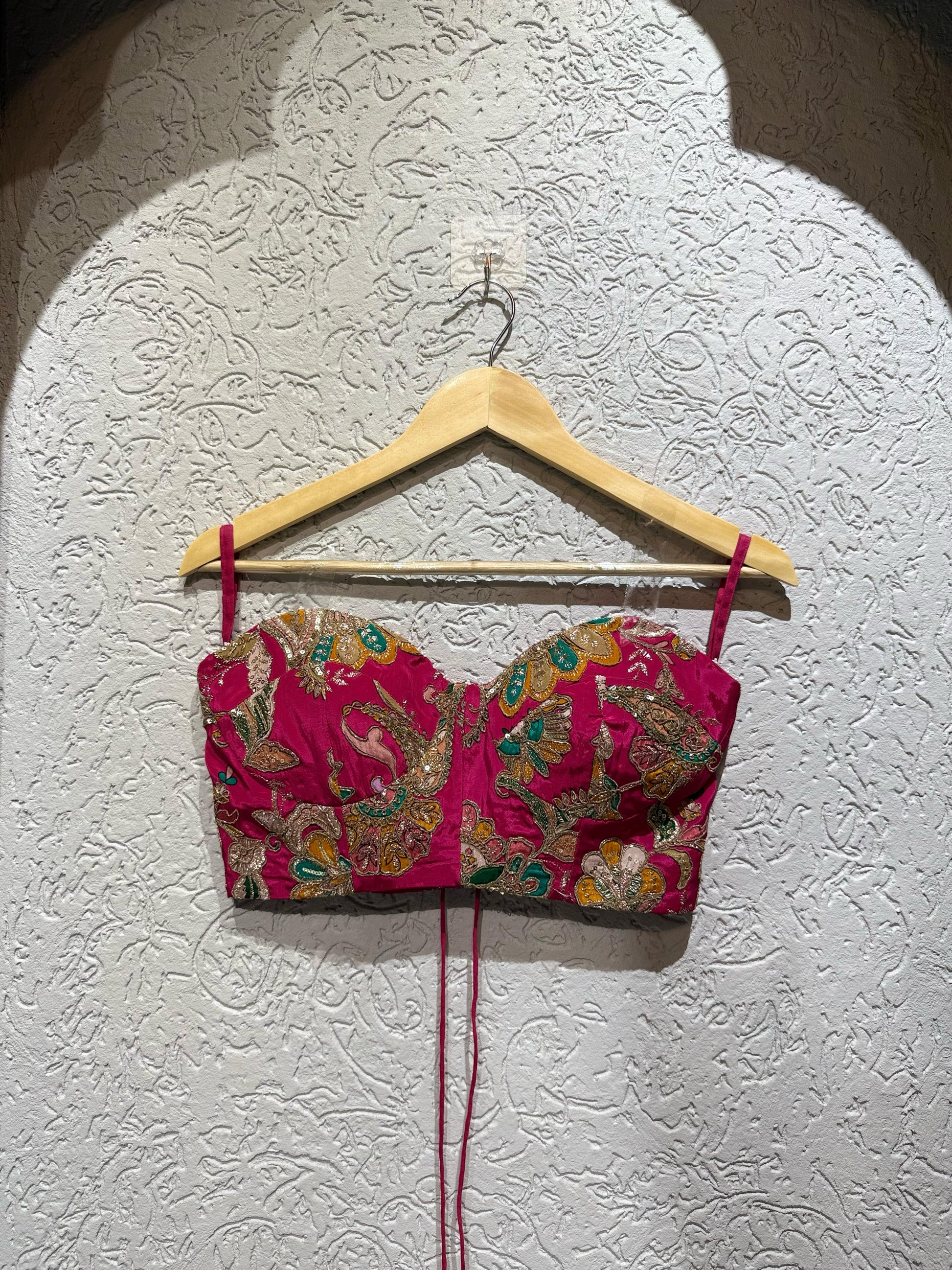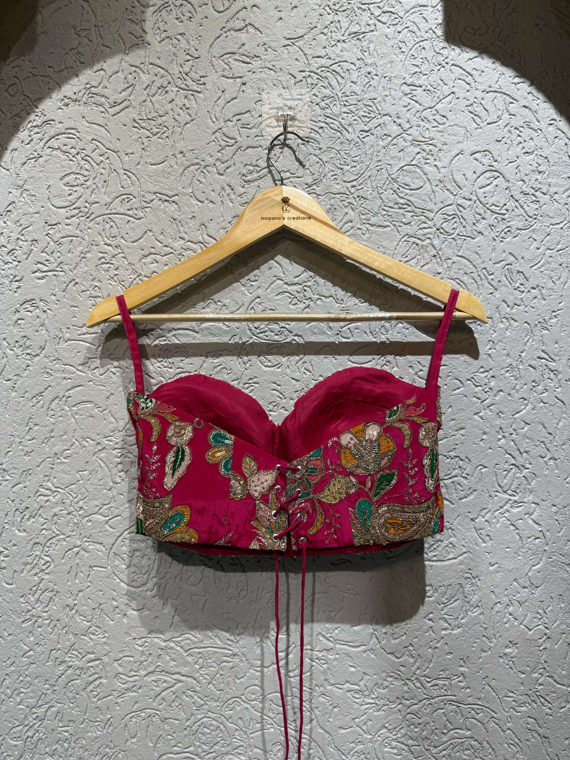 This dESIGNe corset blouse features a structured silhouette that flatters the waistline and enhances the overall form. Crafted with premium fabrics and detailed with delicate embellishments or stylish textures, the blouse offers both support and style. Its elegant neckline, fitted shape, and modern cuts make it perfect to pair with lehengas, sarees, or high-waisted skirts.