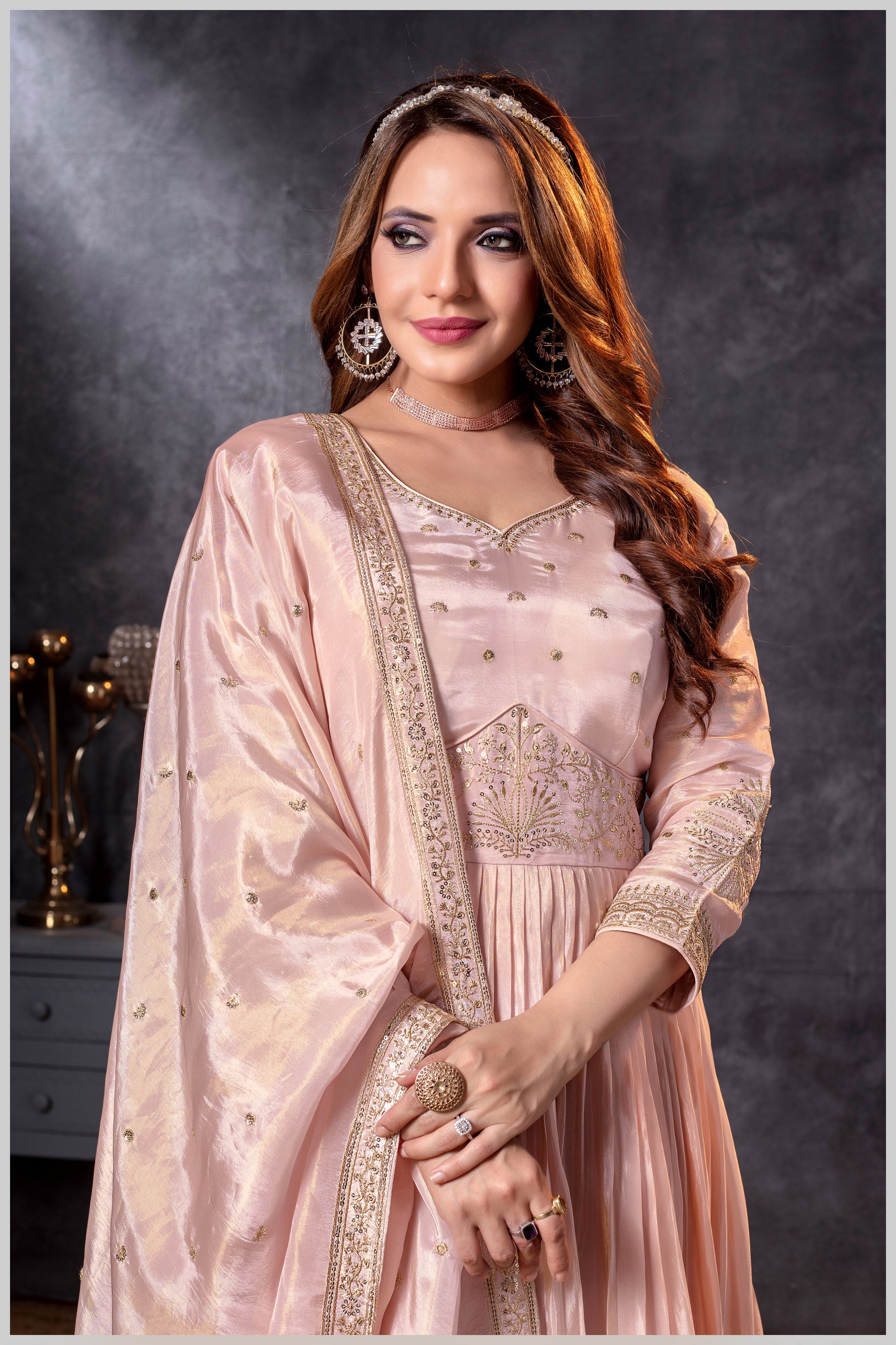 Crafted from luxurious pure tissue fabric, this outfit features a soft, luminous sheen and a graceful texture that instantly adds a regal touch. The fabric is beautifully enhanced with delicate fabric work, lending subtle richness and artisanal detailing while maintaining a clean, sophisticated aesthetic.