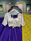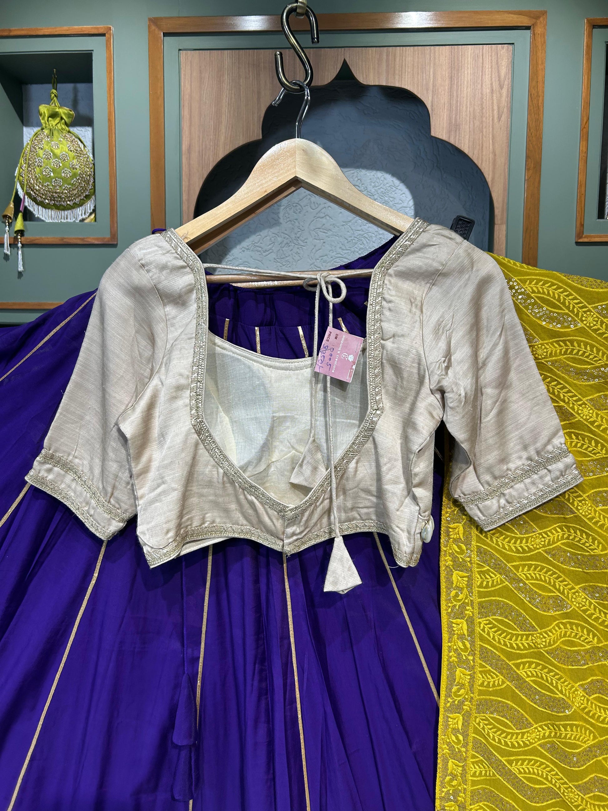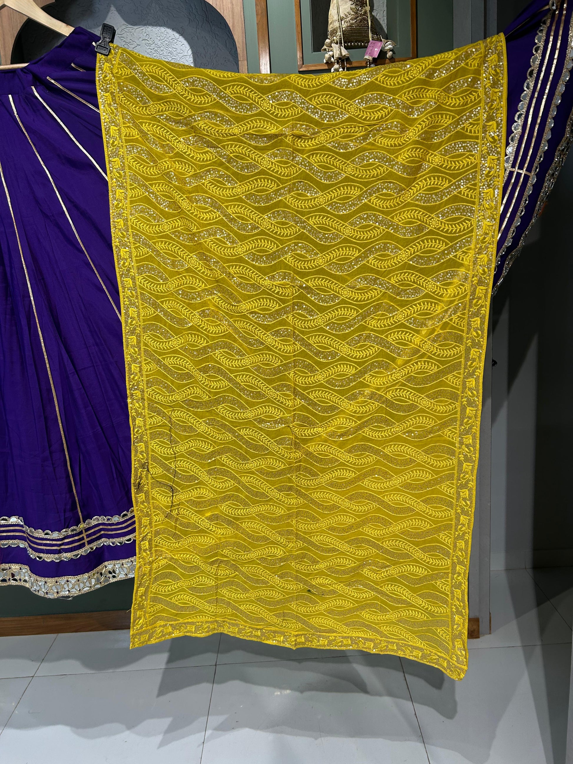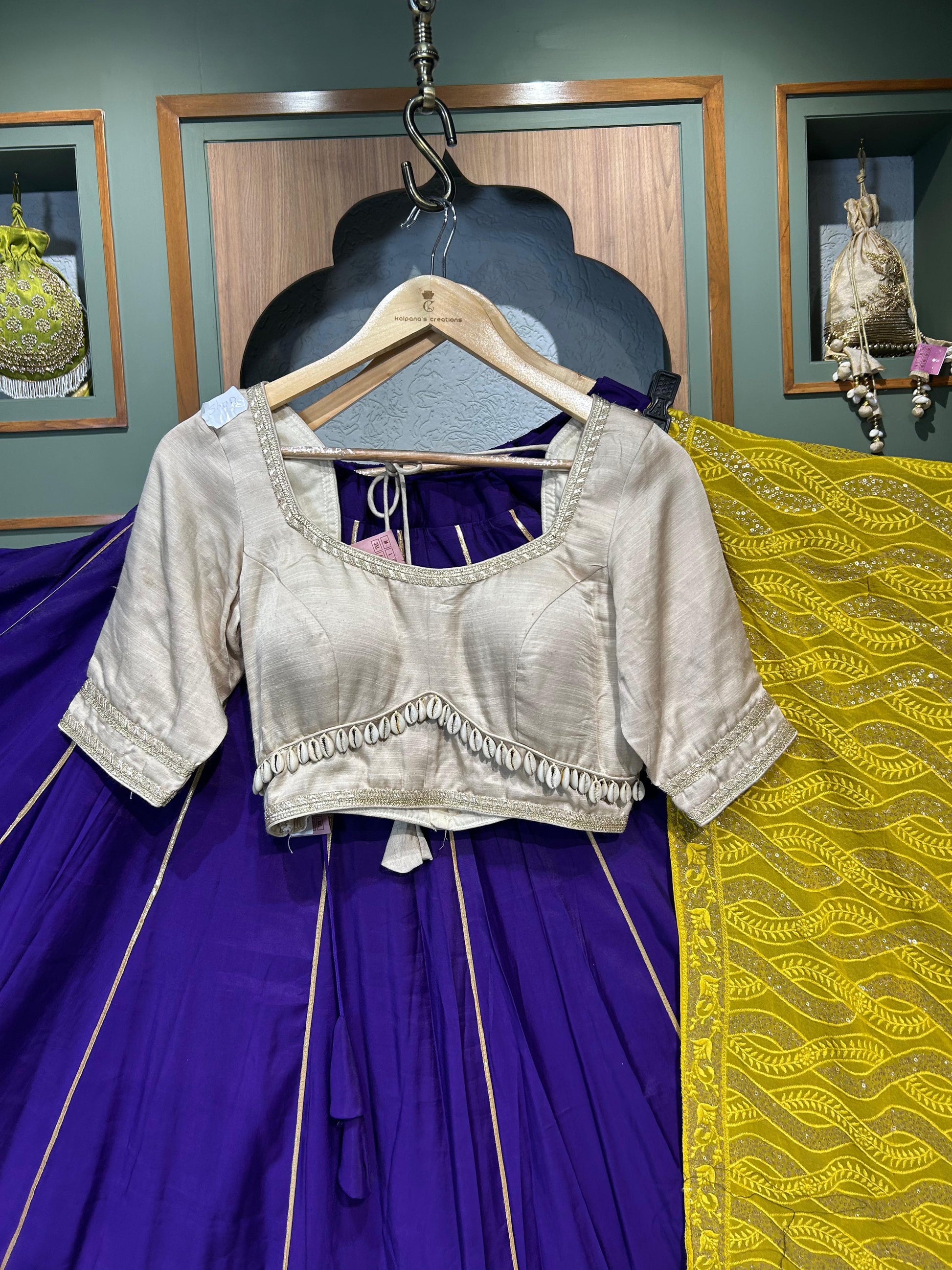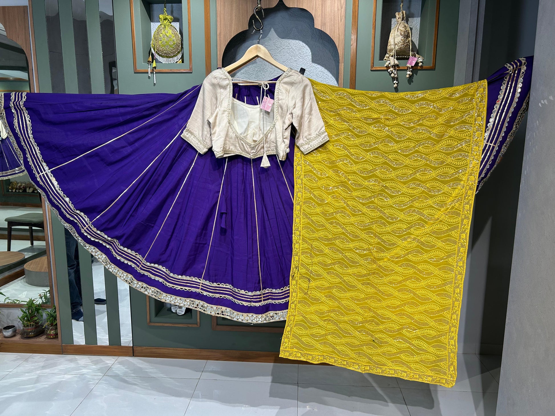 The vibrant royal purple mirror chaniya is made from rich fabric, adorned with delicate mirror detailing and layered border work. The standout feature is its 10 to 12 meter flair, giving the skirt dramatic volume and movement that’s perfect for dancing and celebration. -