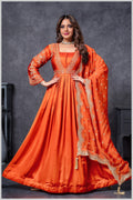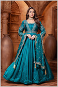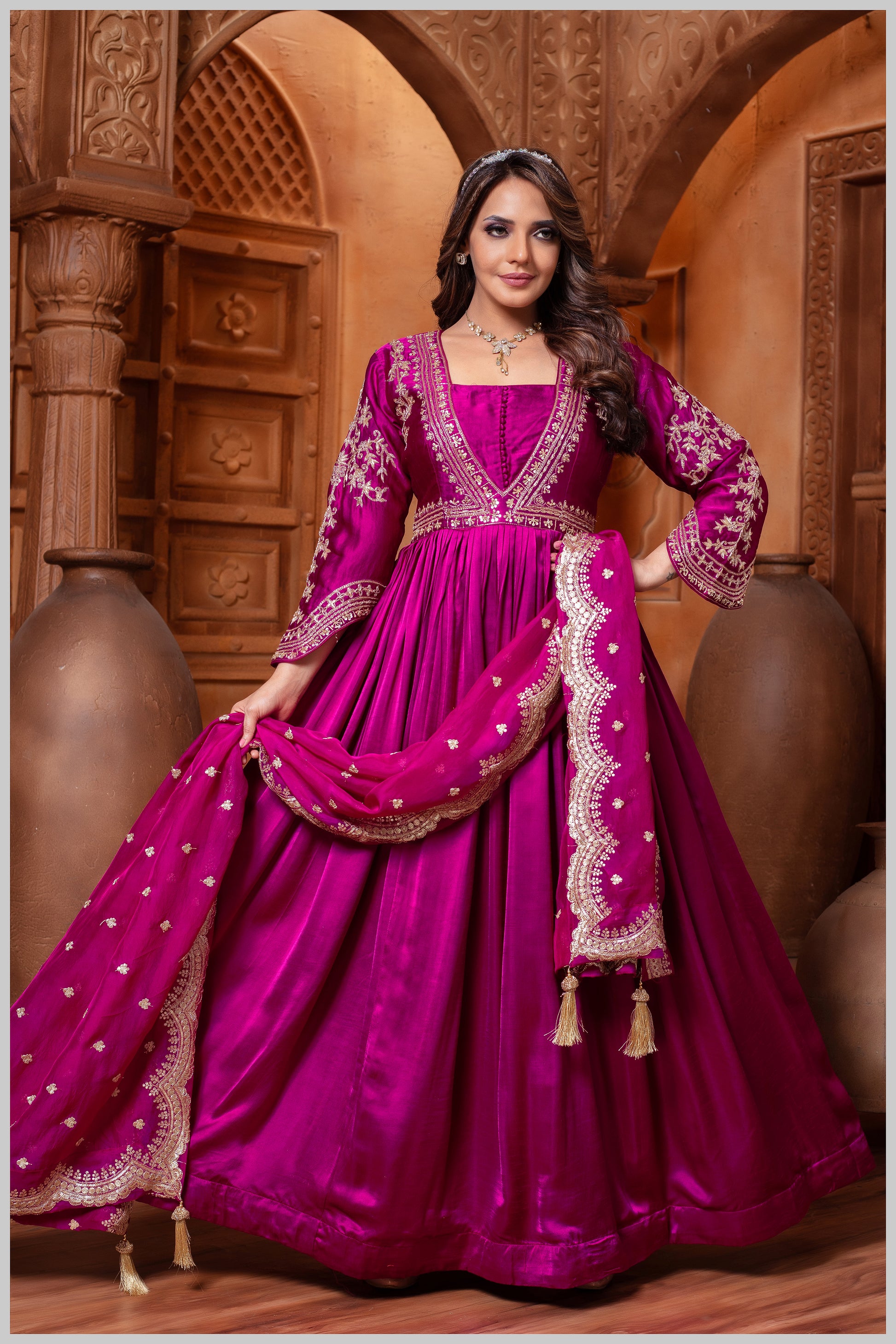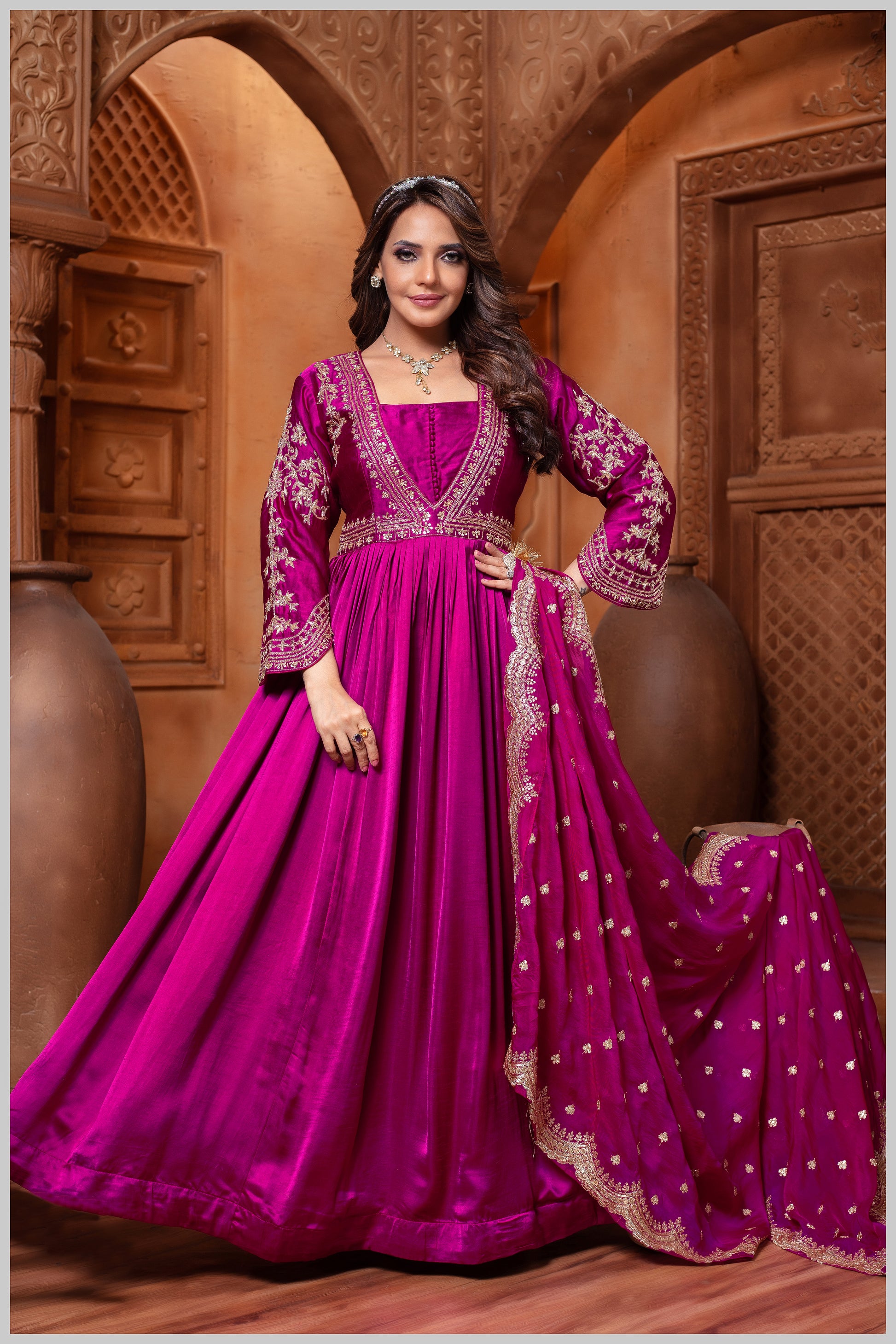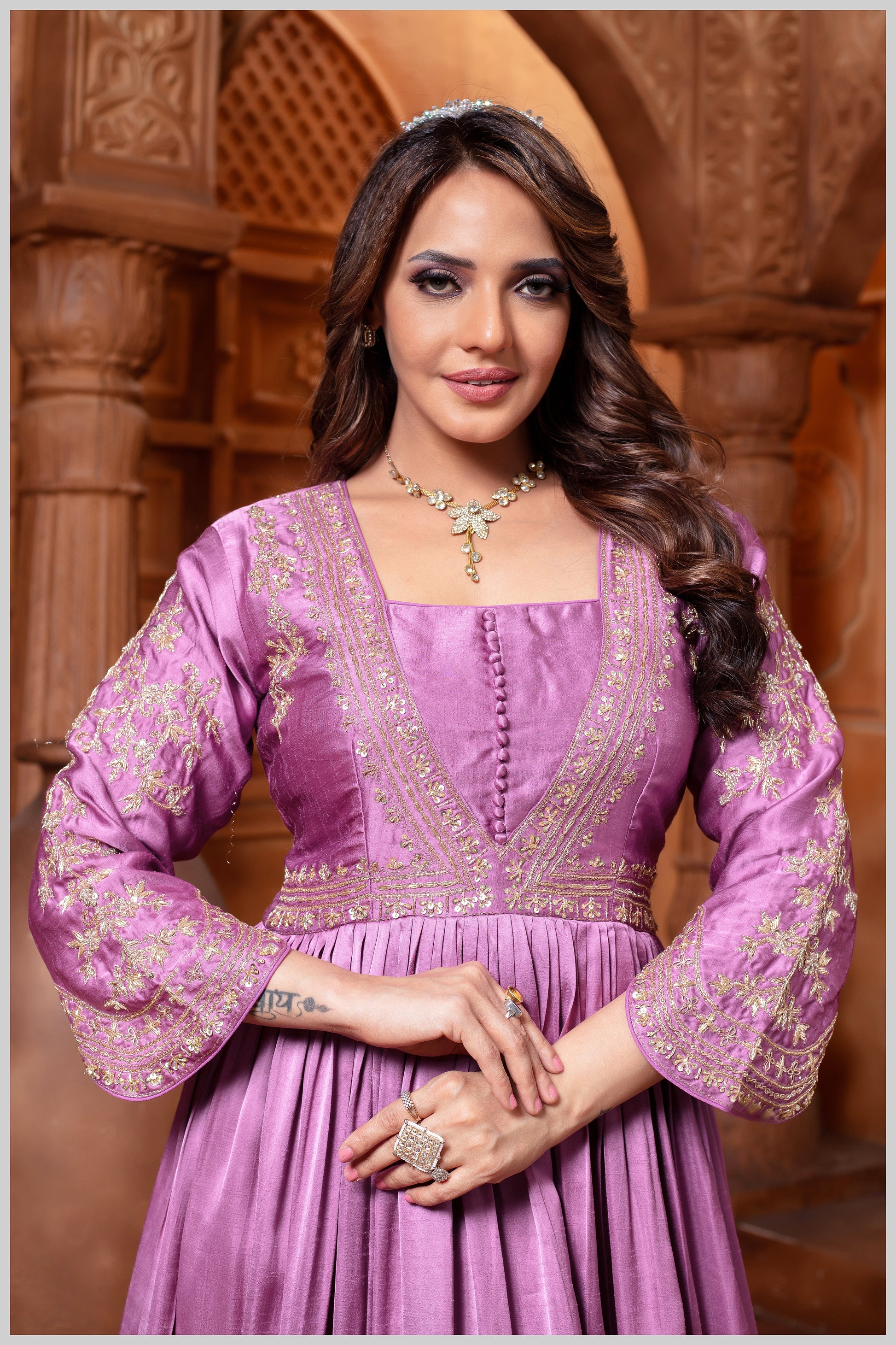 The design features full sleeves, adding a touch of sophistication and versatility. The full-sleeve silhouette lends a graceful, modest charm, making the outfit suitable for both daytime functions and evening gatherings.