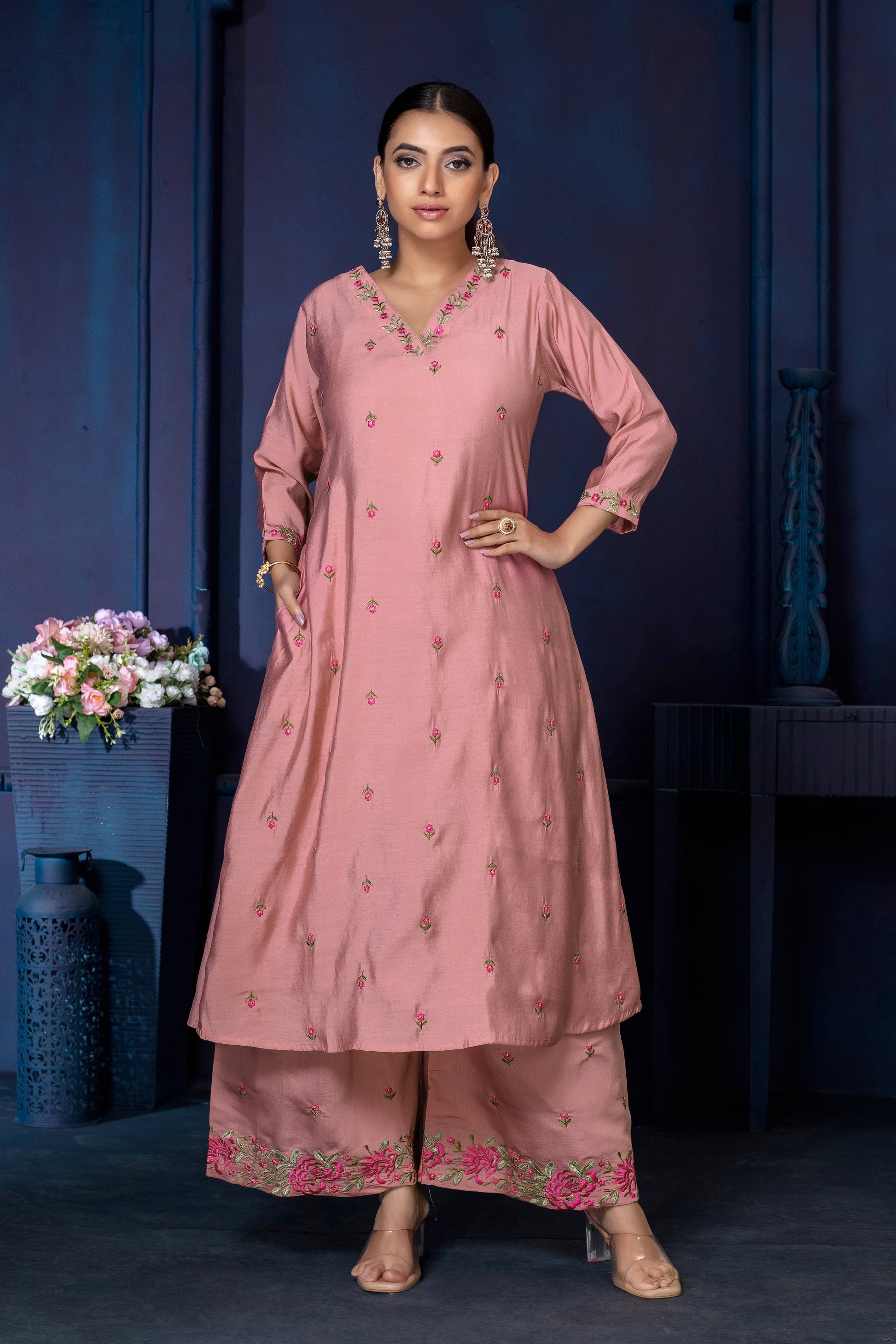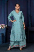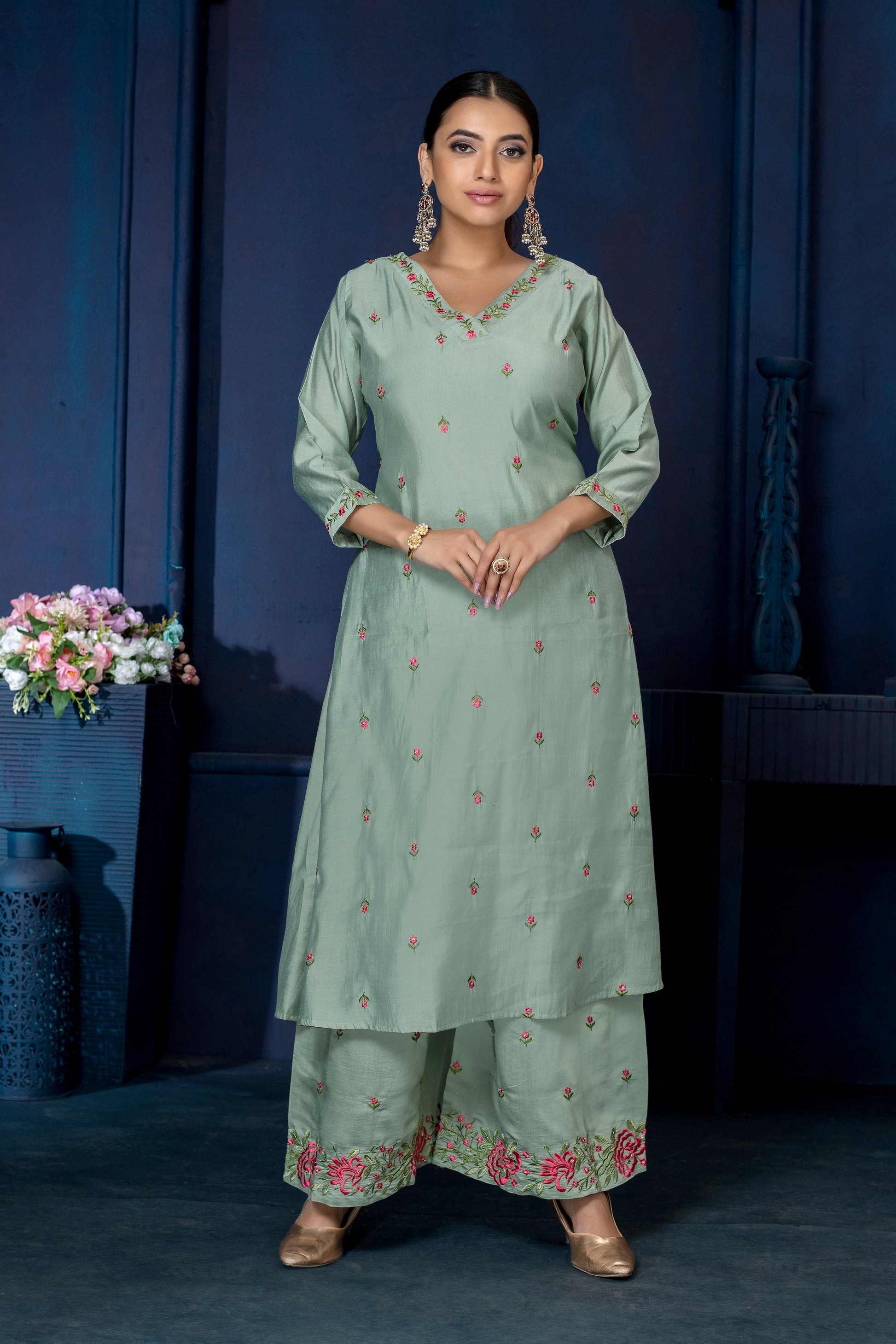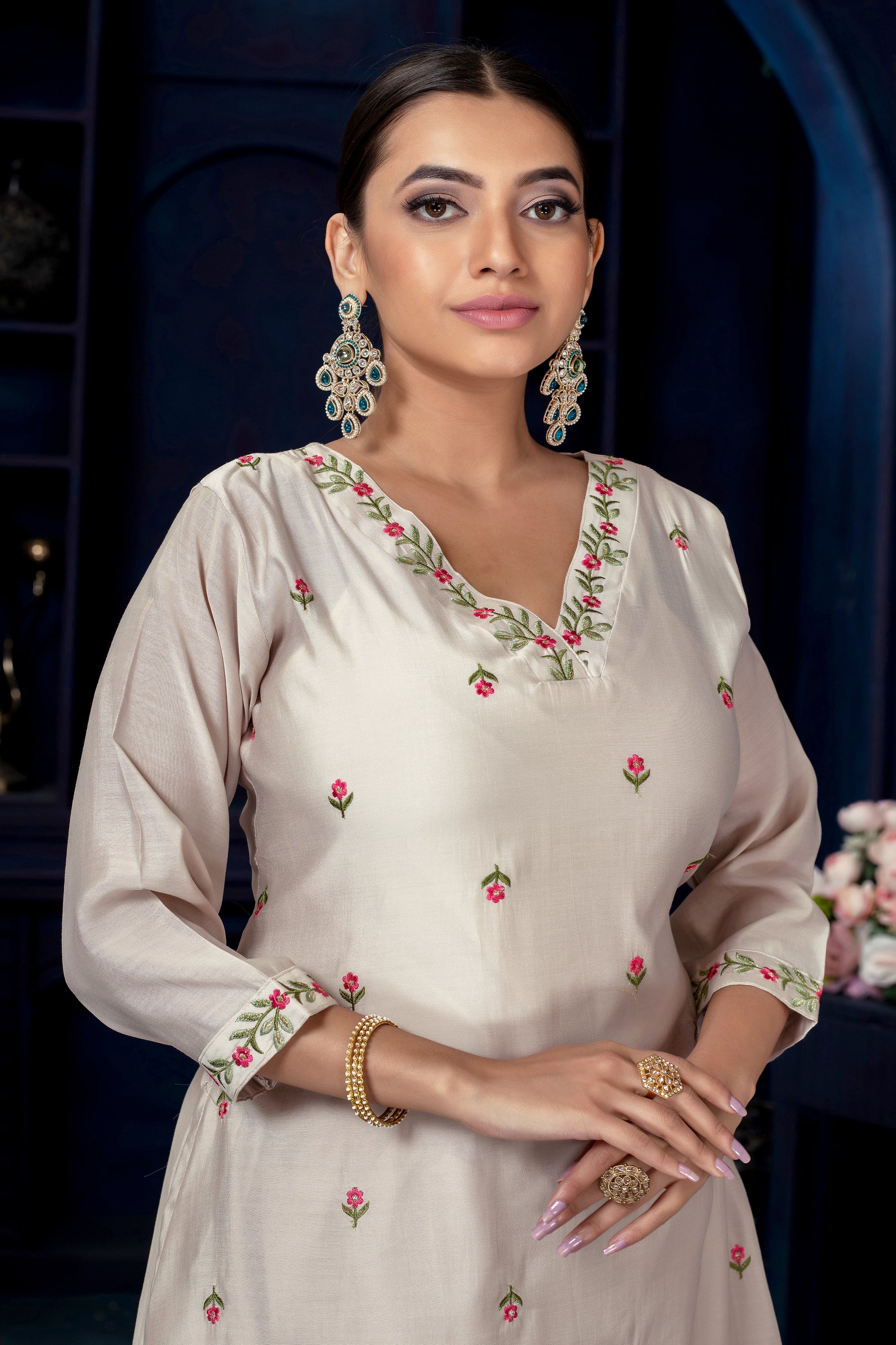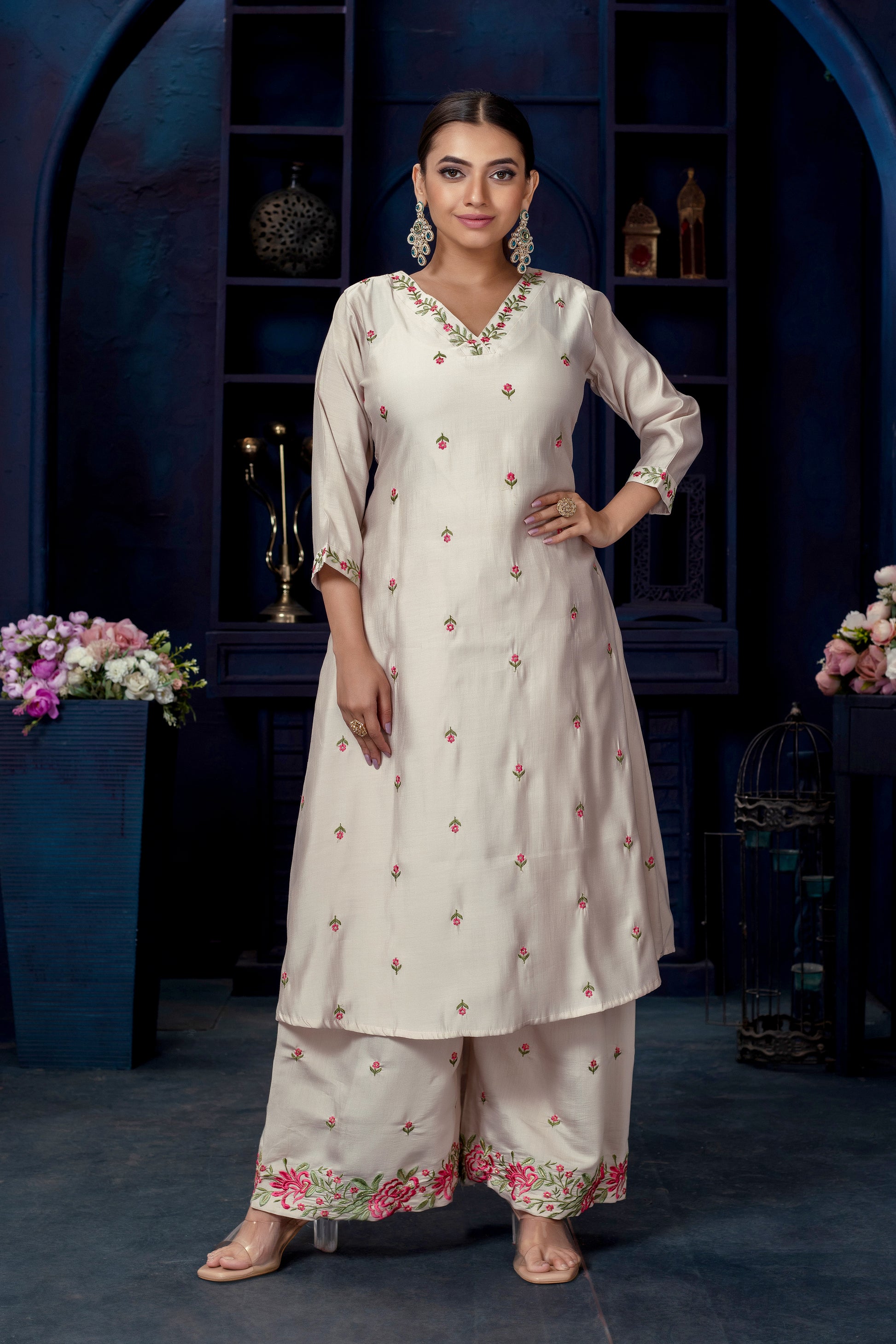 The ensemble is beautifully enhanced with intricate machine embroidery, adding subtle texture and refined detailing. The machine work is delicately placed to elevate the design while keeping the overall look clean, graceful, and easy to carry.