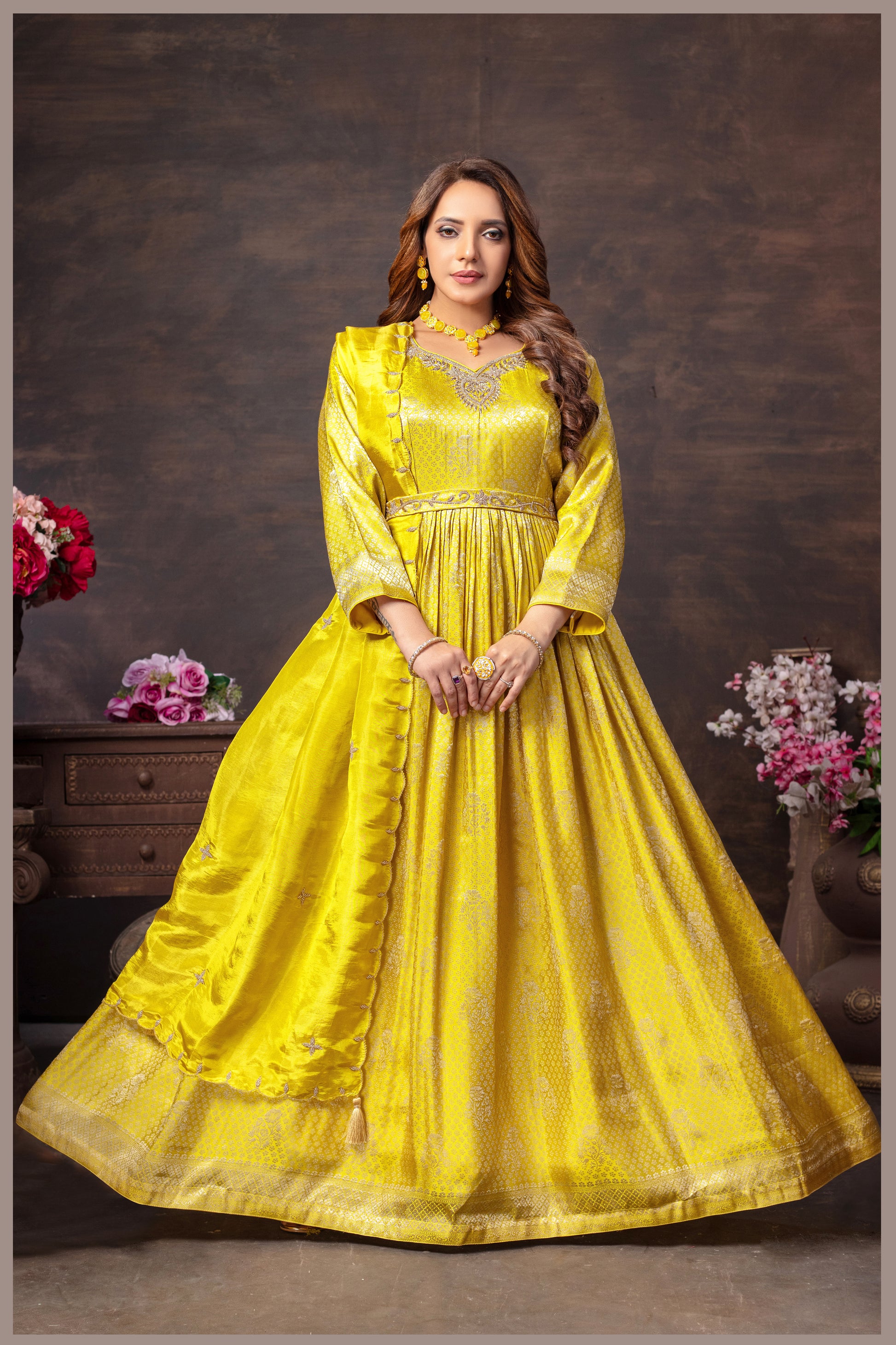 Specially designed to enhance your look at Haldi, Mehndi, Pithi ceremonies, and elegant pre-wedding functions, this ensemble embodies grace, tradition, and effortless sophistication.