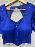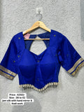 The blouse is tailored from luxurious Jam Silk, known for its smooth texture and regal sheen. Its structure provides an elegant silhouette, perfect for pairing with both traditional and fusion wear.