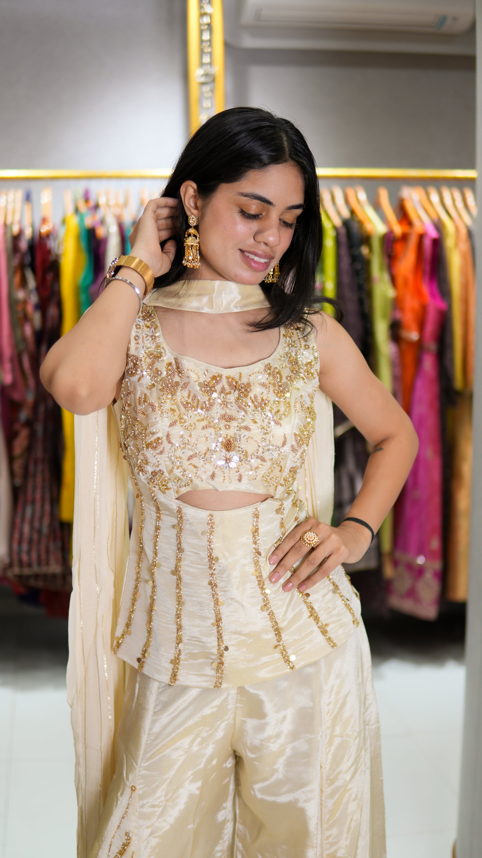 Crafted in luxurious pure tissue fabric, this Indo-Western outfit radiates sophistication and a regal glow. The fancy-cut short top is beautifully adorned with all-over abstract khatwork, adding artistic texture and a modern handcrafted appeal. Its structured yet stylish silhouette makes it a standout piece that instantly elevates the look.