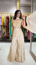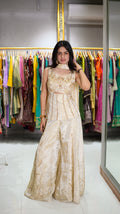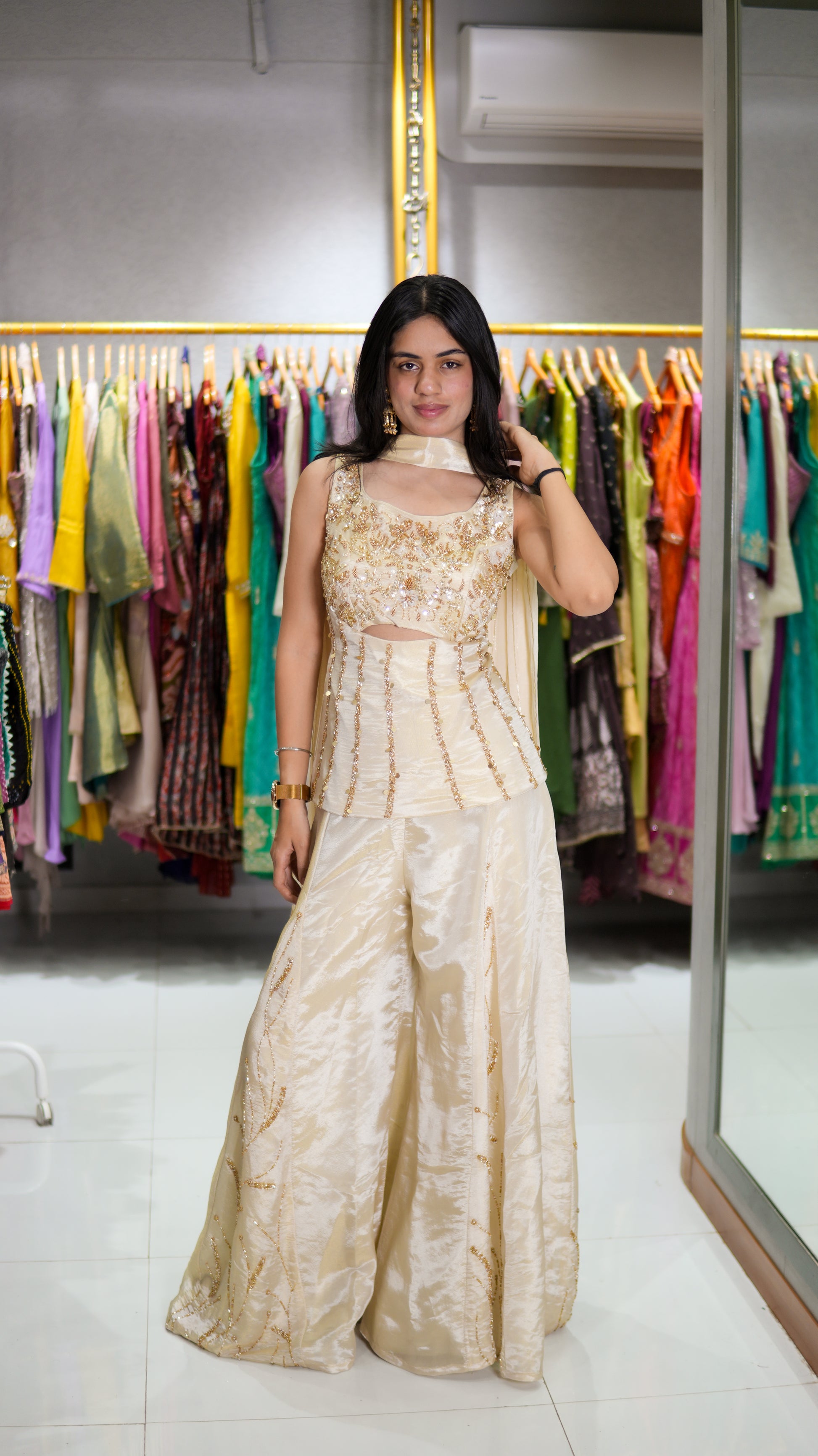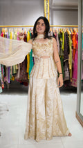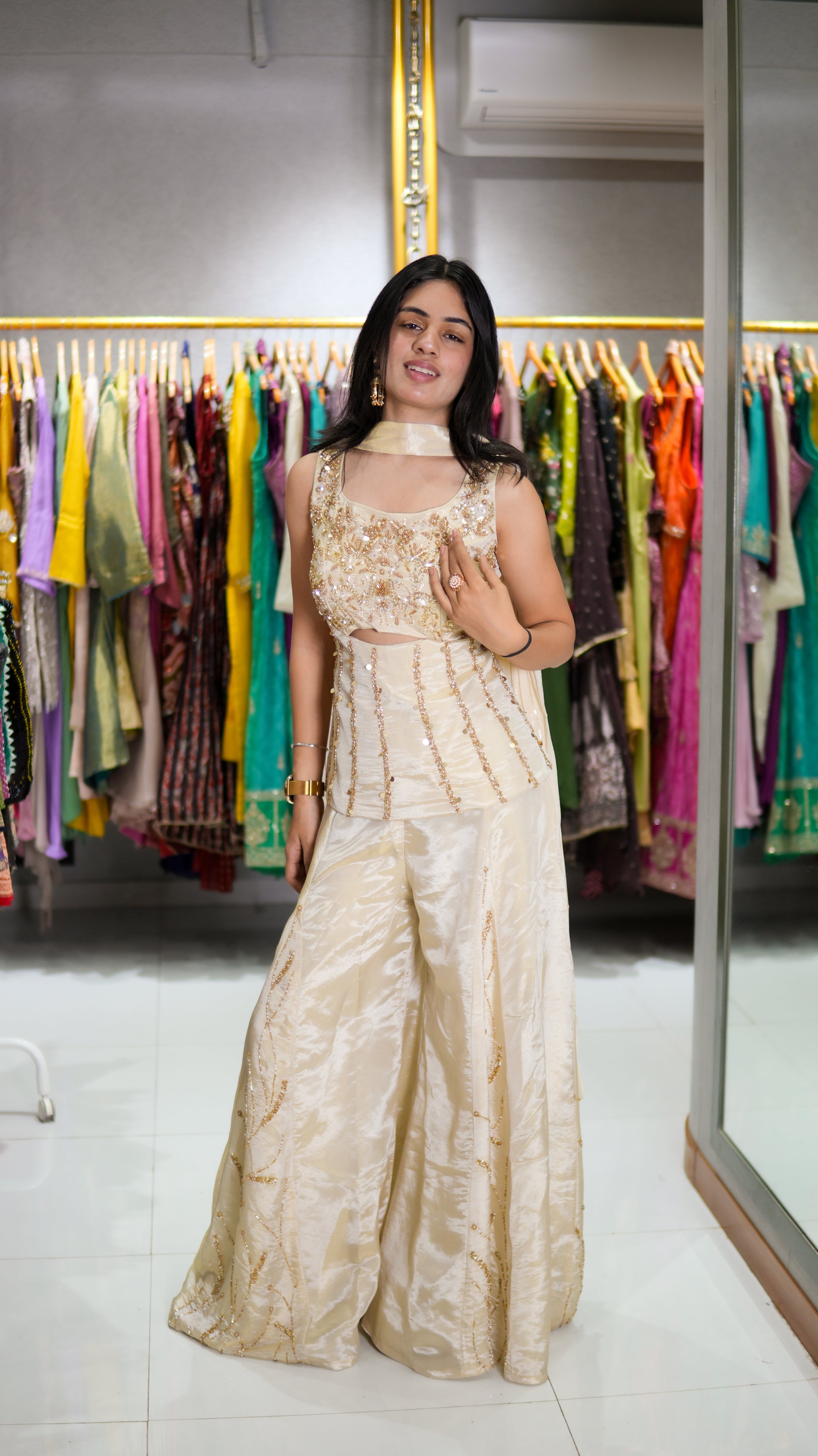 Paired with the top is an innovative bell-bottom palazzo concept, designed to make a bold fashion statement. The palazzo features heritage handwork and khatwork kalis, adding depth, movement, and a rich traditional essence to the contemporary silhouette. Completing the ensemble is a designer choker dupatta, lending a royal Indo-Western finish and tying the entire look together with elegance.